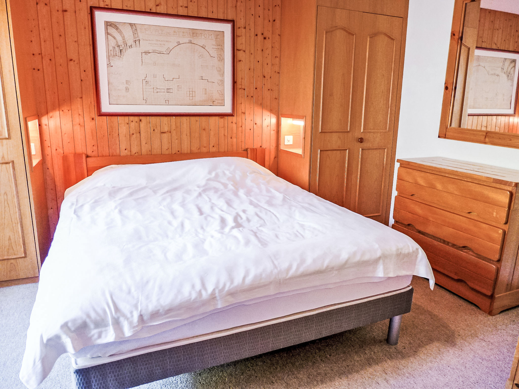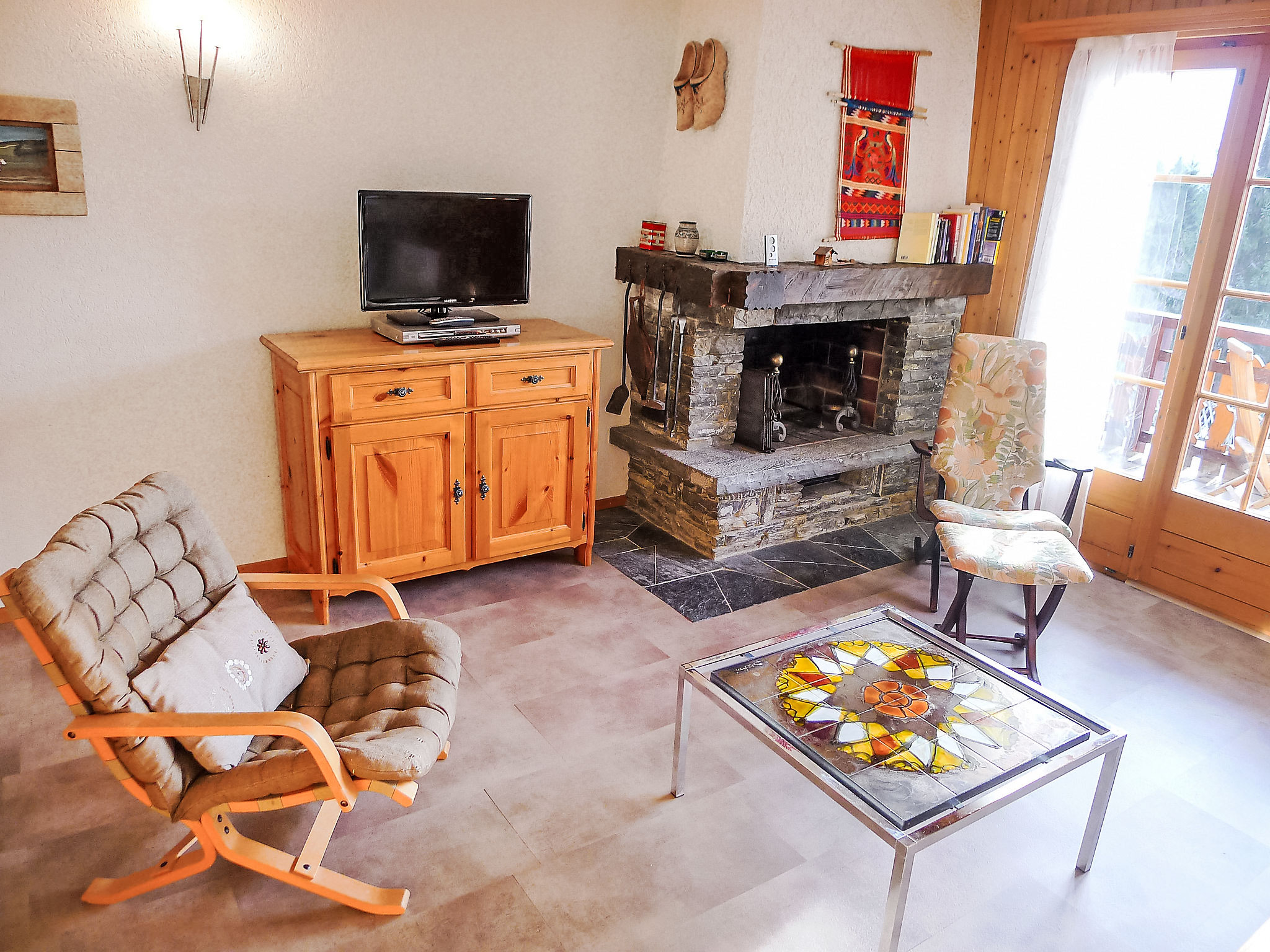 "Sapin Bleu 5", apt 2 pièces 47 m2 au 1er étage, situation sud. Aménagement fonctionnel et plaisant: séjour/salle à manger avec baie vitrée avec 2 lits gigognes (2 pers. 2 x 80 cm, longueur 190 cm), cheminée, table pour les repas et TV (écran plat), radio et DVD. Sortie sur le balcon. 1 chambre avec 1 grand-lit (160 cm, longueur 200 cm). Sortie sur le balcon. Cuisine ouverte (four, lave-vaisselle, grille-pain, bouilloire électrique, micro-ondes, cafetière électrique, appareil à raclette, service à fondue (fondue au fromage)). Bain/WC. Grand balcon 25 m2, situation sud et situation ouest. Meubles de terrasse. Très belle vue panoramique sur les montagnes. A disposition: sèche-cheveux. Internet (Connexion WIFI, gratuit). Maximum 1 animal/ chien autorisé.