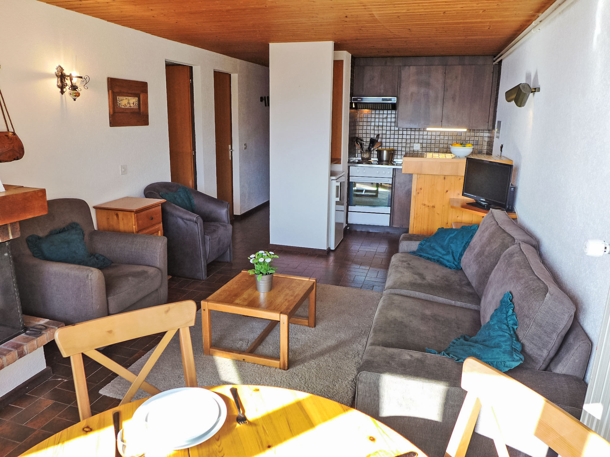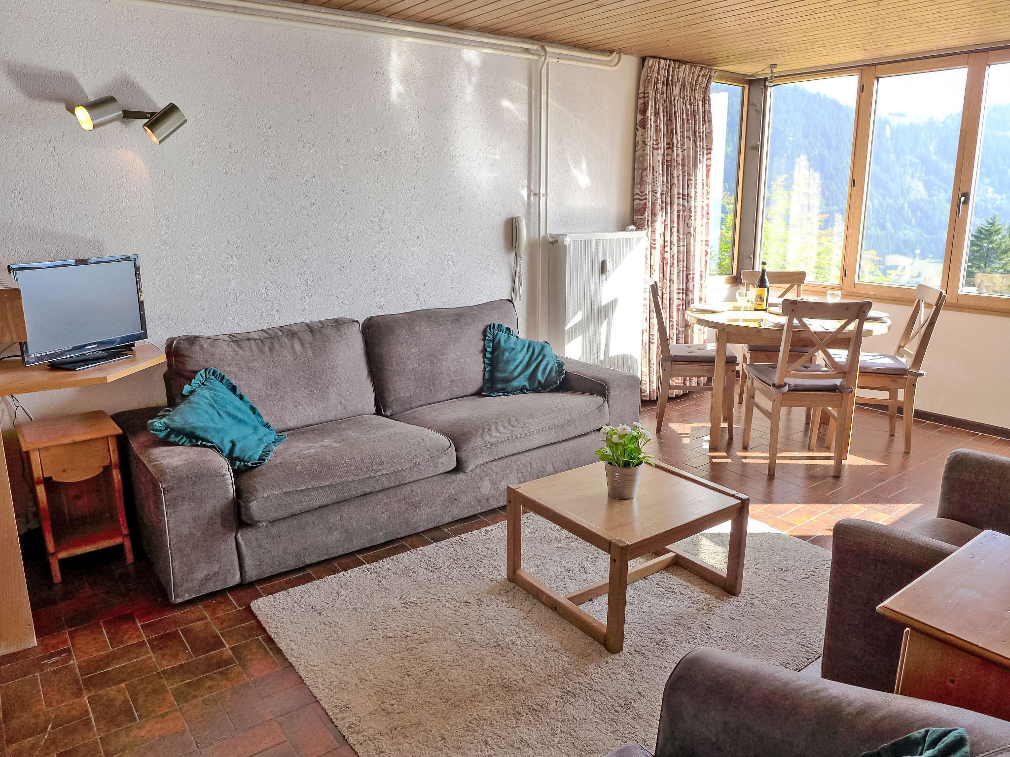 "La Vire D'Aufalle 14 Inférieur", apt 3 pièces 45 m2, au rez-de-chaussée. Aménagement fonctionnel: séjour/salle à manger avec cheminée et TV (écran plat), DVD. Sortie sur la terrasse. 2 chambres, chaque chambre avec: 2 lits. Petite cuisine ouverte (3 plaques de cuisson, four, grille-pain, bouilloire électrique, cafetière électrique, appareil à raclette, service à fondue (fondue au fromage)). Bain/WC. Terrasse, situation sud. Meubles de terrasse. Vue sur les montagnes et les alentours. A disposition: Internet (Connexion WIFI, gratuit). Place de parking No 14I (couvert) à 100 m, hauteur 200 cm, largeur 237 cm.