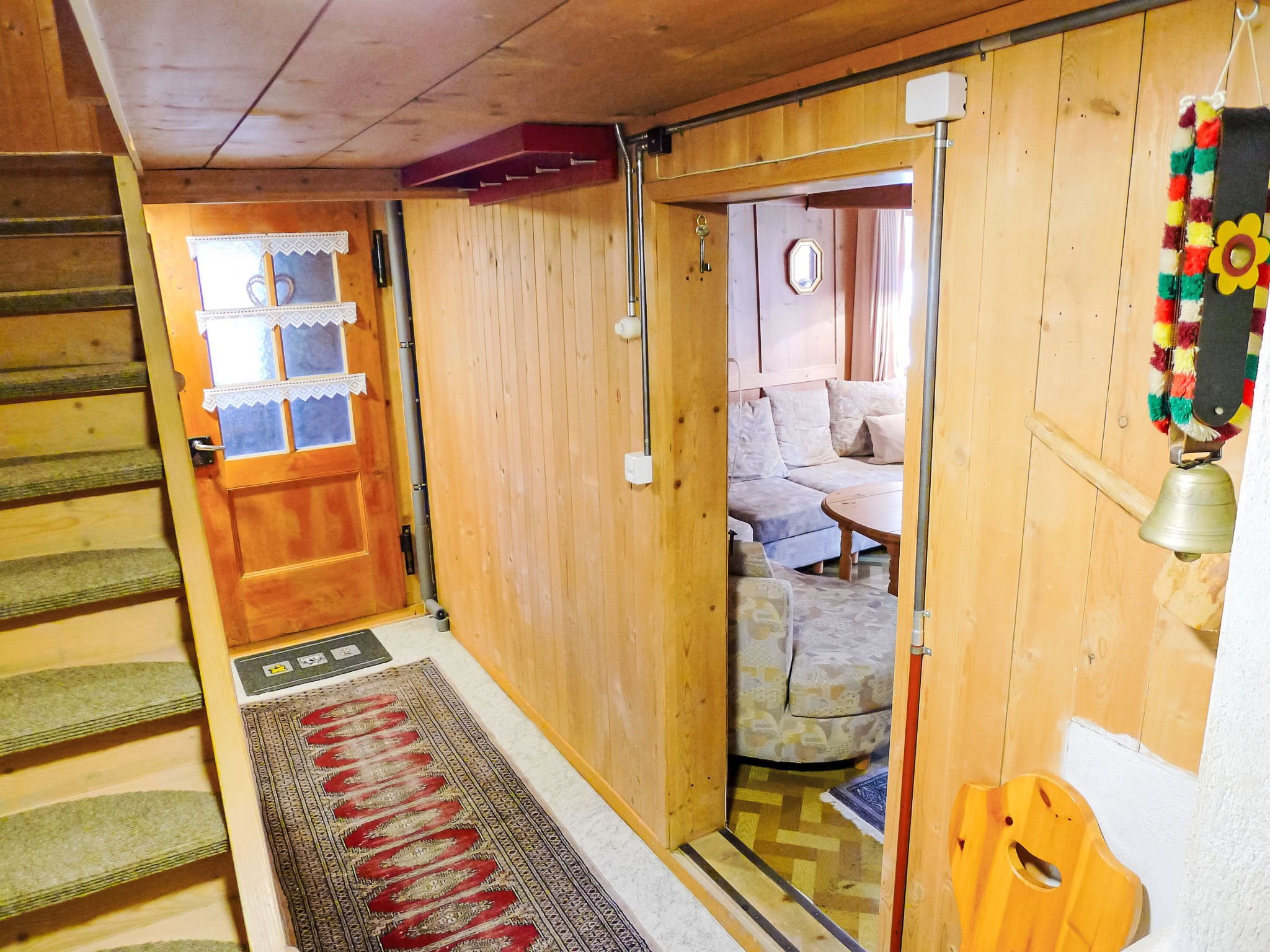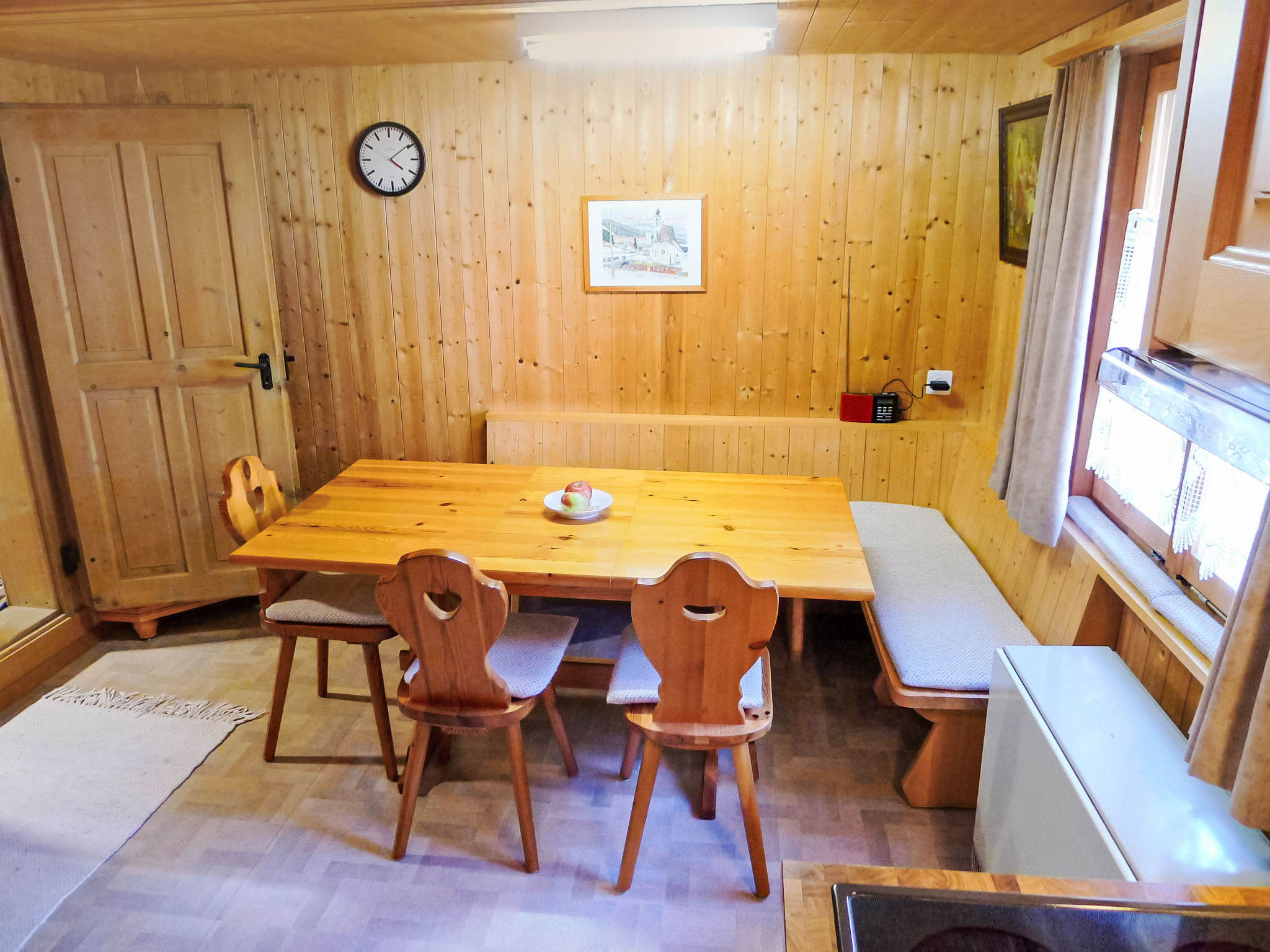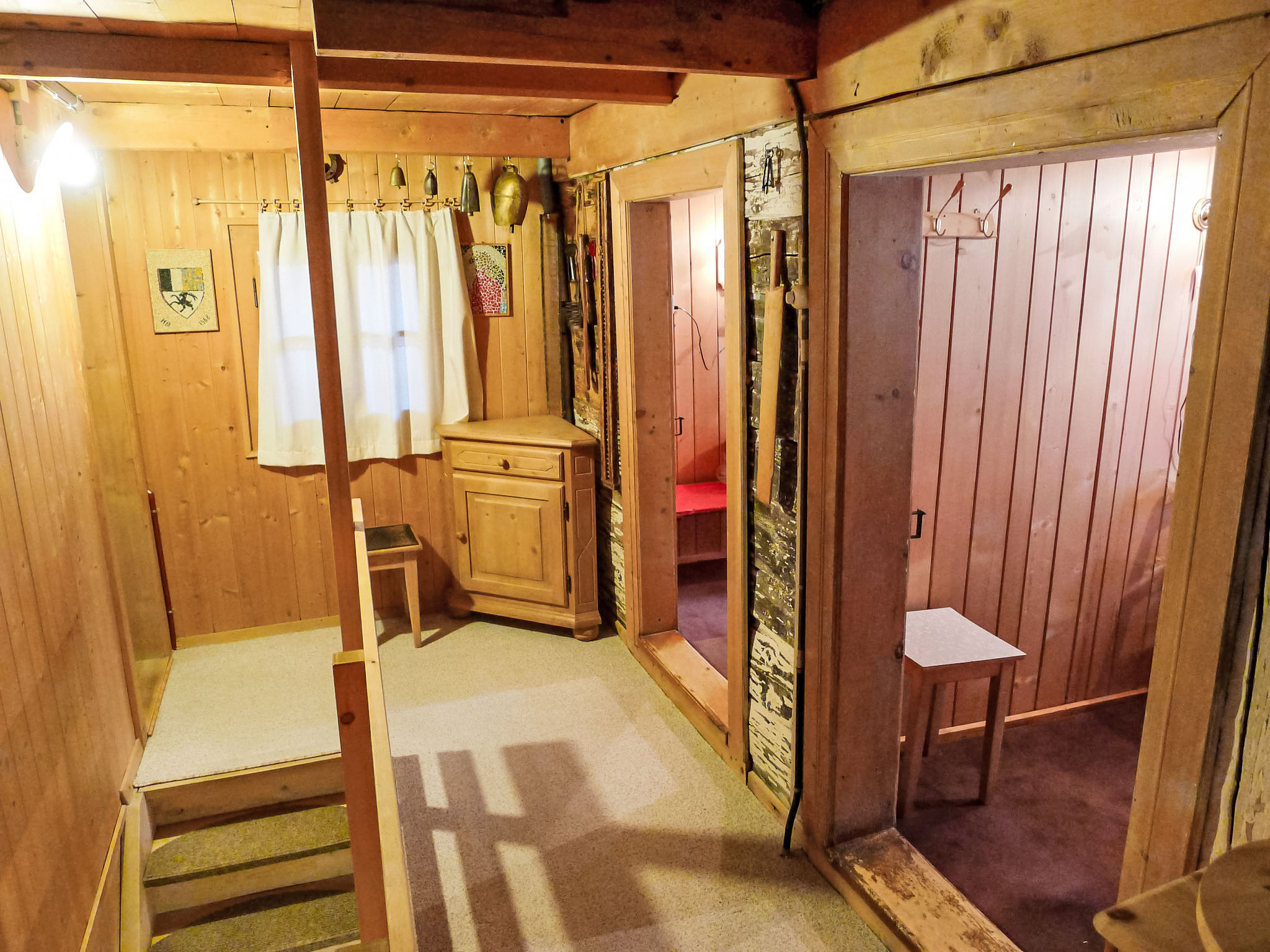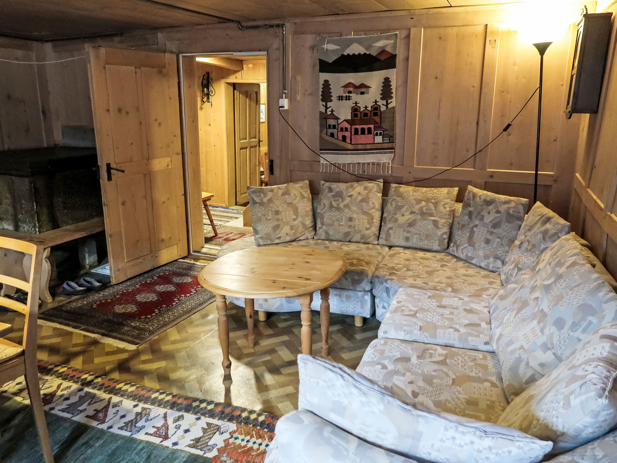 "Crestatgiet", apt 4 pièces 79 m2 sur 2 niveaux. Aménagement simple et rustique: séjour/salle à manger hauteur plafond 170 - 190 cm, Portes basses hauteur 165 cm avec poele de faience. Cuisine (four, 4 plaques vitrocéramiques, cafetière électrique) avec table pour les repas. WC séparé. Chauffe eau (300 litres). À l'étage supérieur: 3 chambres, chaque chambre avec: 2 lits. Douche/WC. Chauffage électrique, Poêle-cheminée en stéatite. Sol en bois. Vue partielle sur les montagnes et les alentours. Veuillez noter: logement non-fumeur.