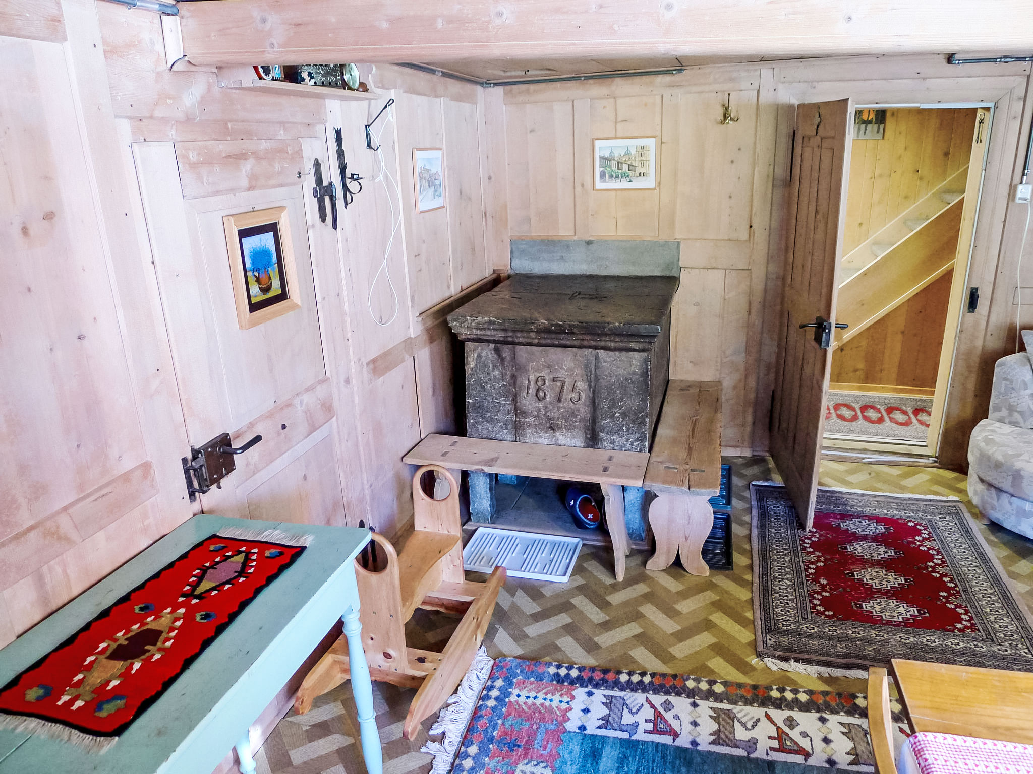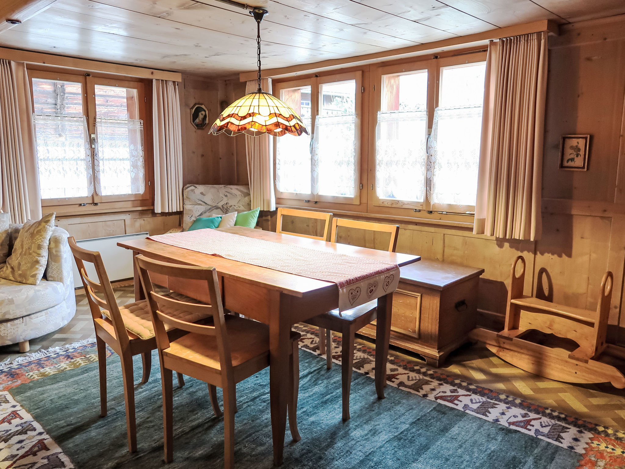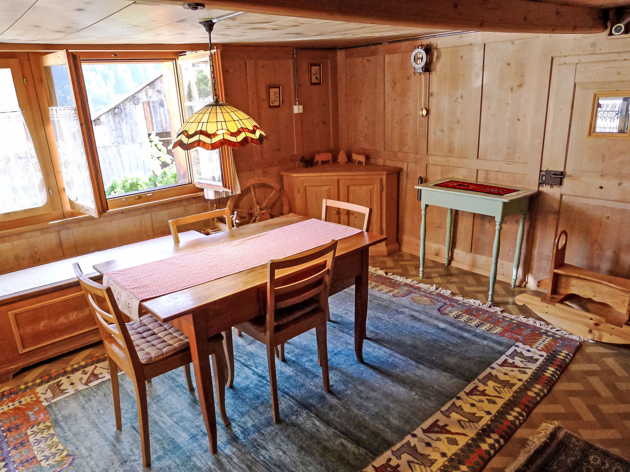 "Crestatgiet", apt 4 pièces 79 m2 sur 2 niveaux. Aménagement simple et rustique: séjour/salle à manger hauteur plafond 170 - 190 cm, Portes basses hauteur 165 cm avec poele de faience. Cuisine (four, 4 plaques vitrocéramiques, cafetière électrique) avec table pour les repas. WC séparé. Chauffe eau (300 litres). À l'étage supérieur: 3 chambres, chaque chambre avec: 2 lits. Douche/WC. Chauffage électrique, Poêle-cheminée en stéatite. Sol en bois. Vue partielle sur les montagnes et les alentours. Veuillez noter: logement non-fumeur.