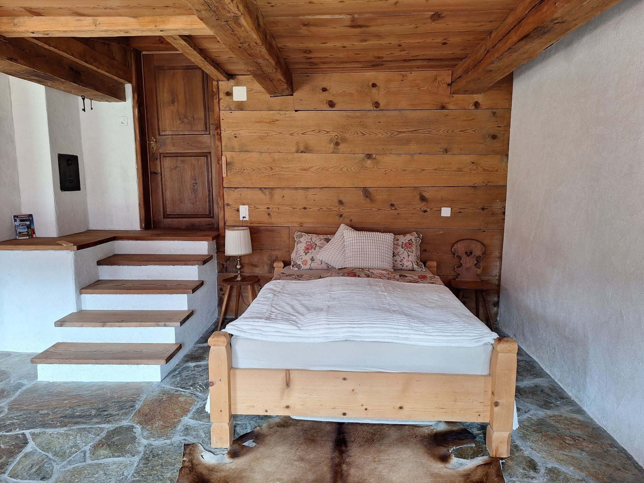 Inside, you will find a cosy studio atmosphere that cleverly combines comfort and functionality. Despite the open-plan living concept without a separate bedroom, this mountain hut offers a fully equipped bathroom with shower and partial underfloor heating, which spreads a pleasant warmth throughout the rooms. There is also a washing machine for communal use and a small kitchen corner with a three-ring hob and kettle for culinary discoveries.