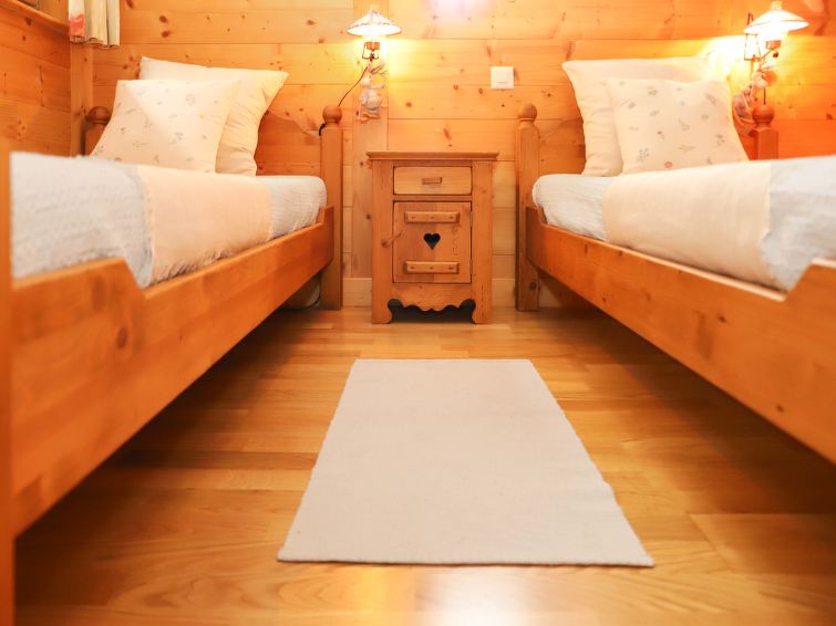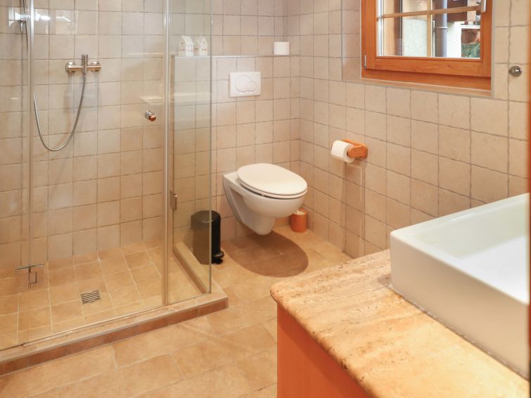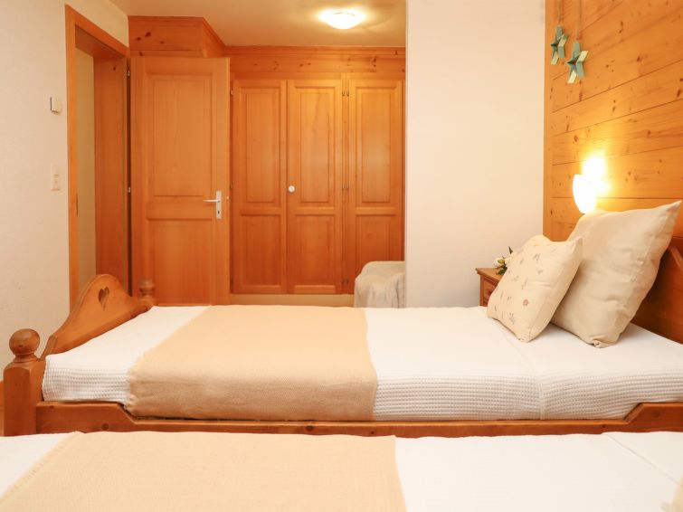 "Boule de Neige", chalet 4 pièces 96 m2 sur 3 niveaux, situation sud. Aménagement confortable et agréable: séjour/salle à manger avec baie vitrée orientée sud avec cheminée, coin repas, TV (câblée) et chauffage électrique. Sortie sur le balcon, orientée sud. Cuisine ouverte (lave-vaisselle, 4 plaques vitrocéramiques, grille-pain, bouilloire électrique, service à fondue (fondue au fromage)) avec petite bar. À l'étage inférieur: (escalier en colimaçon) 1 chambre, orientée sud avec 1 lit double et douche/WC. Sortie sur le balcon, orientée sud. 2 chambres, chaque chambre avec: 2 lits. Douche/WC, WC séparé. Balcon, situation sud. Très belle vue panoramique sur les montagnes, les alentours et la localité. A disposition: Internet (Connexion WIFI, gratuit). Place de parking (1 Voiture). Veuillez noter: logement non-fumeur. Sans ascenseur. Un hammam est mis à disposition ainsi qu'une cave.