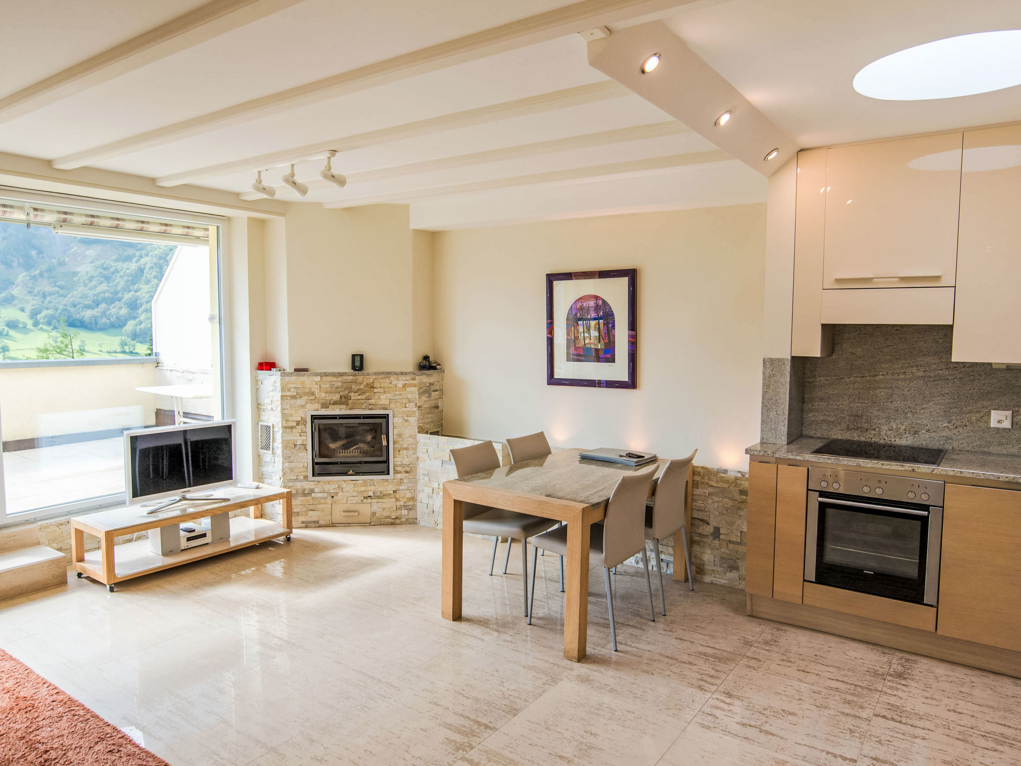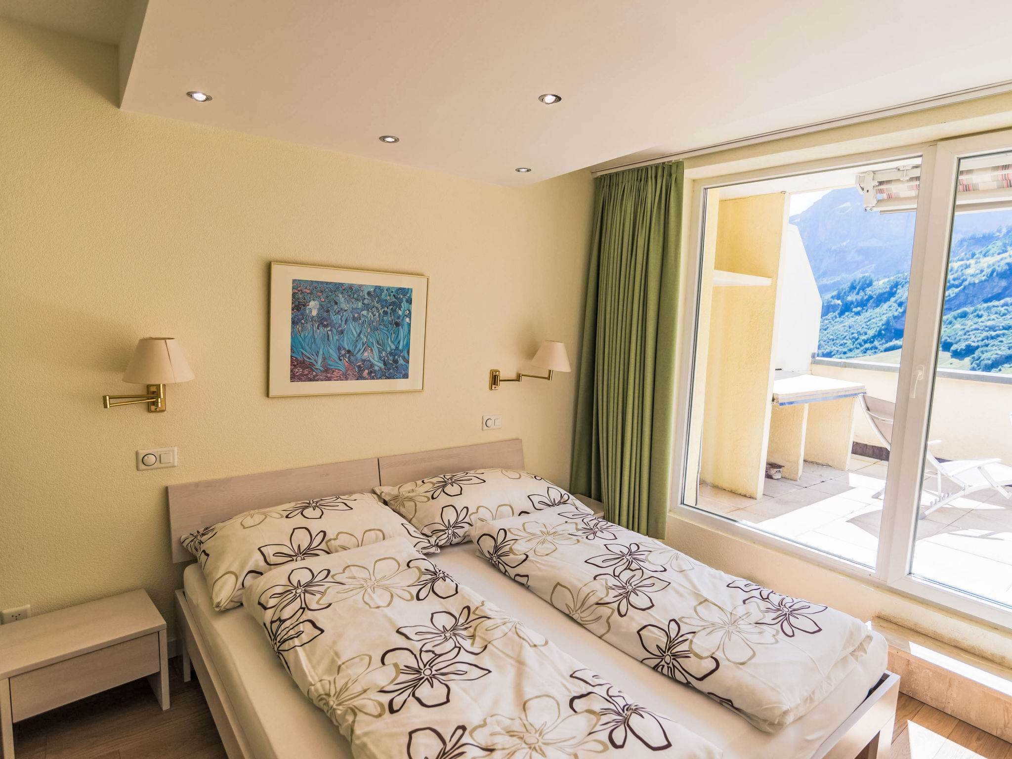 "Cristal 67", apt sous les toits 2 pièces 52 m2 au 5ème étage. Rénové, aménagement agréable et plaisant: séjour/salle à manger avec 1 divan-lit, cheminée, table pour les repas et TV (câblée). Sortie sur la terrasse. 1 chambre double avec 1 lit double (1 x 90 cm, longueur 200 cm). Sortie sur la terrasse. Cuisine ouverte (four, lave-vaisselle, 4 plaques vitrocéramiques, cafetière électrique). Douche/WC. Sol en parquet. Grande terrasse. Meubles de terrasse. Vue panoramique sur les montagnes et la localité. A disposition: sèche-cheveux. Internet (Connexion WIFI, gratuit). Veuillez noter: logement non-fumeur.