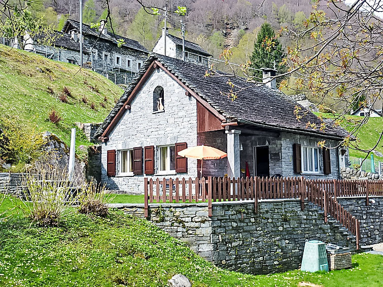 Brione Verzasca: Rustico. Rustico accueillant "la Rustica", année de construction 1960. En bordure de la localité, situation tranquille, juste au bord de la rivière, dans une impasse. A usage privé: terrain, jardin. Barbecue. Sentier en escalier (15 marches) jusqu'à la maison. Place de parking. Magasins 15 km, magasin d'alimentation 700 m, restaurant 200 m, arrêt de bus 250 m, gare ferroviaire "Tenero" 15 km, piscine 15 km, plage aménagée 15 km. Terrain de golf 18 km, tennis 15 km.