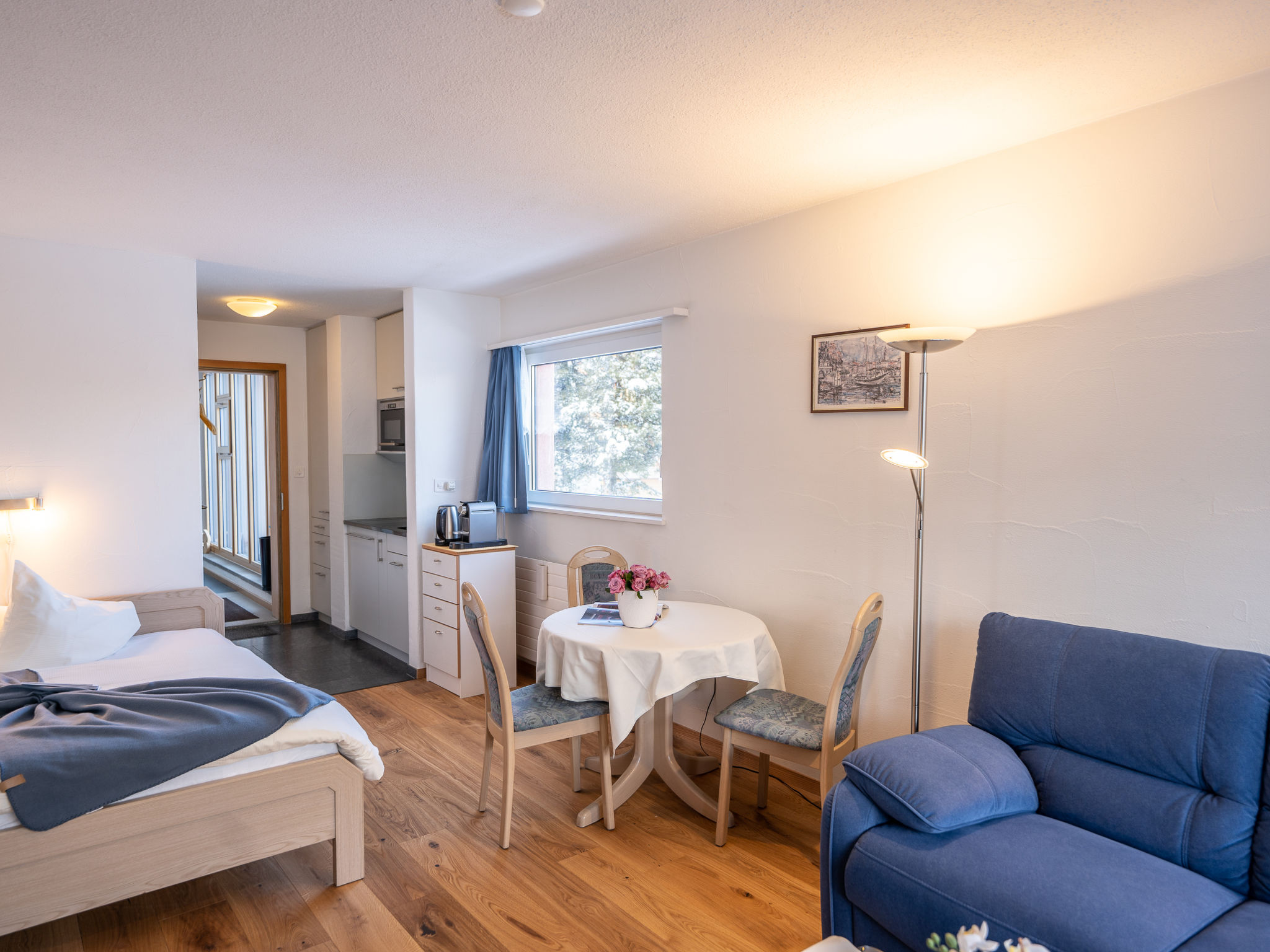 "Chesa Corvatsch 111 - Champfer" studio 30 m2 au 1er étage. Logement idéal pour 2 adultes. Clair, aménagement agréable et plaisant: séjour/chambre à coucher avec table pour les repas et TV (écran plat) avec 1 grand-lit (1 x 160 cm, longueur 200 cm). Petite coin cuisine dans l'entrée (2 plaques vitrocéramiques, grille-pain, bouilloire électrique, micro-ondes, cafetière électrique, Capsules pour machine à café (Nespresso) (NON INCLUSES)). Bain/WC. Chauffage. Mobilier de balcon. Belle vue sur les montagnes et la localité. A disposition: Internet (Connexion WIFI, gratuit). Place de parking No 111 (1 Voiture). Veuillez noter: logement côté cour. Logement non-fumeur maison non-fumeur.