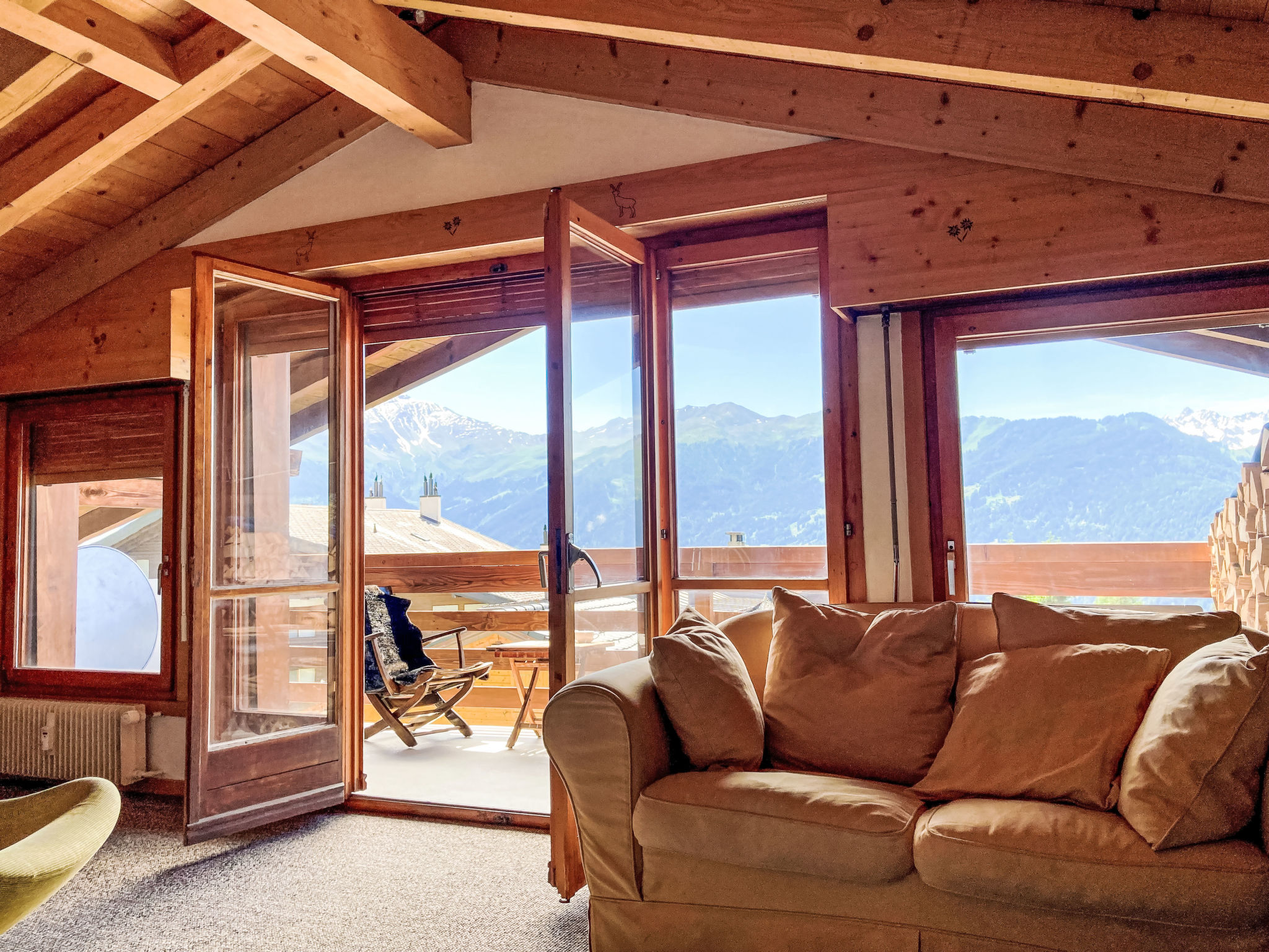 "Olympia 443", apt sous les toits 4 pièces 90 m2 au 4ème étage. Spacieux, rénové, aménagement agréable et de bon goût: grand séjour/salle à manger avec cheminée et TV (câblée). 1 chambre avec 1 lit double (180 cm, longueur 200 cm). 1 chambre mansardée avec 2 lits (90 cm, longueur 200 cm). 1 chambre mansardée avec 2 lits (90 cm, longueur 200 cm). Cuisine ouverte (4 plaques de cuisson, four, lave-vaisselle, 4 plaques vitrocéramiques, cafetière électrique, Capsules pour machine à café (Nespresso) (NON INCLUSES), appareil à raclette, service à fondue (fondue au fromage)). Bain/WC, douche/WC. Mobilier de balcon. Très belle vue sur les montagnes. A disposition: Internet (Connexion WIFI). Place de parking No 443 (1 Voiture). Veuillez noter: logement non-fumeur. Détecteur de fumée.