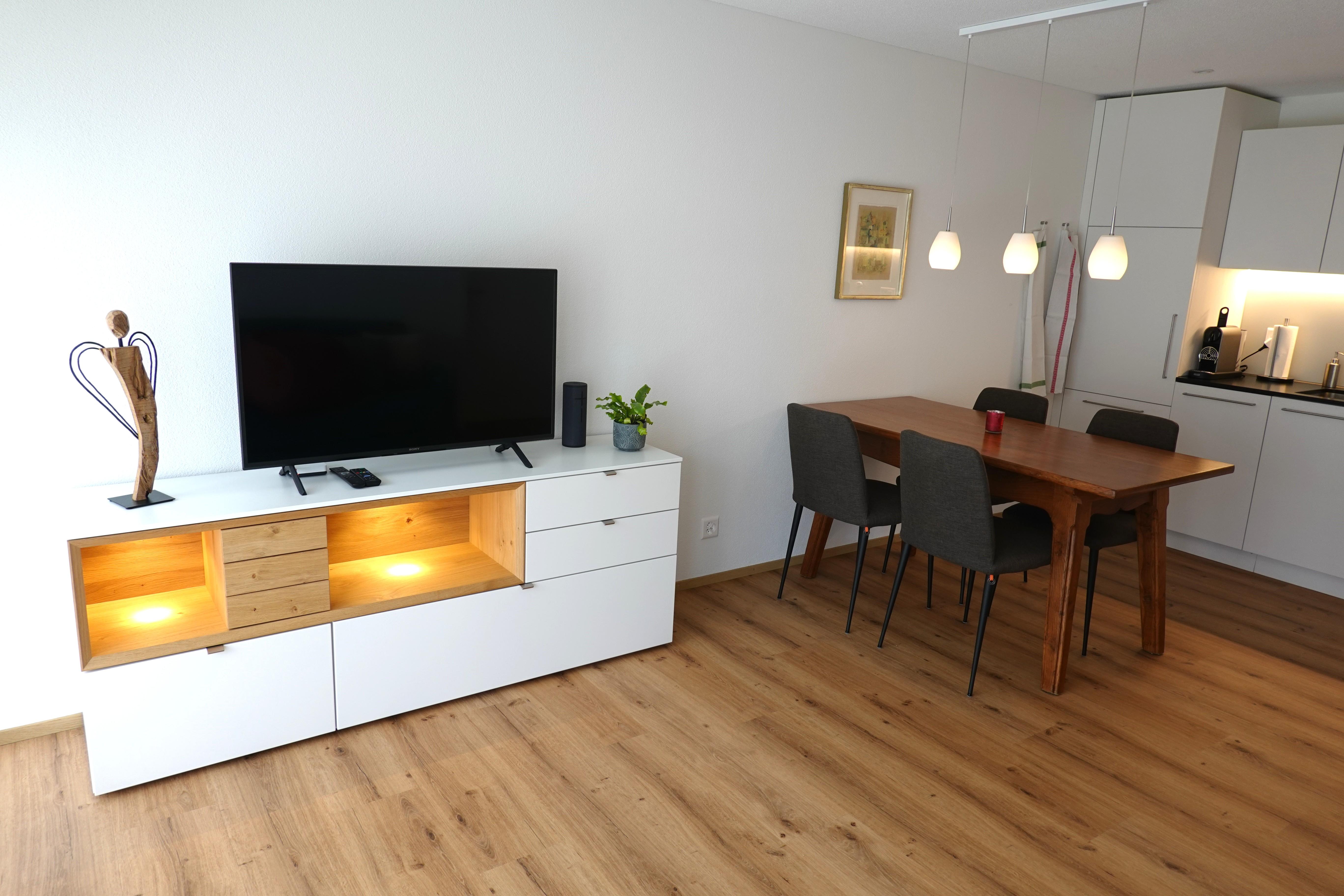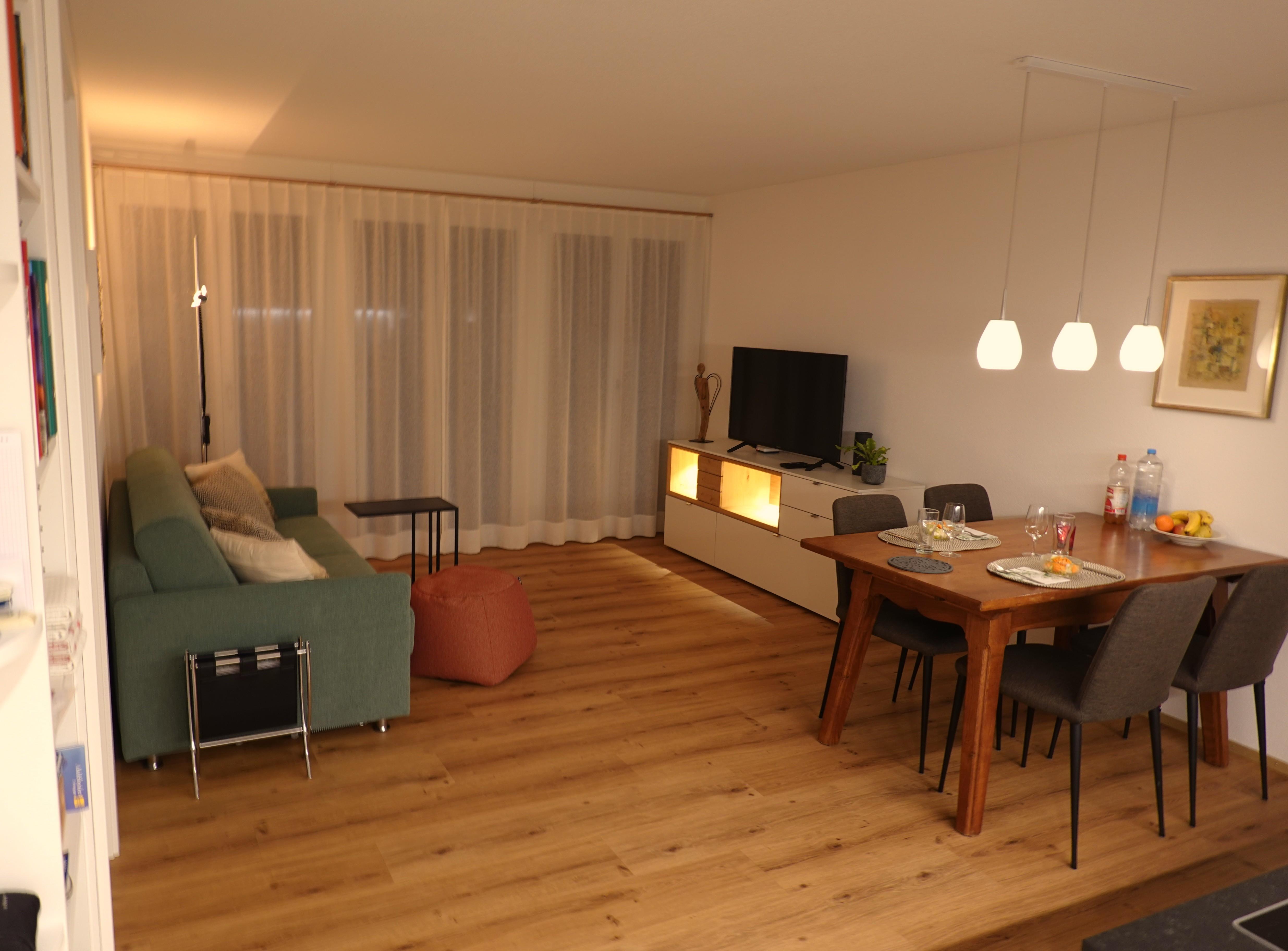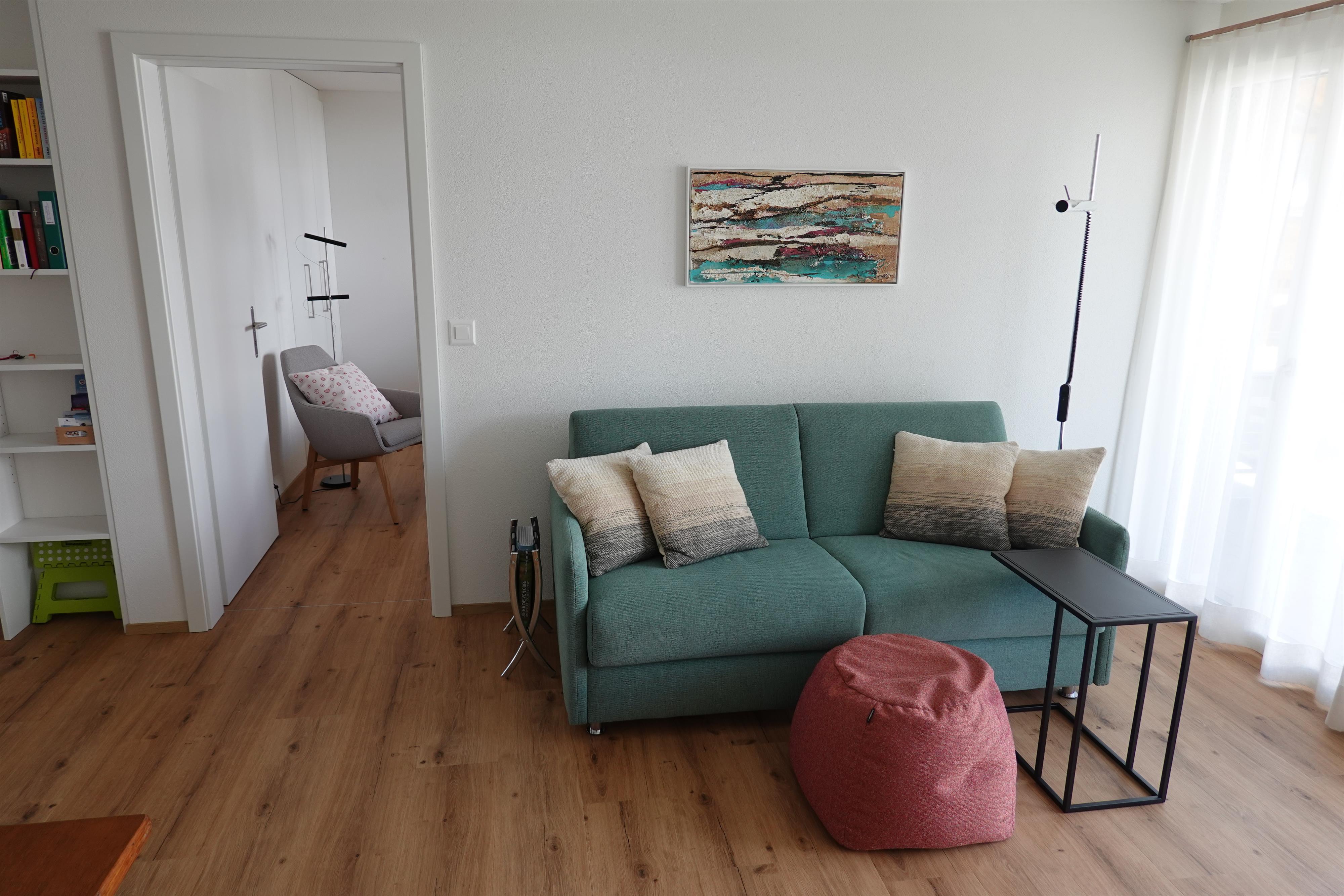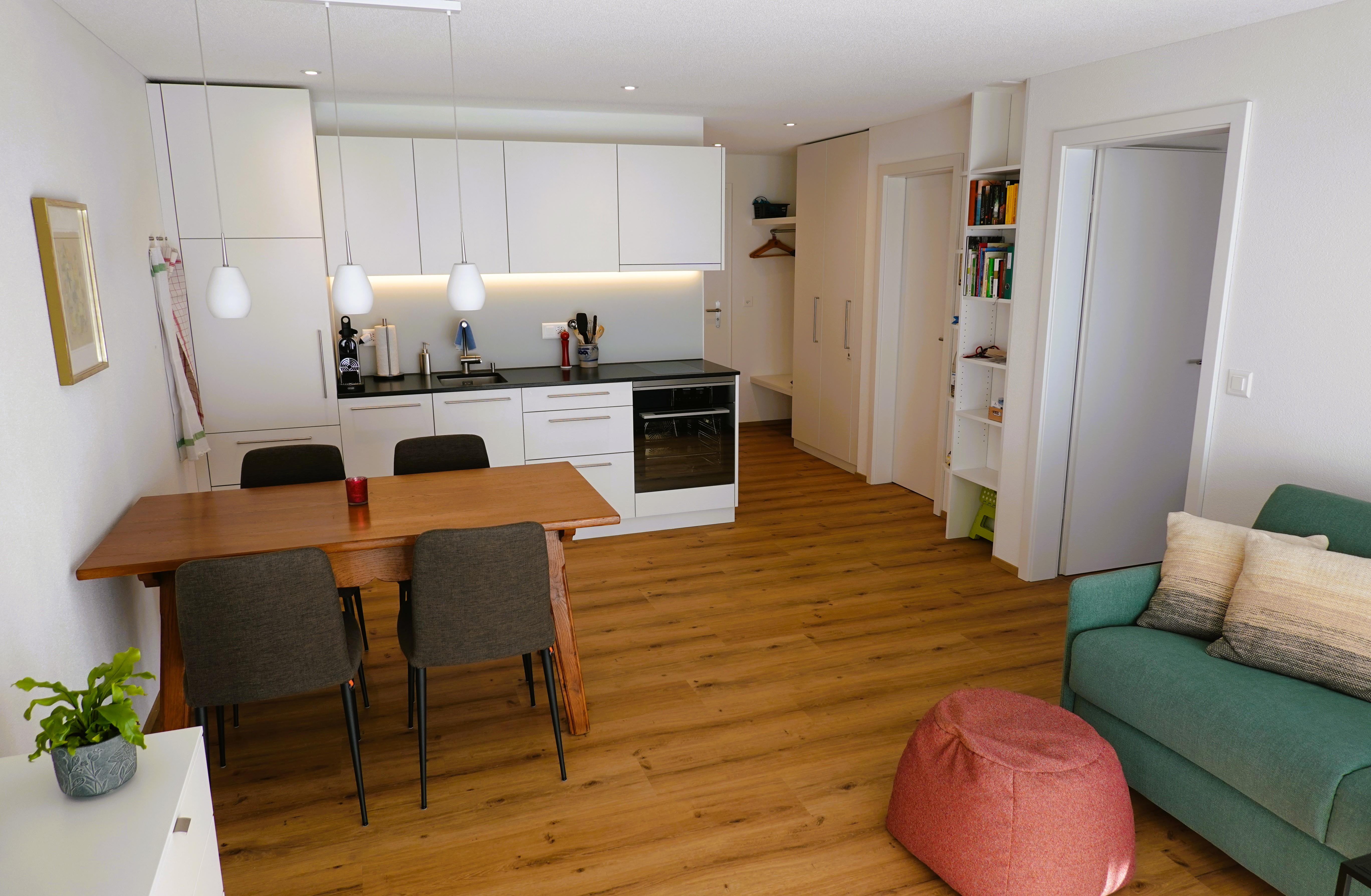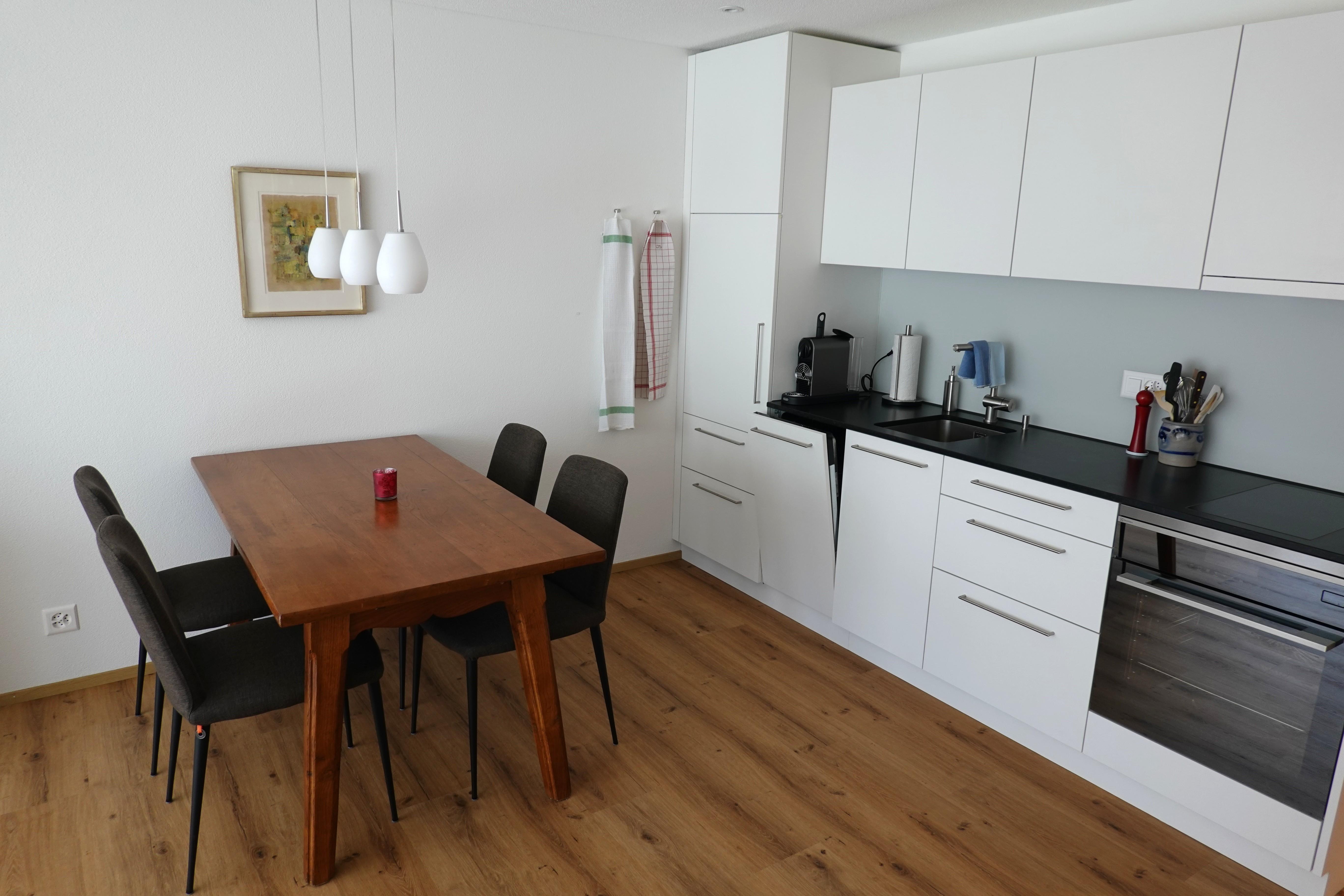 L'appartement moderne dispose d'une entrée avec vestiaire, d'une chambre à coucher, d'un salon avec cuisine ouverte, d'une salle de bain avec douche/WC et d'un chauffage au sol. L'ascenseur vous amène à votre cave avec la machine à laver/tumbler et à votre place de parking privé dans le garage. Station de recharge pour voitures électriques au LWA tout proche. L'appartement est aménagé d’une manière fonctionnelle et pratique et peut accueillir confortablement 2 personnes. Dans la chambre à coucher se trouvent un lit double (180x200), une armoire paysanne ainsi qu'un fauteuil avec un lampadaire. Si une troisième personne souhaite séjourner, le canapé du salon peut être transformé aisément en un canapé-lit confortable (140x200), voir «Bon à savoir». La cuisine ouverte est équipée d'un réfrigérateur/congélateur, d'une plaque de cuisson vitrocéramique, d'un four/steamer et d'un lave-vaisselle (un four micro-ondes sur demande). Sur la terrasse se trouvent une table de jardin avec des chaises, deux chaises longues, un coffre de jardin avec des coussins et un parasol.