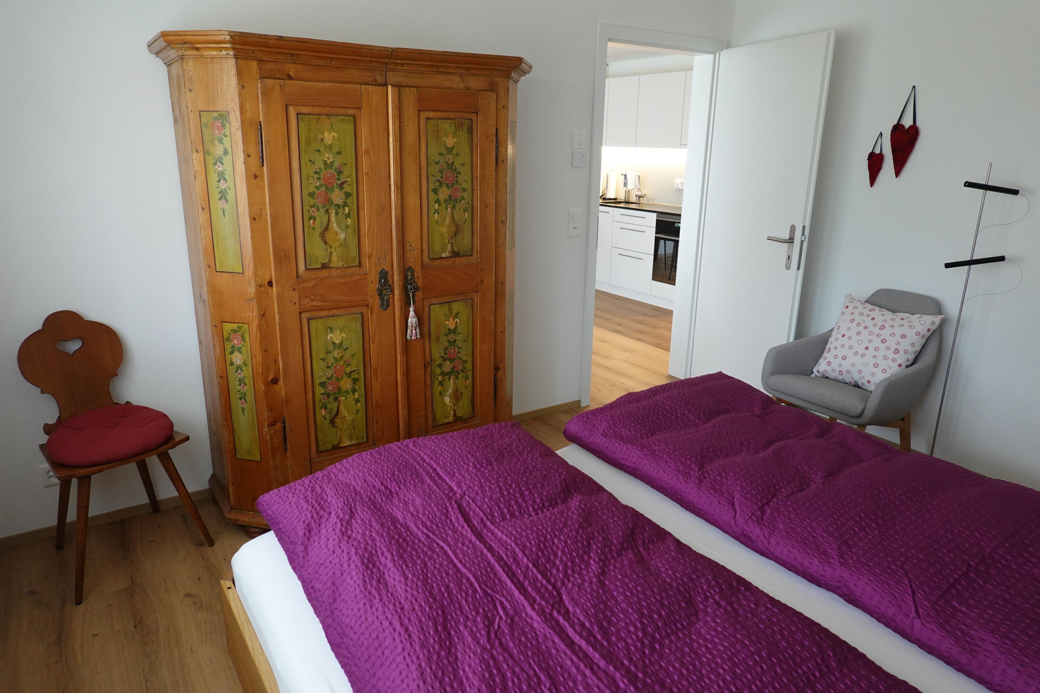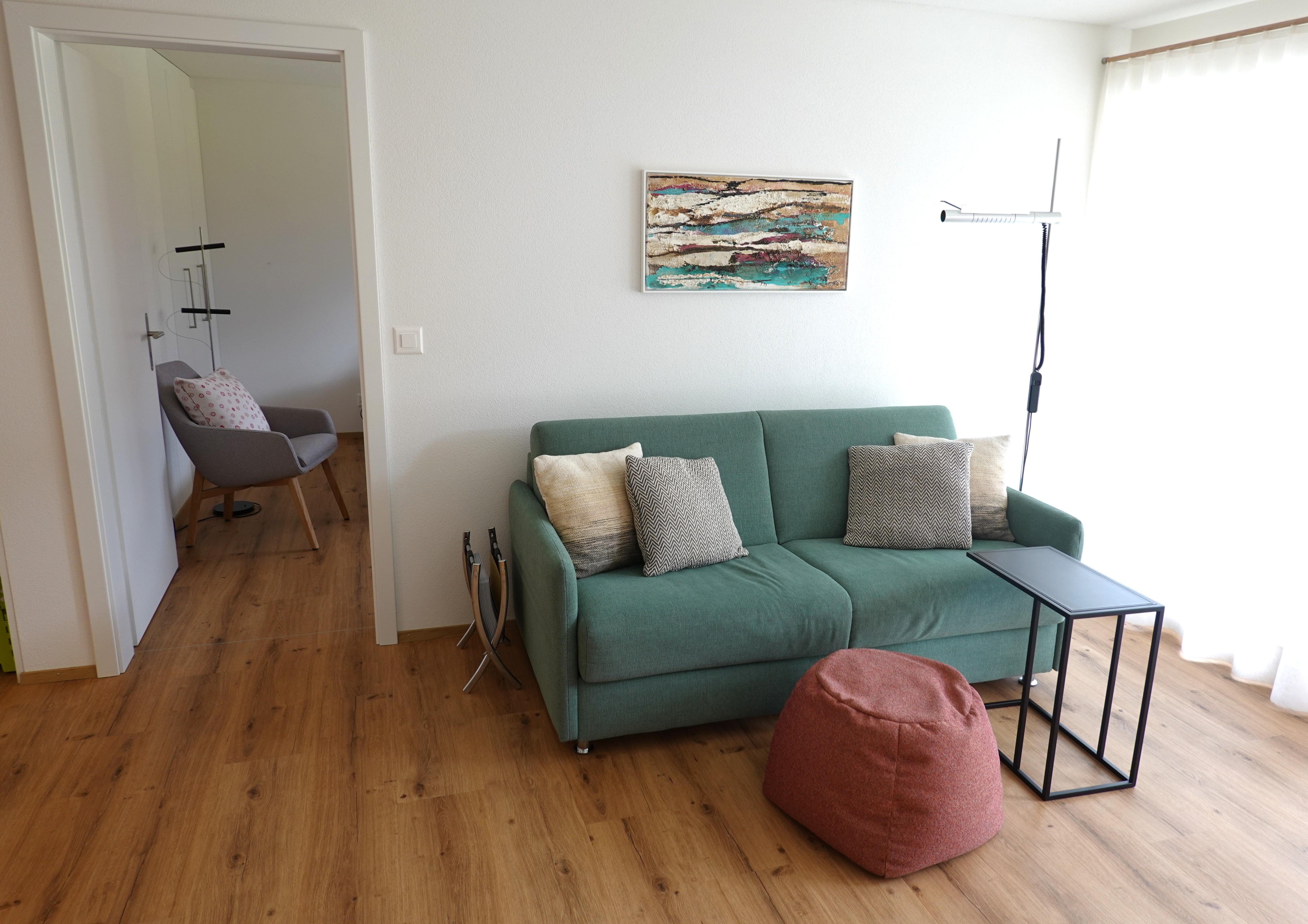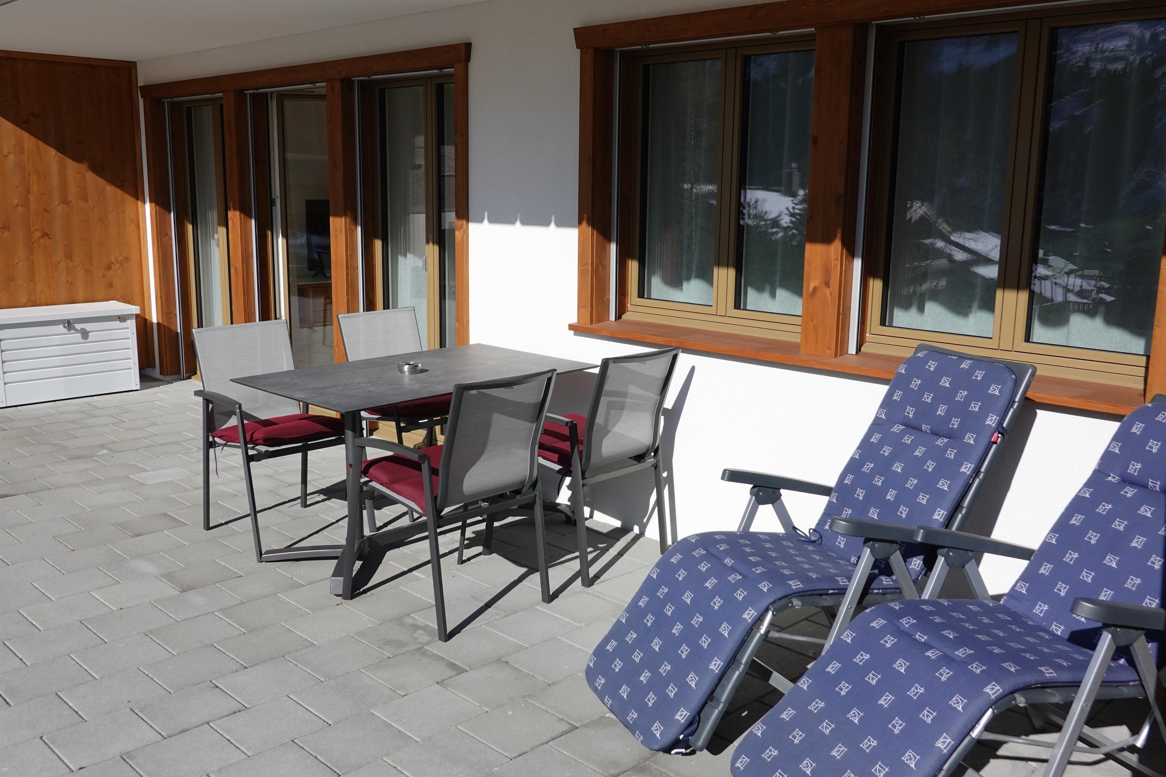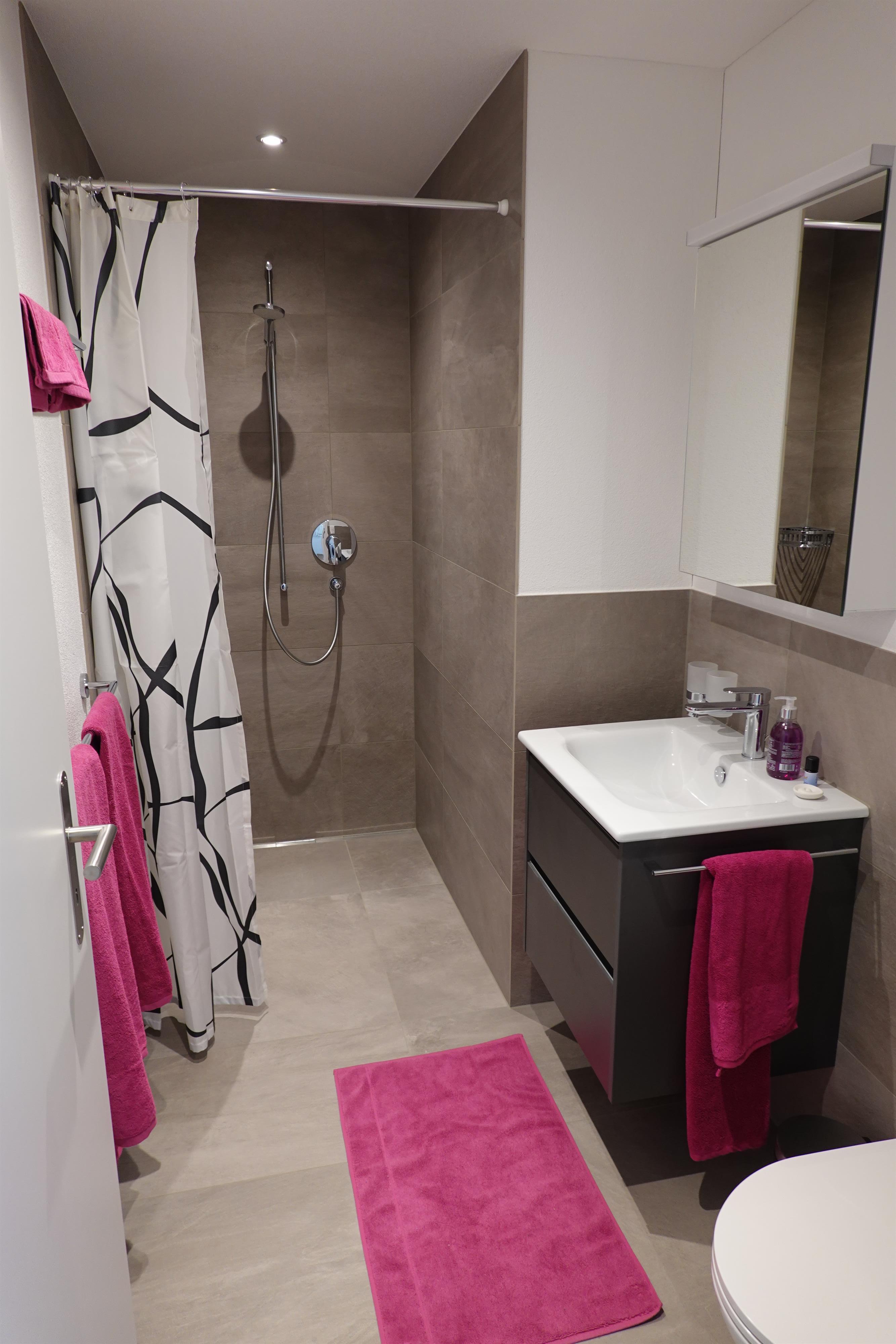 L'appartement moderne dispose d'une entrée avec vestiaire, d'une chambre à coucher, d'un salon avec cuisine ouverte, d'une salle de bain avec douche/WC et d'un chauffage au sol. L'ascenseur vous amène à votre cave avec la machine à laver/tumbler et à votre place de parking privé dans le garage. Station de recharge pour voitures électriques au LWA tout proche. L'appartement est aménagé d’une manière fonctionnelle et pratique et peut accueillir confortablement 2 personnes. Dans la chambre à coucher se trouvent un lit double (180x200), une armoire paysanne ainsi qu'un fauteuil avec un lampadaire. Si une troisième personne souhaite séjourner, le canapé du salon peut être transformé aisément en un canapé-lit confortable (140x200), voir «Bon à savoir». La cuisine ouverte est équipée d'un réfrigérateur/congélateur, d'une plaque de cuisson vitrocéramique, d'un four/steamer et d'un lave-vaisselle (un four micro-ondes sur demande). Sur la terrasse se trouvent une table de jardin avec des chaises, deux chaises longues, un coffre de jardin avec des coussins et un parasol.