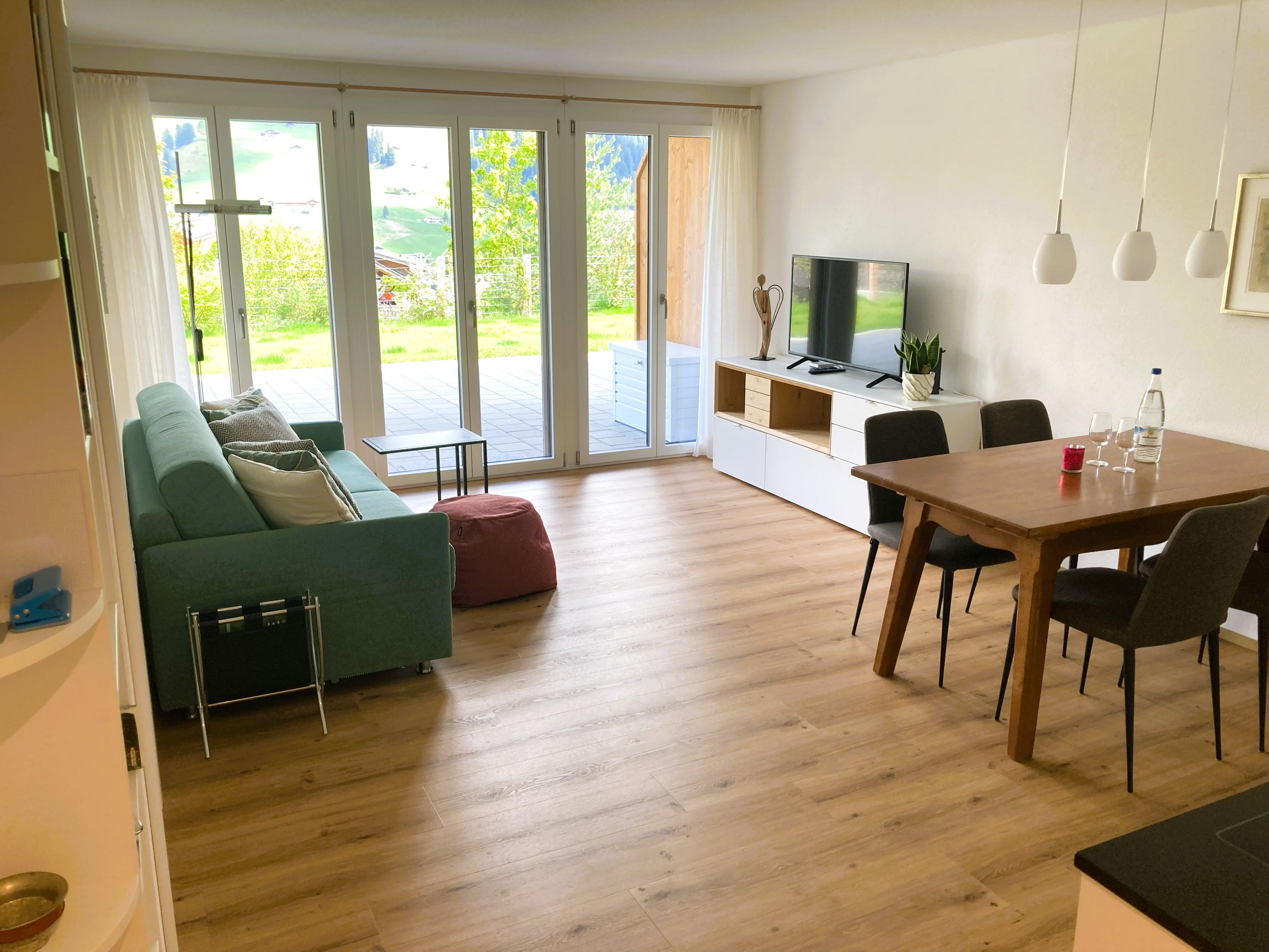 Bel appartement calme de 2.5 pièces au rez-de-chaussée dans un immeuble collectif, construit en 2023. Situé dans un endroit central au sud, au-dessus du centre du village et directement en dessous du Parkhotel Bellevue. L'appartement (52m2), avec grande terrasse et pelouse (35m2), offre une vue panoramique sur le Bonderspitz, le massif du Lohner, le Wildstrubel et la cascade d'Engstligen. Les chemins de randonnée Höreli/Schermtanne et la télécabine pour la Tschentenalp se trouvent à proximité immédiate. Les restaurants, les magasins, les banques, le centre touristique, la poste, les transports publics et la télécabine direction du VogellisiBerg (région de Silleren) sont facilement accessibles à pied en 5 minutes environ.