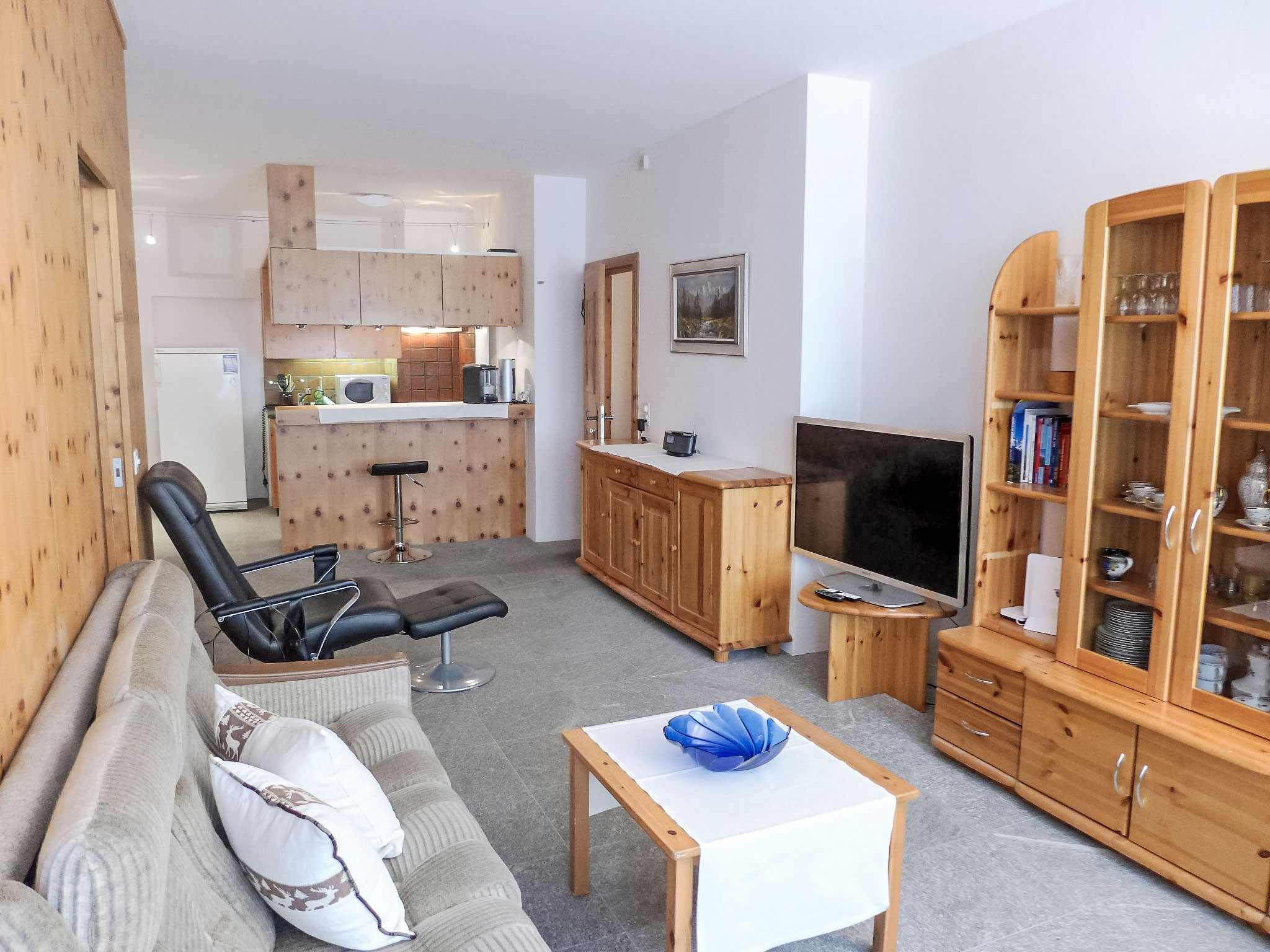 "Chesa Cromer", apt 3 pièces 80 m2, rez-de-chaussée surélevé. Spacieux, aménagement simple et plaisant: séjour/salle à manger ouvert, fenêtre donnant sur la cour avec TV (écran plat), radio. Sortie sur le balcon, orientée ouest. 1 grande chambre double avec 1 lit double (2 x 90 cm, longueur 200 cm), douche/WC. Sortie sur le balcon. 1 chambre avec porte coulissante avec 1 x 2 lits superposés (140 cm, longueur 200 cm). Cuisine ouverte (four, lave-vaisselle, 4 plaques vitrocéramiques, grille-pain, bouilloire électrique, micro-ondes, cafetière électrique, Capsules pour machine à café (Nespresso) (NON INCLUSES), appareil à raclette, service à fondue (fondue chinoise, fondue au fromage)). Salle de bains, WC séparé. Chauffage. Sol en pierres naturelles. Mobilier de balcon. Vue latérale sur les montagnes et la localité. A disposition: fer à repasser, sèche-cheveux. Internet (Connexion WIFI, gratuit). Place de parking No 2. Veuillez noter: adapté(e) aux familles logement côté parking. Logement non-fumeur. Maximum 1 animal/ chien autorisé. Sans ascenseur.