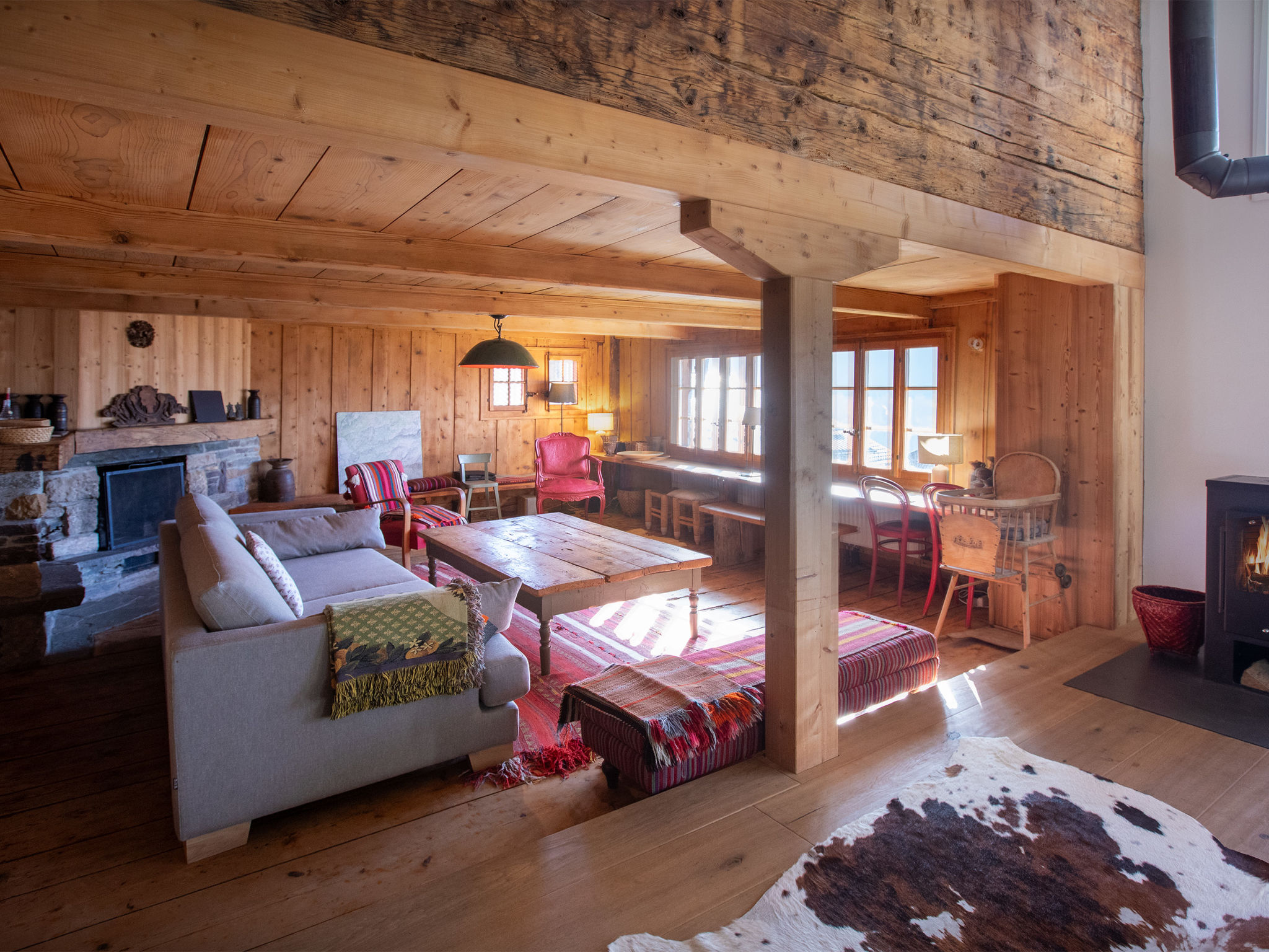"Chalet Pierre Fleur", chalet 6 pièces 160 m2 sur 3 niveaux. Logement idéal pour 7 adultes + 4 enfants. Partiellement mansardé, rénové en 2021, aménagement confortable et agréable: entrée. Grand séjour/salle à manger avec cheminée, poêle suédois et table pour les repas. 1 chambre avec 1 lit double (160 cm). Cuisine ouverte (four, lave-vaisselle, 4 plaques à induction, micro-ondes, cafetière électrique, Capsules pour machine à café (Nespresso) (NON INCLUSES), appareil à raclette) avec passe-plat. Sortie sur le jardin, sur la terrasse, orientée ouest. Douche, WC séparé. À l'étage inférieur: 1 chambre avec 1 lit double (180 cm), douche/WC et double vasque. Sortie sur le jardin, sur la terrasse, orientée sud. À l'étage supérieur: 1 chambre, mansardée Portes basses hauteur 120 cm avec 1 lit double (160 cm). Sortie sur le balcon. 1 chambre d'enfants, mansardée Portes basses hauteur 120 cm avec 2 x 2 lits superposés (90 cm, longueur 180 cm). 1 chambre, mansardée Portes basses hauteur 120 cm, sans armoire avec 1 lit (140 cm). Bain/WC. Petit balcon 8 m2, grande terrasse 20 m2, grande terrasse 16 m2. Meubles de terrasse, barbecue. Très belle vue sur les montagnes. A disposition: lave-linge. Internet (Connexion WIFI, gratuit). Veuillez noter: maison non-fumeur. Maximum 1 animal/ chien autorisé.