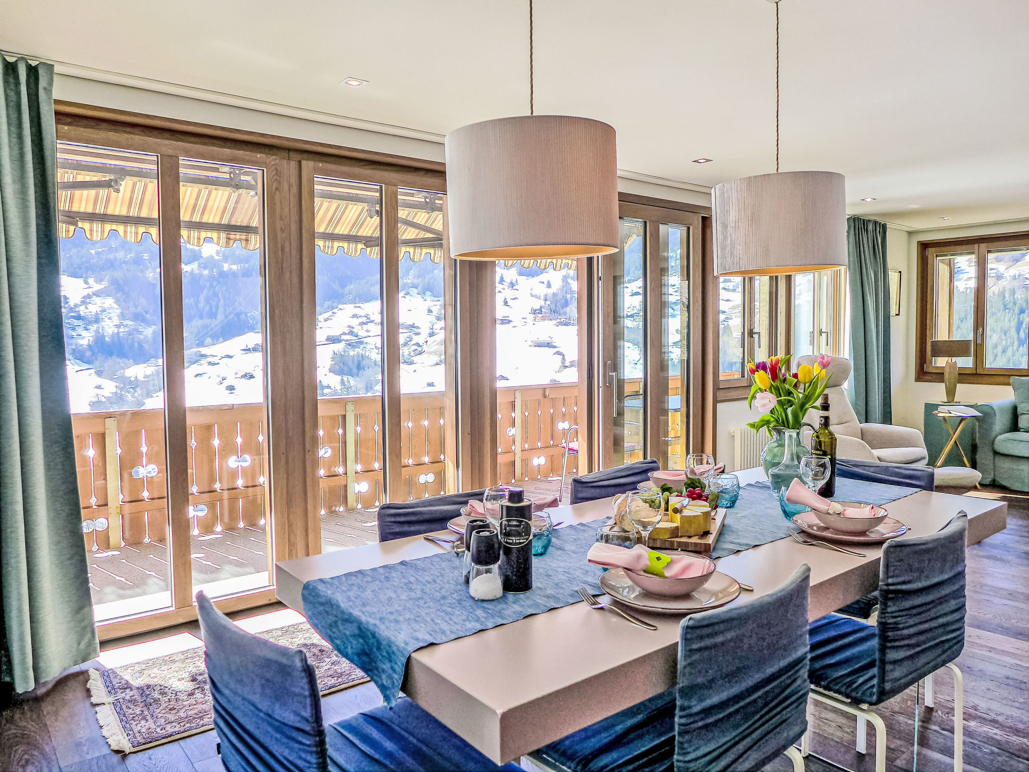 "Chalet Adlerhorst OG", apt 3 pièces 122 m2 au 1er étage, situation sud. Spacieux et clair, aménagement très confortable et de bon goût: grand séjour/salle à manger ouvert avec baie vitrée avec table pour les repas et TV (câblée) (écran plat). Sortie sur le balcon. 2 chambres doubles, chaque chambre avec: 1 lit double (160 cm, longueur 200 cm), douche/WC. Sortie sur le balcon. Grande cuisine ouverte (four, lave-vaisselle, 4 plaques à induction, grille-pain, bouilloire électrique, micro-ondes, cafetière électrique, Capsules pour machine à café (Dolce Gusto) (NON INCLUSES), service à fondue (fondue au fromage)). Sol en parquet. Grand balcon, situation sud. Mobilier de balcon. Superbe vue panoramique sur les montagnes et la localité. A disposition: lave-linge, sèche-linge, fer à repasser, chaise haute pour enfant, lit bébé jusqu'à 2 ans (en sus), sèche-cheveux. Internet (Connexion WIFI, gratuit). Place de parking (1 Voiture) près de la maison. Veuillez noter: logement non-fumeur. Détecteur de fumée, extincteur.