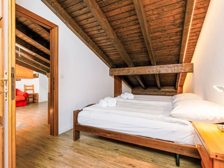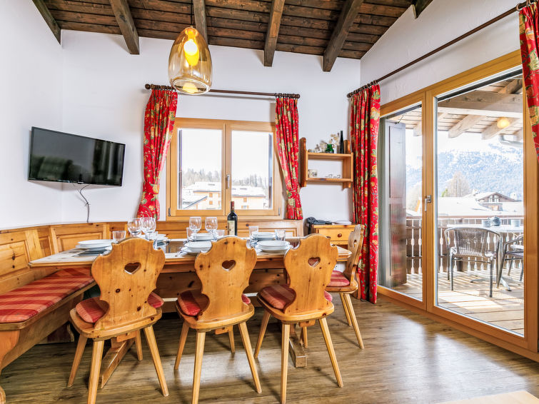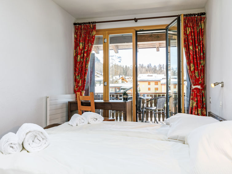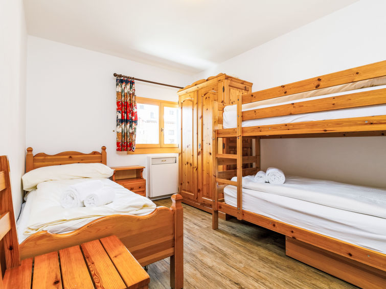 "Residenza Chesa Margun 15-5", apt 4 pièces 90 m2 sur 2 niveaux, sous le toit. Spacieux, aménagement confortable et avec beaucoup de bois: séjour/salle à manger avec coin repas, Télévision numérique, écran plat et radio. Sortie sur le balcon. 1 chambre avec 1 lit (90 cm, longueur 190 cm), 1 x 2 lits superposés (90 cm, longueur 190 cm). 1 chambre double avec 1 lit double (2 x 90 cm, longueur 190 cm). Sortie sur le balcon. Petite cuisine ouverte (four, lave-vaisselle, 3 plaques vitrocéramiques, cafetière électrique, service à fondue (fondue au fromage)). Bain/WC. Chauffage électrique. À l'étage supérieur: (escalier en colimaçon) salon mansardé, ouvert avec Télévision numérique, écran plat et radio. 1 chambre avec 2 lits (90 cm, longueur 190 cm). Douche/WC. Chauffage électrique. Balcon, situation sud. Meubles de terrasse (2). Belle vue sur les montagnes et la localité. A disposition: téléphone. Internet (Connexion WIFI, gratuit). Garage, hauteur 198 cm, largeur 265 cm. Veuillez noter: adapté(e) aux familles. Logement non-fumeur. Maximum 1 animal/ chien autorisé.