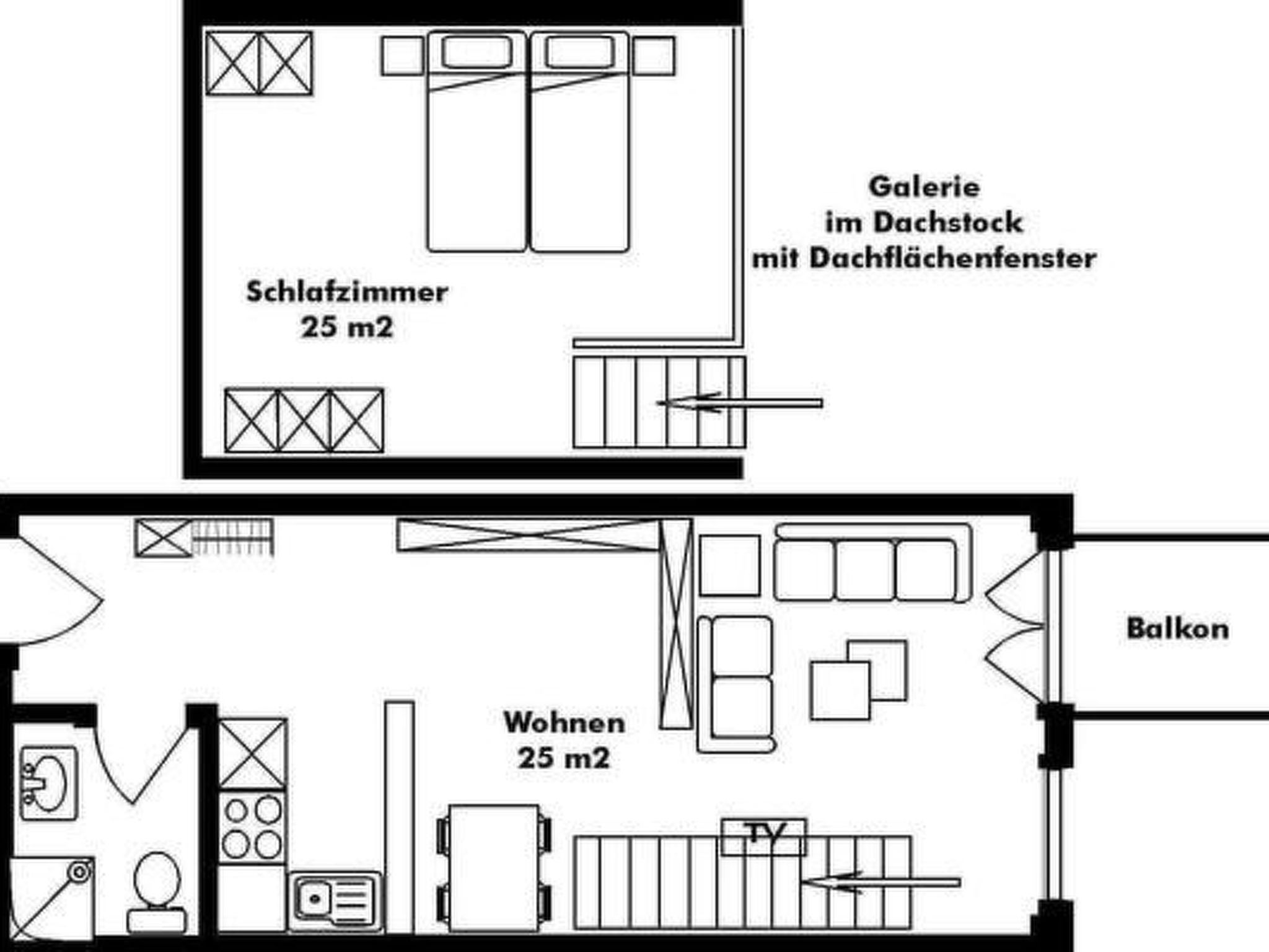 Bright, generously furnished penthouse flat on the 2nd floor (65m2). Quietly located with sunny balcony. The cosy living room with parquet floor is furnished with local spruce wood and a seating area. Large double bedroom with 2 single beds and spacious wardrobe on the gallery (carpeted floor) accessible via an internal staircase. The gallery has a skylight that can be opened in summer. The flat offers free WLAN and Swisscom TV. The flat also has a dining area and an open-plan kitchen with a generous inventory. The kitchen is separate and equipped with 4 hotplates, oven, microwave, dishwasher, fridge with freezer compartment and Nespresso coffee machine. In the entrance area (floorboards) there is an open wardrobe with cupboard. The bathroom has a shower with glass walls, WC and washbasin.