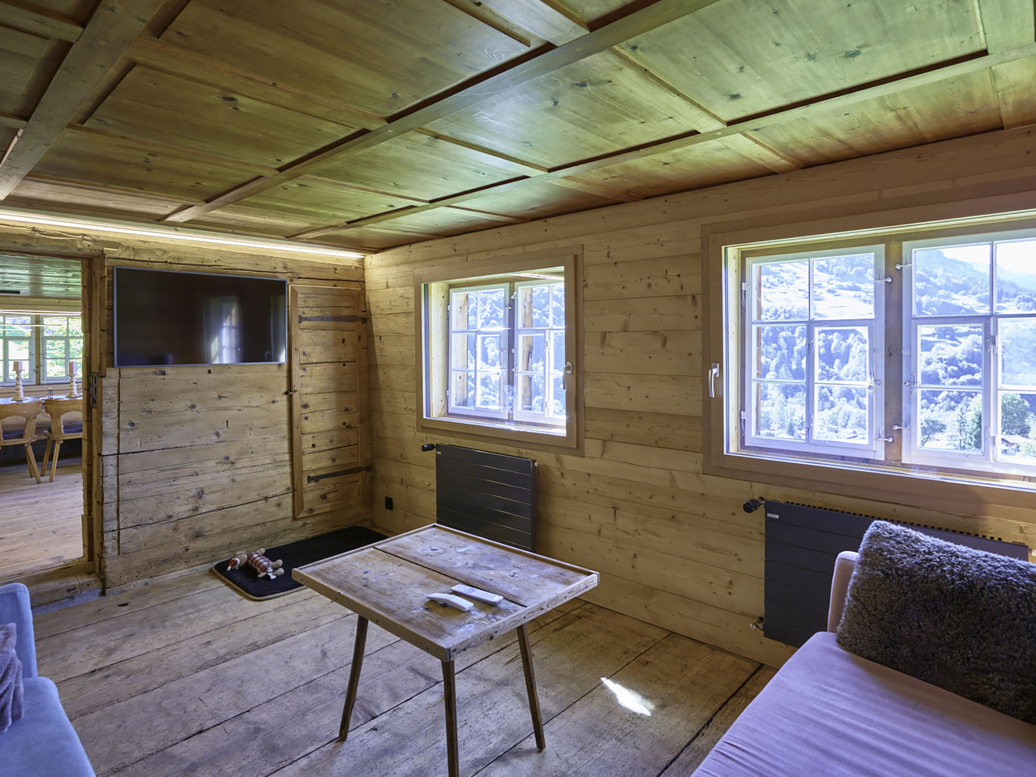 Maison 7 pièces 160 m2 sur 3 niveaux. Aménagement confortable et rustique: séjour hauteur plafond 180 - 200 cm, Portes basses hauteur 170 cm avec TV (câblée) (écran plat). Sortie sur le jardinet. Salle à manger. Cuisine ouverte (four, lave-vaisselle, 4 plaques vitrocéramiques, grille-pain, bouilloire électrique, micro-ondes, congélateur, cafetière électrique, appareil à raclette, service à fondue (fondue au fromage)). Douche/WC. À l'étage supérieur: 2 chambres doubles, chaque chambre avec: TV (câblée) (écran plat). 1 chambre avec 1 divan-lit, 1 grand-lit et TV (câblée) (écran plat). Bain/douche/WC. 2ème étage: (escalier raide) 1 chambre avec 1 divan-lit. Salle de jeux. Sol en bois. Jardinet 30 m2. Meubles de terrasse, barbecue, chaises longues (3), loggia, réduit. Belle vue sur les montagnes, les alentours et la localité. A disposition: lave-linge, sèche-linge, lit bébé. Internet (Connexion WIFI, gratuit). Place de parking, garage près de la maison. Veuillez noter: logement non-fumeur.