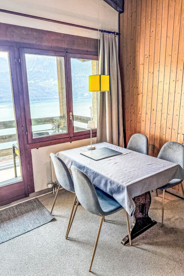 Studio 38 m2 au 1er étage. Aménagement plaisant: séjour/salle à manger avec 2 lits et TV (satellite) (écran plat). Sortie sur le balcon. Coin cuisine (lave-vaisselle, 2 plaques vitrocéramiques, grille-pain, bouilloire électrique, cafetière électrique). Bain/WC. Balcon 7 m2. Meubles de terrasse. Superbe vue panoramique sur le lac, les montagnes et la vallée. A disposition: Internet (Connexion WIFI, gratuit). 167557