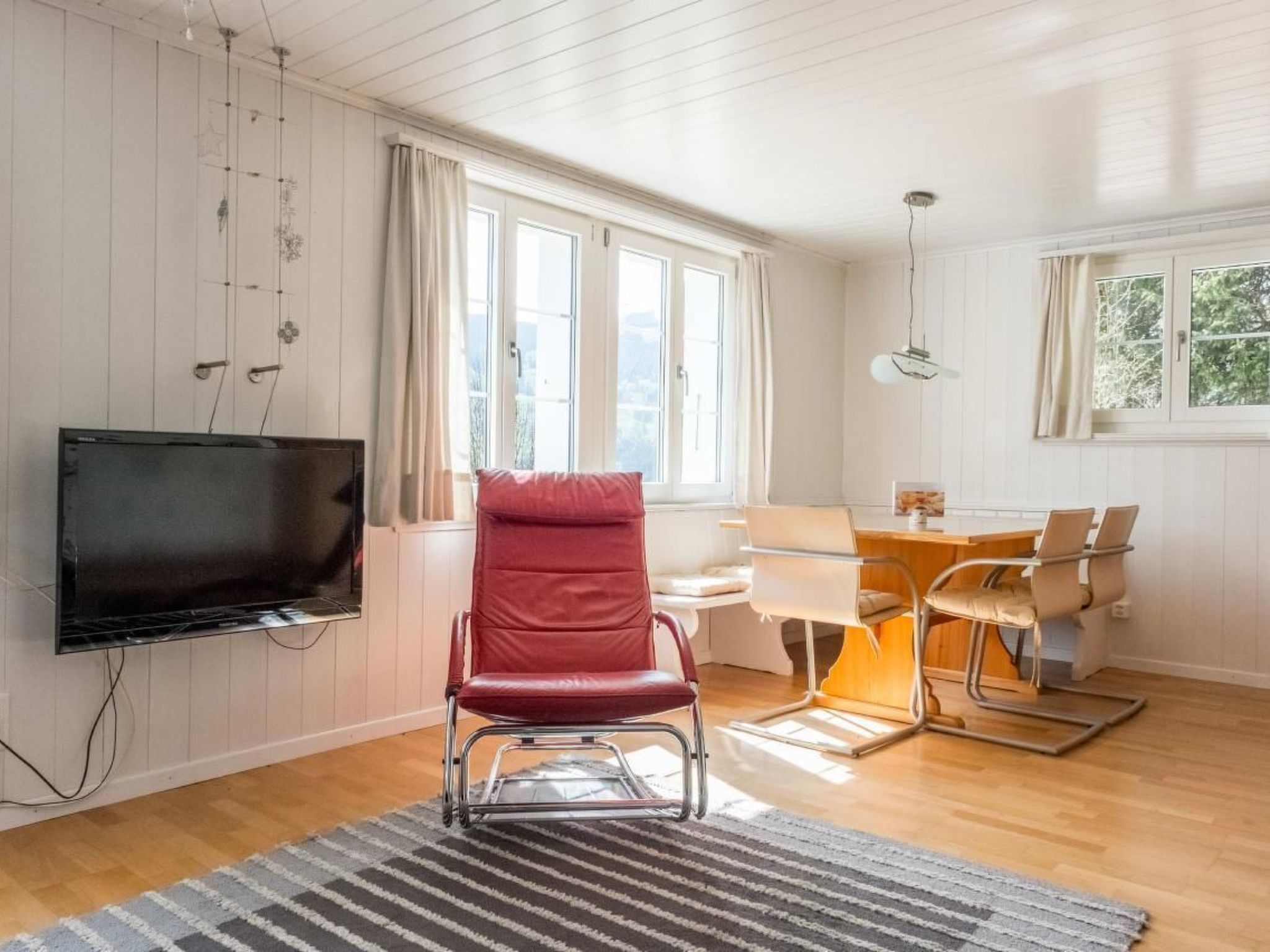 The chalet has no direct access and no parking space – ideal for guests arriving by public transport. Public parking spaces are available within walking distance. The village centre is a 10 minutes’ walk away. The bus stop is close by.