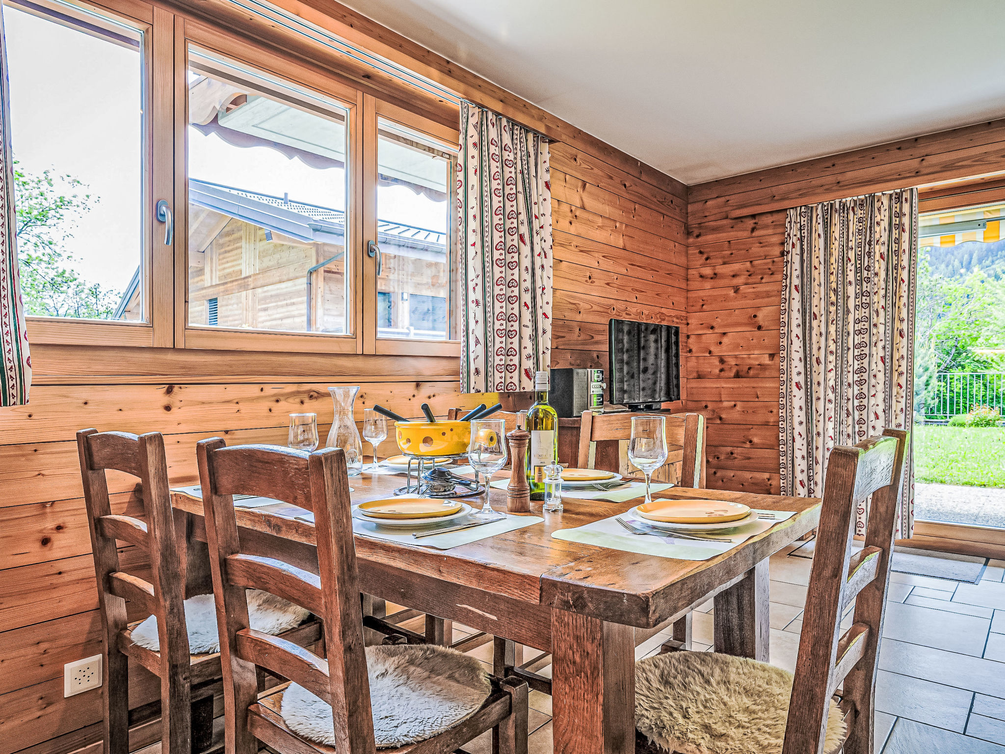 "Rhodos A R03", apt 3 pièces 76 m2, au rez-de-chaussée. Spacieux, aménagement confortable et agréable: entrée. Séjour/salle à manger avec 1 divan-lit, TV (câblée), radio et lecteur CD. Sortie sur la terrasse. 1 chambre avec 2 lits (90 cm, longueur 200 cm), bain/WC. 1 chambre avec 2 lits (90 cm, longueur 200 cm). Cuisine ouverte (four, lave-vaisselle, 4 plaques vitrocéramiques, grille-pain, bouilloire électrique, micro-ondes, cafetière électrique, Capsules pour machine à café (Nespresso) (NON INCLUSES), appareil à raclette, service à fondue (fondue au fromage)). Douche/WC. Terrasse, situation sud-ouest, pelouse. Meubles de terrasse, chaises longues (2). Vue panoramique sur les montagnes. A disposition: sèche-cheveux. Internet (Connexion WIFI, gratuit). Garage No R03 (1 Voiture), hauteur 200 cm. Veuillez noter: logement non-fumeur. Téléphérique 2 courses aller-retour par semaine offerte du 19.06 - 26.10.