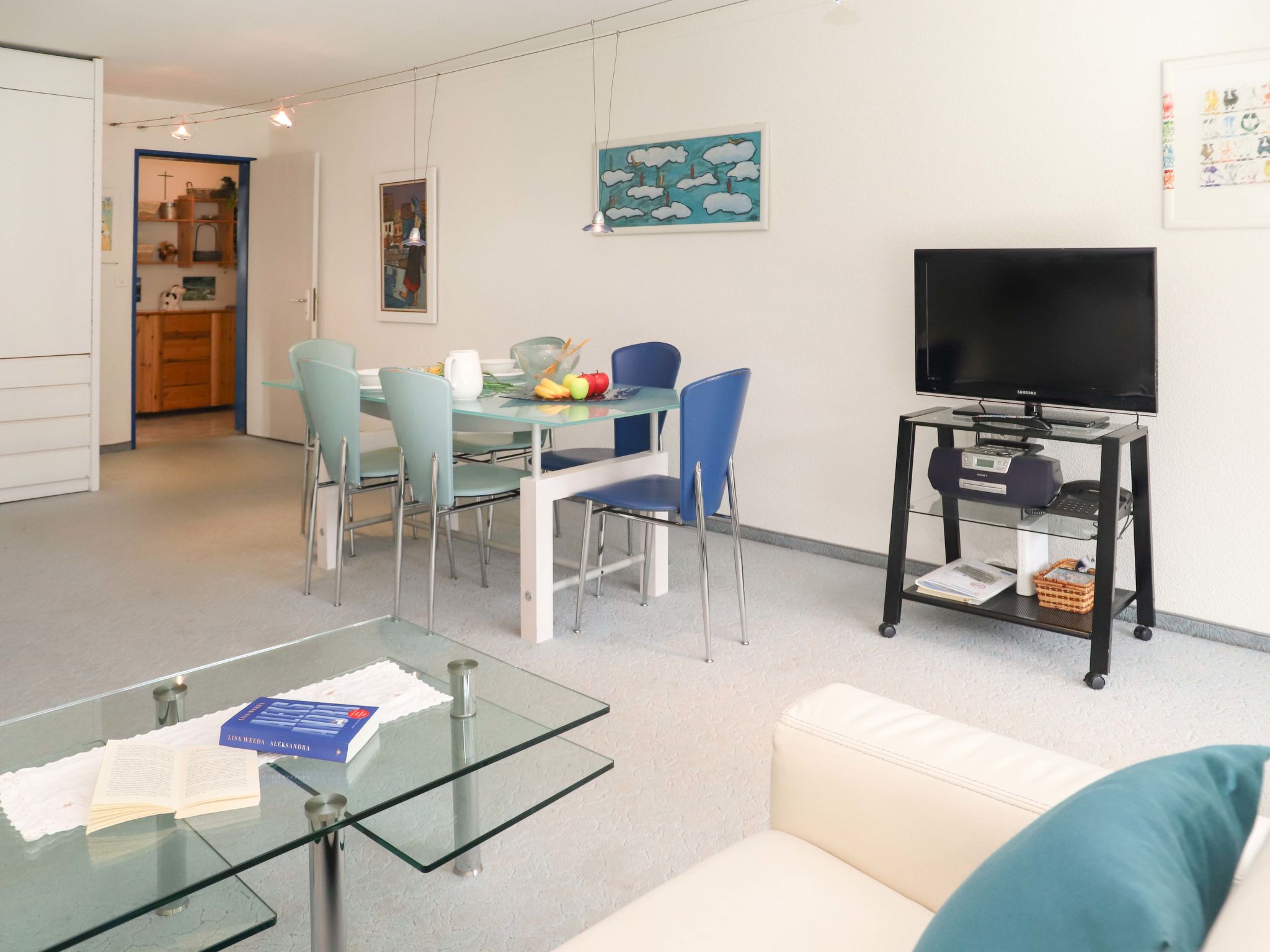 Apt 2 pièces 80 m2 au 2ème étage, situation sud. Grand séjour/salle à manger avec TV et radio. 1 chambre double avec 1 lit double. Cuisine (4 plaques de cuisson, four, lave-vaisselle, micro-ondes, cafetière électrique) avec bar. Bain/WC. Balcon. Meubles de terrasse. Très belle vue sur les montagnes et le Cervin. A disposition: Internet (Connexion WIFI, gratuit). Veuillez noter: logement non-fumeur. Vue magnifique sur le Cervin.