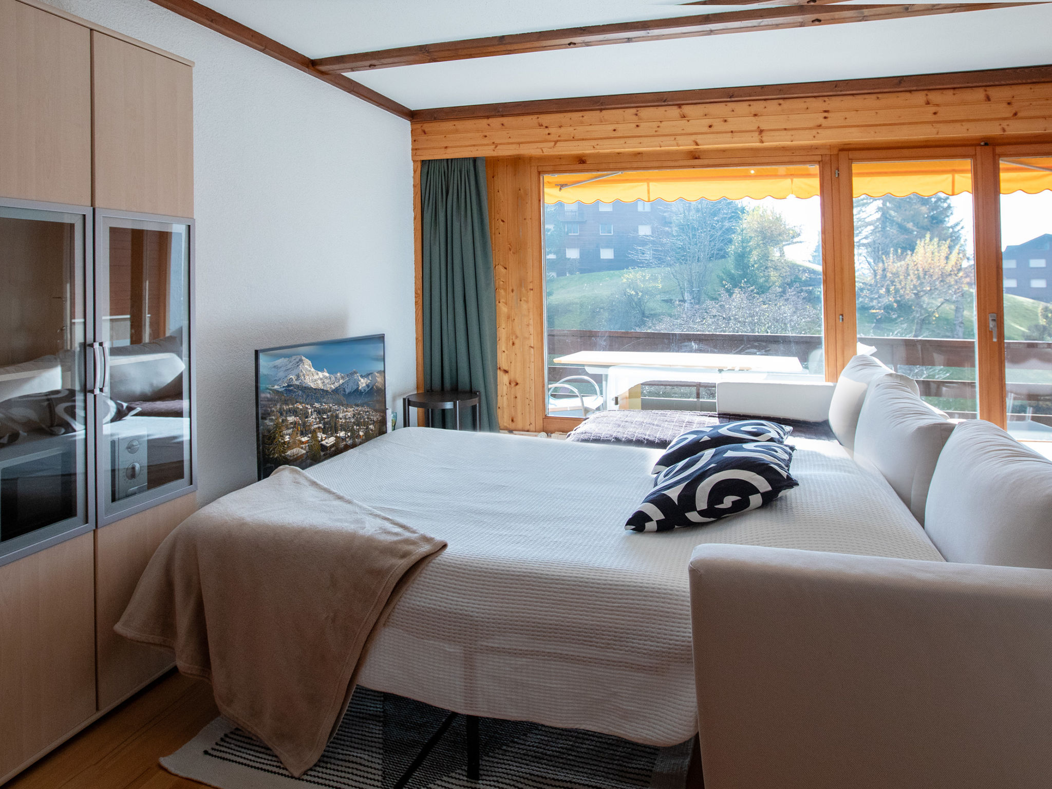 "Opale 24", apt 2 pièces 48 m2 au 2ème étage, situation sud. Partiellement rénové en 2024, aménagement fonctionnel et confortable: séjour/salle à manger avec baie vitrée avec 1 divan-lit (160 cm), table pour les repas et TV (écran plat). Sortie sur le balcon, orientée sud. 1 chambre avec 1 grand-lit (1 x 160 cm). Sortie sur le balcon, orientée sud. Cuisine ouverte (four, lave-vaisselle, 4 plaques vitrocéramiques, grille-pain, bouilloire électrique, micro-ondes, cafetière électrique, Capsules pour machine à café (Nespresso) (NON INCLUSES), appareil à raclette, service à fondue (fondue chinoise, fondue au fromage)). Bain/WC. Grand balcon, situation sud. Mobilier de balcon. Vue partielle sur les montagnes et les alentours. A disposition: Internet (Connexion WIFI, gratuit). Garage No 19 (1 Voiture). Veuillez noter: logement non-fumeur.