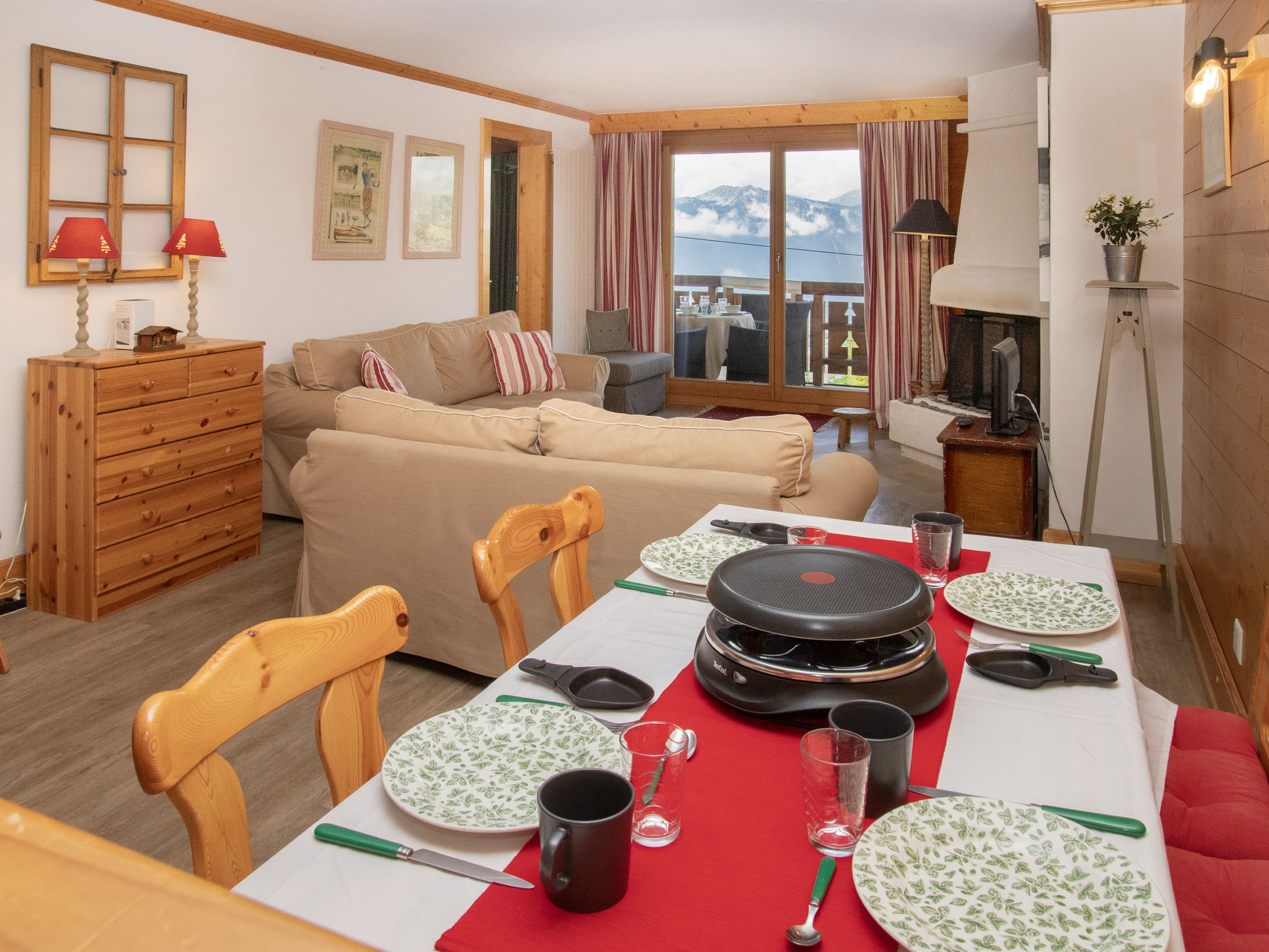 "Résidence Le Bristol 14", apt 3 pièces 65 m2 au 2ème étage, situation sud. Clair, aménagement confortable et agréable: séjour/salle à manger avec cheminée (uniquement à titre de décoration), TV (écran plat). Sortie sur le balcon. 1 chambre, sans fenêtre avec 1 lit double (140 cm, longueur 200 cm), bain/WC. 1 chambre avec 1 grand-lit (160 cm, longueur 200 cm). Sortie sur le balcon. Cuisine ouverte (four, lave-vaisselle, 4 plaques vitrocéramiques, grille-pain, bouilloire électrique, micro-ondes, cafetière électrique, appareil à raclette, service à fondue (fondue au fromage)). WC séparé. Balcon 15 m2, situation sud. Meubles de terrasse. Vue sur les montagnes et les alentours. A disposition: fer à repasser, sèche-cheveux. Internet (Connexion WIFI, gratuit). Garage No 7. Veuillez noter: logement non-fumeur.
