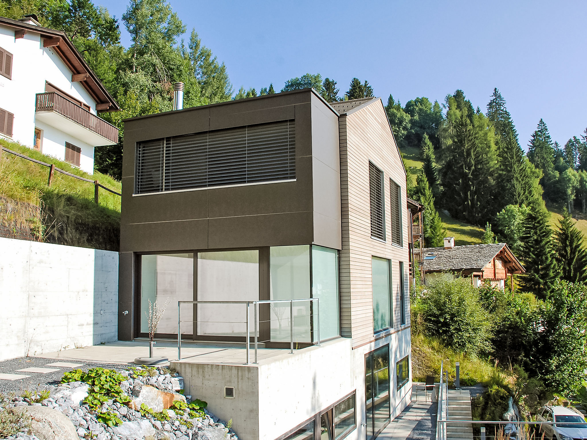 Belle maison à 2 apts moderne, luxueuse "Melina", année de construction 2009. En bordure de la localité, situation isolée, tranquille, ensoleillée sur un versant, dans une impasse, dans la verdure. En commun: barbecue. Infrastructures de la Maison: chauffage central. Accès en voiture jusqu'à la maison par un chemin étroite. Sentier en escalier (15 marches) jusqu'à la maison. Garage individuel. Magasins 500 m, magasin d'alimentation, restaurant, arrêt de bus 200 m, piscine. Terrain de golf (18 trous) 5 km, tennis 2.5 km, téléphérique 2.5 km, téléski 2.5 km. École de ski 2.5 km, ski de fond 500 m.