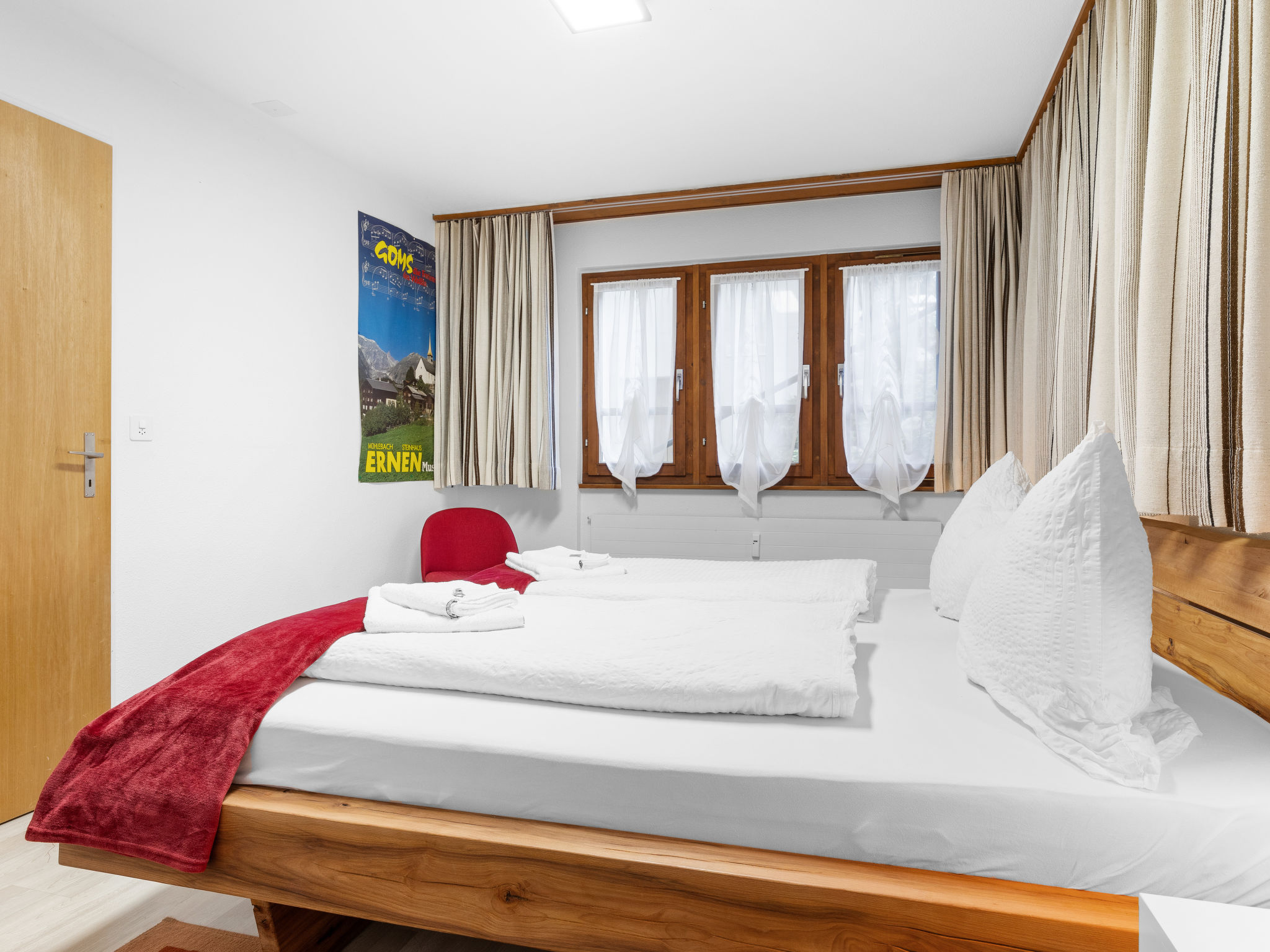 Village de vacances accueillant, rustique "Aragon", 1'200 m au dessus du niveau de la mer. 21 maisons dans le même complexe de vacances. En bordure de la localité, à 500 m du centre d'Ernen, situation tranquille, ensoleillée sur un versant, à 4 km du domaine skiable. En commun: ping-pong, barbecue, four / barbecue en dur, espace de jeux pour les enfants. Infrastructures de la Maison: réduit pour bicyclettes, local pour les skis, chauffage central, lave-linge, sèche-linge (en commun, en sus). Accès en voiture jusqu'à le terrain (route de montagne). En hiver, merci de prévoir des chaînes, en hiver 4x4 recommandé. Garage en commun. Magasins 500 m, arrêt de bus 100 m. Terrain de golf (18 trous) 25 km, tennis 4 km, tennis couvert 4 km, centre sportif 4 km, télécabine 4 km, remontées mécaniques 4 km, location de ski 4 km. Arrêt du ski-bus 100 m, école de ski 4 km, ski de fond 4 km. Les domaines skiables de renommée sont facilement accessibles: Aletsch Arena 4 km, Bellwald 12 km. Région de randonnées: Landschaftspark Binntal 10 km. Le nouveau pont suspendu relie les deux domaines de randonnée d‘Ernen et Bellwald et donne accès à la piste cyclable nationale nr. 1 (route du Rhône du lac glaciaire au lac Léman). Entre Ernen et Mühlebach, le pont donne un accès direct au train de Matterhorn Gotthard.