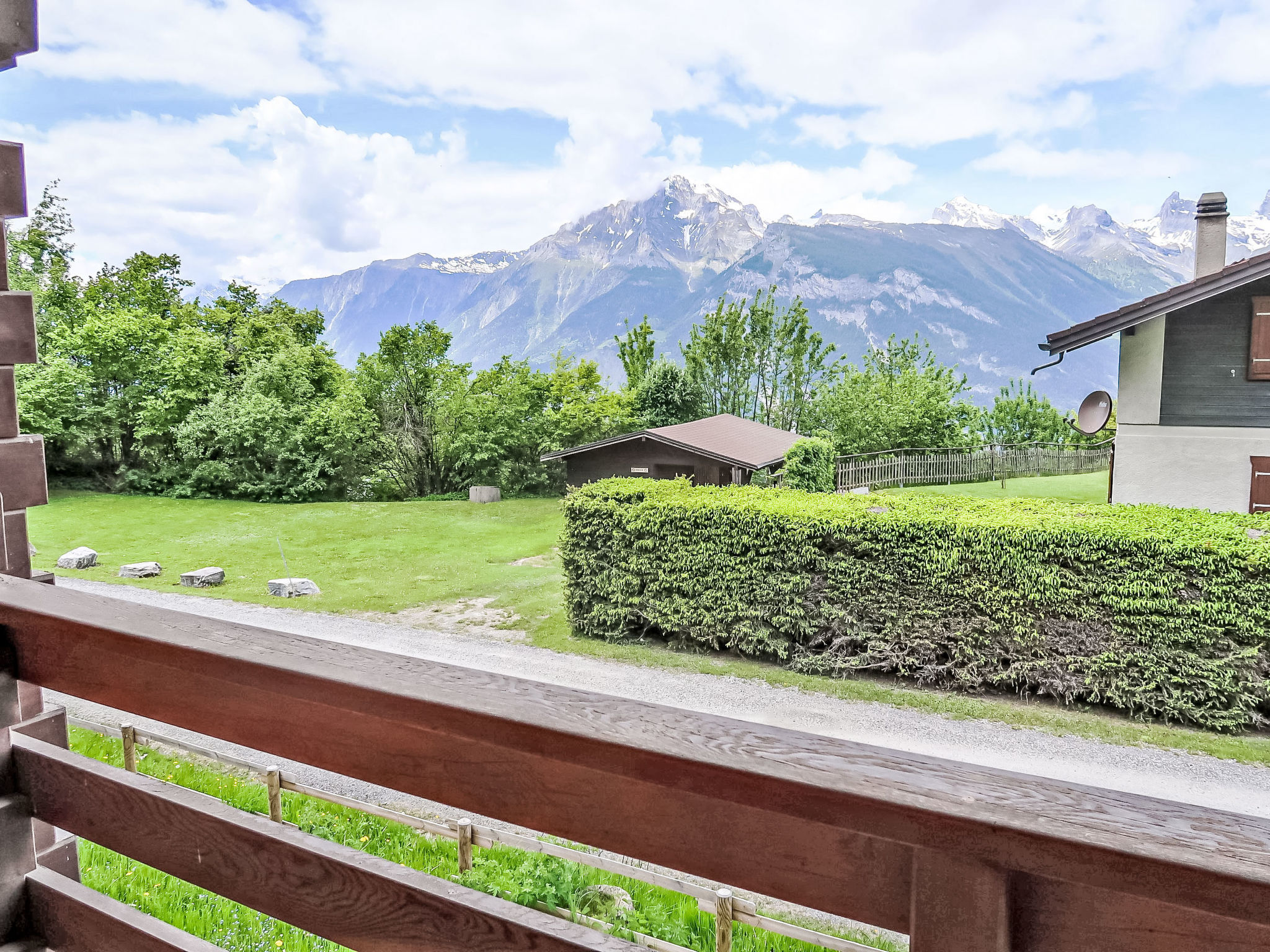 "L'Etape", chalet 5 pièces sur 2 niveaux. Aménagement confortable et de bon goût: séjour/salle à manger avec cheminée. Sortie sur le jardin. Cuisine ouverte (four, lave-vaisselle, 4 plaques vitrocéramiques, micro-ondes, cafetière électrique, Capsules pour machine à café (Saeco), appareil à raclette, service à fondue (fondue au fromage)). 2 douches, 2 WC séparés. À l'étage supérieur: 1 chambre avec 2 lits (90 cm, longueur 200 cm), lavabo. Sortie sur le balcon. 1 chambre avec 2 lits (90 cm, longueur 200 cm), lavabo. 2 chambres, chaque chambre avec: 2 lits (90 cm, longueur 200 cm), lavabo. Bain/WC. Balcon, grand jardin. Meubles de terrasse. Belle vue sur les montagnes et les alentours. A disposition: Internet (Connexion WIFI, gratuit). Place de parking (6 Voitures) près de la maison. Veuillez noter: logement non-fumeur.