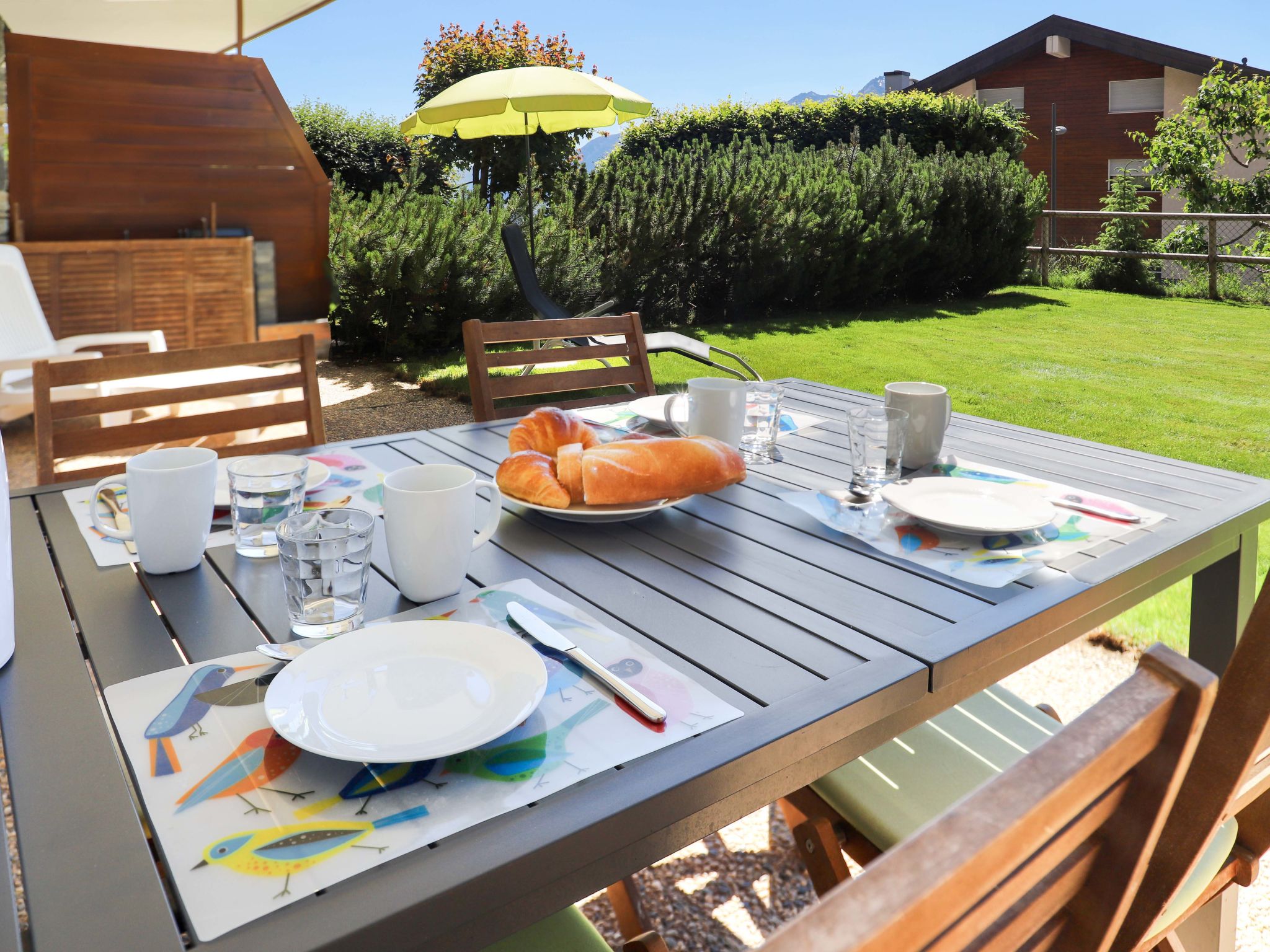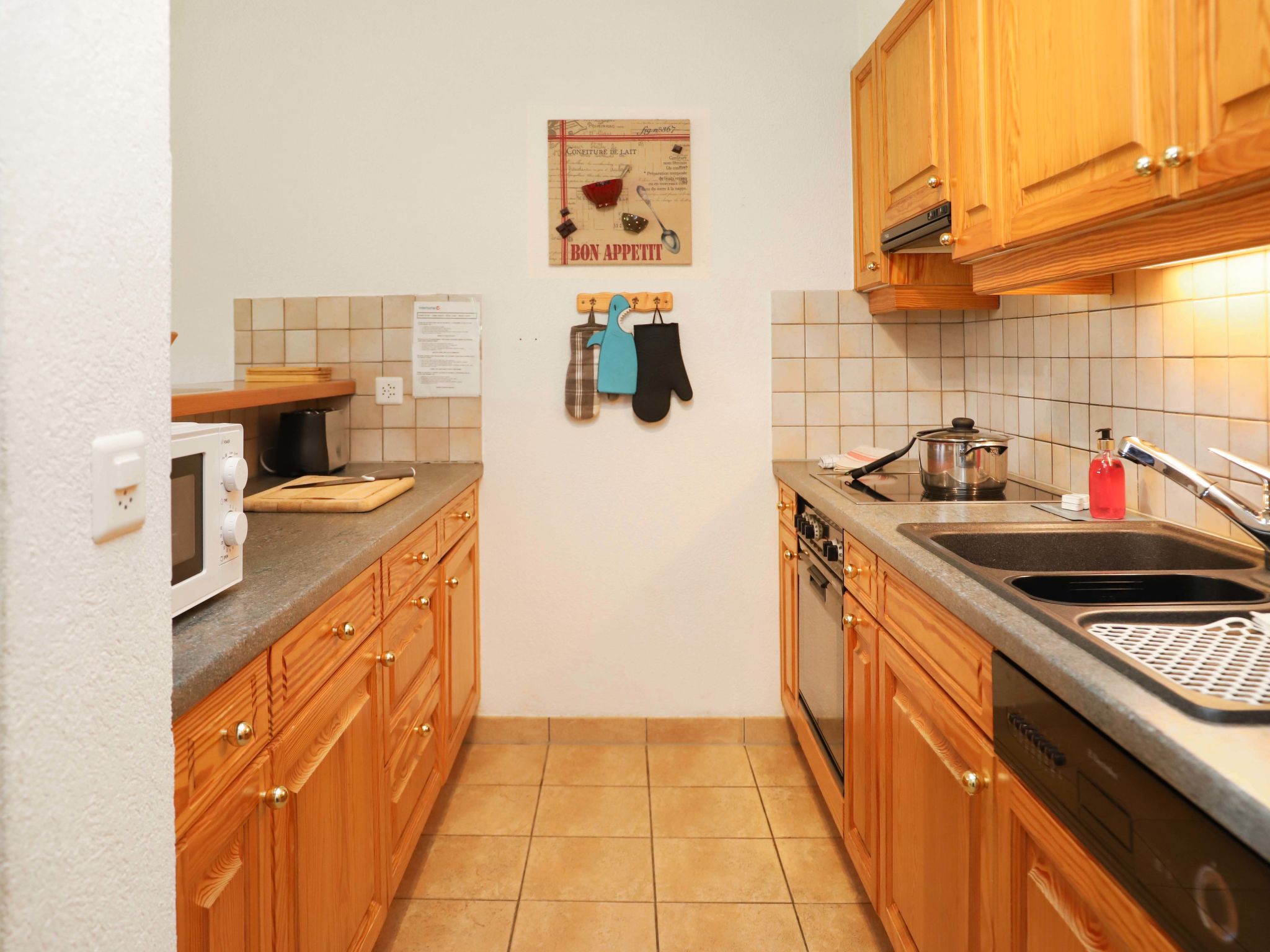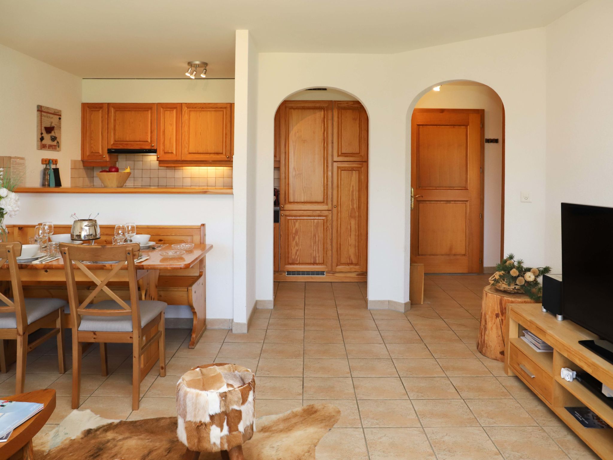 "Cascades d'Eden 2", apt 3 pièces 72 m2, rez-de-chaussée surélevé. Aménagement confortable et agréable: séjour/salle à manger avec cheminée et TV (câblée) (écran plat), chaîne stéréo et DVD. Sortie sur le jardin, sur la terrasse, orientée sud. 1 chambre avec 2 lits (90 cm, longueur 200 cm). Sortie sur la terrasse. 1 chambre avec 1 grand-lit (160 cm, longueur 200 cm), bain/WC. Sortie sur la terrasse. Cuisine ouverte (four, lave-vaisselle, 4 plaques vitrocéramiques, grille-pain, bouilloire électrique, micro-ondes, congélateur, cafetière électrique, Capsules pour machine à café (Nespresso) (NON INCLUSES), appareil à raclette, service à fondue (fondue chinoise, fondue au fromage)). Douche/WC. Chauffage par le sol. Grande terrasse, jardin 60 m2. Meubles de terrasse, barbecue. Belle vue sur les montagnes. A disposition: fer à repasser, lit bébé, sèche-cheveux. Internet (Connexion WIFI, gratuit). Garage No P2, hauteur 200 cm, largeur 260 cm. Veuillez noter: logement non-fumeur. Lit bébé pliable, sans linge de lit et sans duvet.