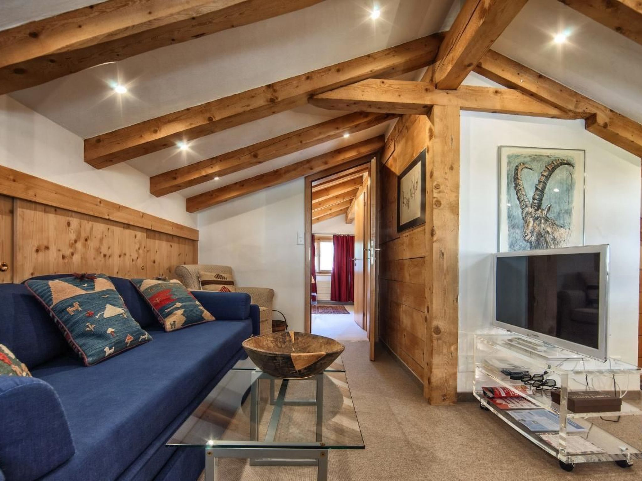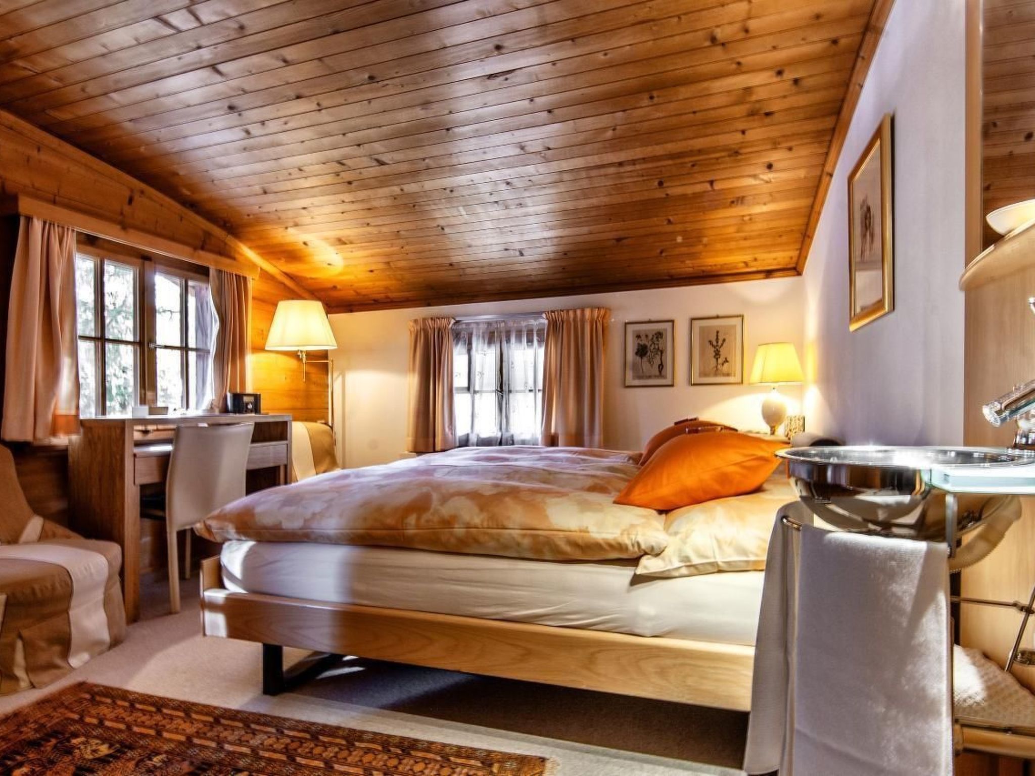 À l'intérieur, le confort vous attend dans un style rustique. Le chalet se répartit sur trois étages et dispose au total de six chambres à coucher, de cinq salles d'eau, ainsi que de toilettes séparées au rez-de-chaussée. La cuisine est un véritable point fort - entièrement équipée d'appareils modernes, y compris un food center, une cuisinière à induction, un four à micro-ondes et bien sûr une machine à espresso/cappuccino ainsi qu'une machine Nespresso supplémentaire pour rendre votre séjour aussi agréable que possible. Un salon confortable avec canapé et télévision se trouve au rez-de-chaussée.