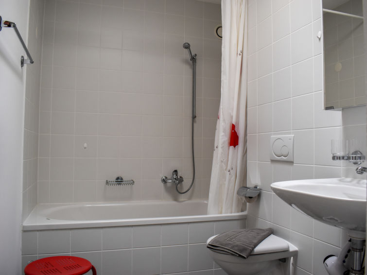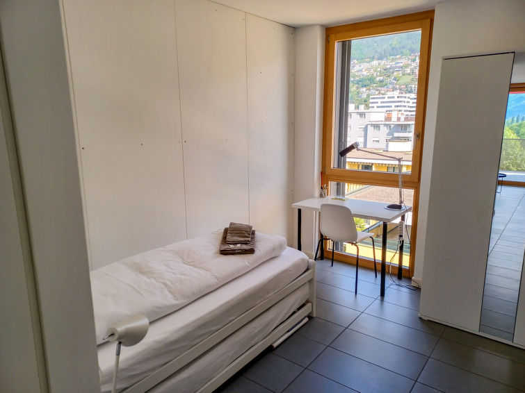 "Orizia", apt 3 pièces 69 m2 au 6ème étage, situation sud. Spacieux et clair, aménagement confortable et moderne: grand séjour/salle à manger ouvert avec baie vitrée avec table pour les repas, TV (câblée) et chaînes de TV internationales (écran plat). Sortie sur la terrasse. 1 chambre double avec 1 lit double (2 x 80 cm, longueur 200 cm). 1 chambre avec rideau avec 1 lit gigogne (2 pers. 2 x 90 cm, longueur 200 cm). Cuisine ouverte (four, lave-vaisselle, 4 plaques vitrocéramiques, grille-pain, bouilloire électrique, micro-ondes, congélateur, cafetière électrique, Capsules pour machine à café (Nespresso) (NON INCLUSES), appareil à raclette, service à fondue (fondue au fromage)). Bain/WC. Chauffage à air chaud, chauffage par le sol. Grande terrasse 36 m2 partiellement, situation sud. Très belle vue panoramique sur les montagnes, les alentours et la localité. A disposition: fer à repasser, chaise haute pour enfant, lit bébé jusqu'à 2 ans, sèche-cheveux. Internet (Connexion WIFI, gratuit). Place de parking No 43. Veuillez noter: logement non-fumeur. NL-00009558