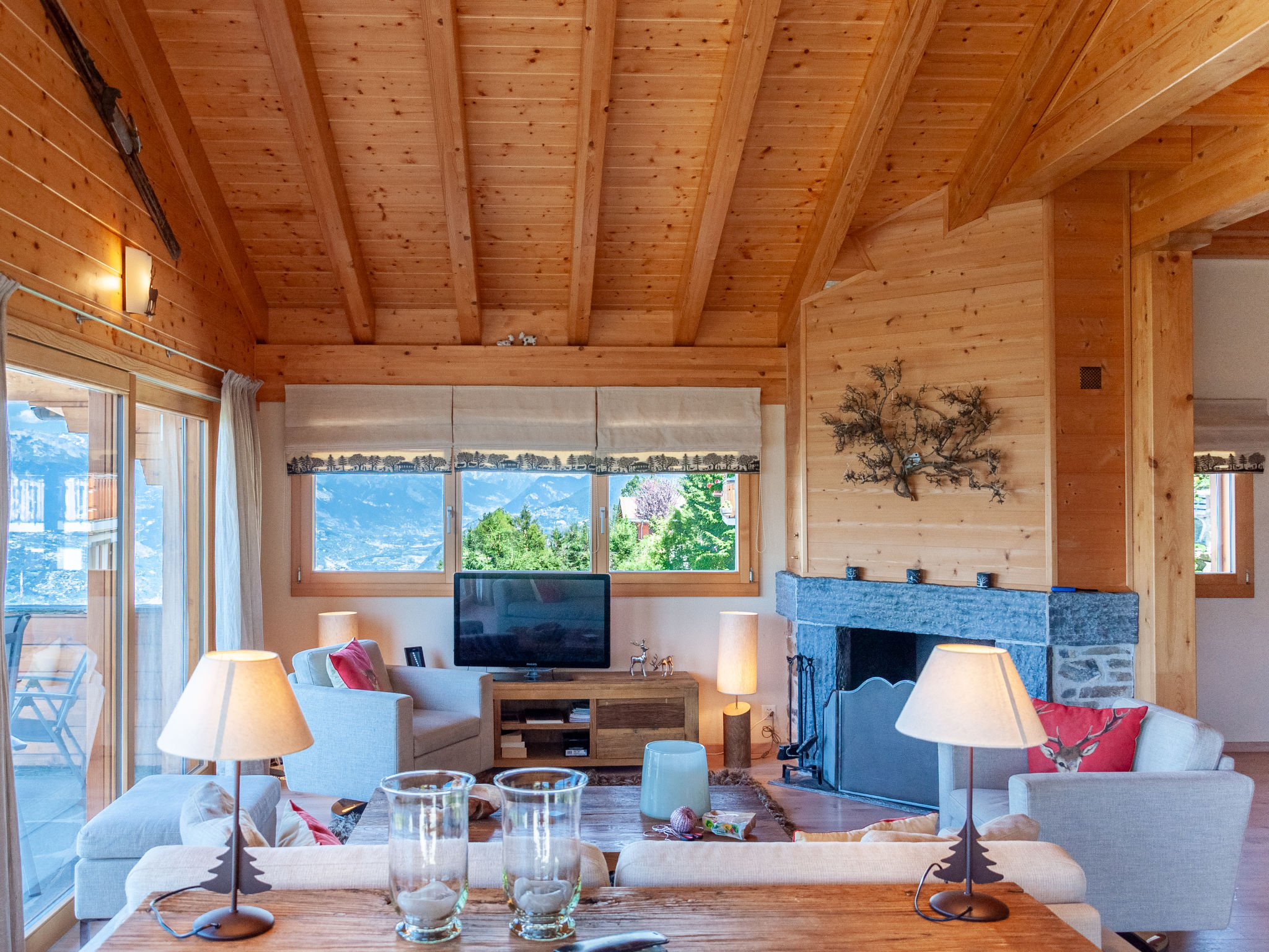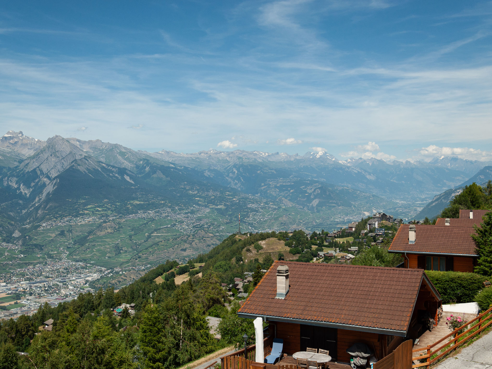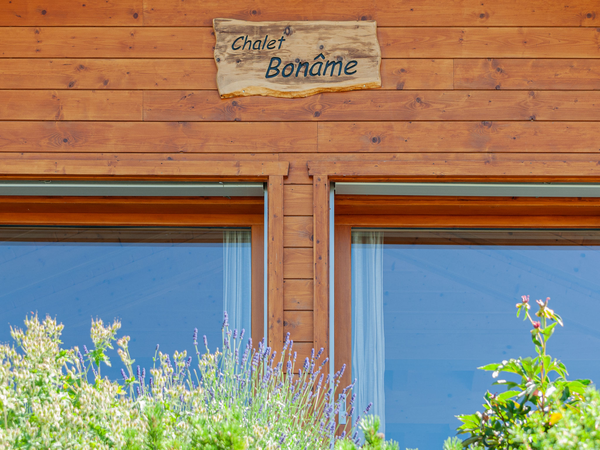 "Bonâme", chalet 5 pièces 188 m2. Spacieux, aménagement de bon goût et plaisant: grand séjour/salle à manger avec cheminée et TV (câblée). Sortie sur la terrasse, orientée nord et orientée ouest. 1 chambre avec 1 lit double (2 x 90 cm, longueur 210 cm), douche/WC et double vasque. Sortie sur la terrasse. Grande cuisine ouverte (four, lave-vaisselle, 5 plaques à induction, grille-pain, bouilloire électrique, micro-ondes, congélateur, cafetière électrique, Capsules pour machine à café (Nespresso) (NON INCLUSES), appareil à raclette, service à fondue (fondue chinoise, fondue au fromage)) avec bar. À l'étage inférieur: grande entrée. WC séparé. À l'étage supérieur: 1 chambre avec 2 lits (90 cm, longueur 210 cm), douche/WC. 2 chambres, chaque chambre avec: 2 lits (90 cm, longueur 210 cm). Bain/douche/WC. Grande terrasse, situation nord et situation ouest. Meubles de terrasse, chaises longues (2). Très belle vue panoramique sur les montagnes. A disposition: lave-linge, sèche-linge. Internet (Connexion WIFI, gratuit). Place de parking, garage (2 Voitures), hauteur 220 cm, largeur 520 cm. Veuillez noter: non recommandé pour des enfants en bas âge non adapté aux enfants de moins de 6 ans. Logement non-fumeur.