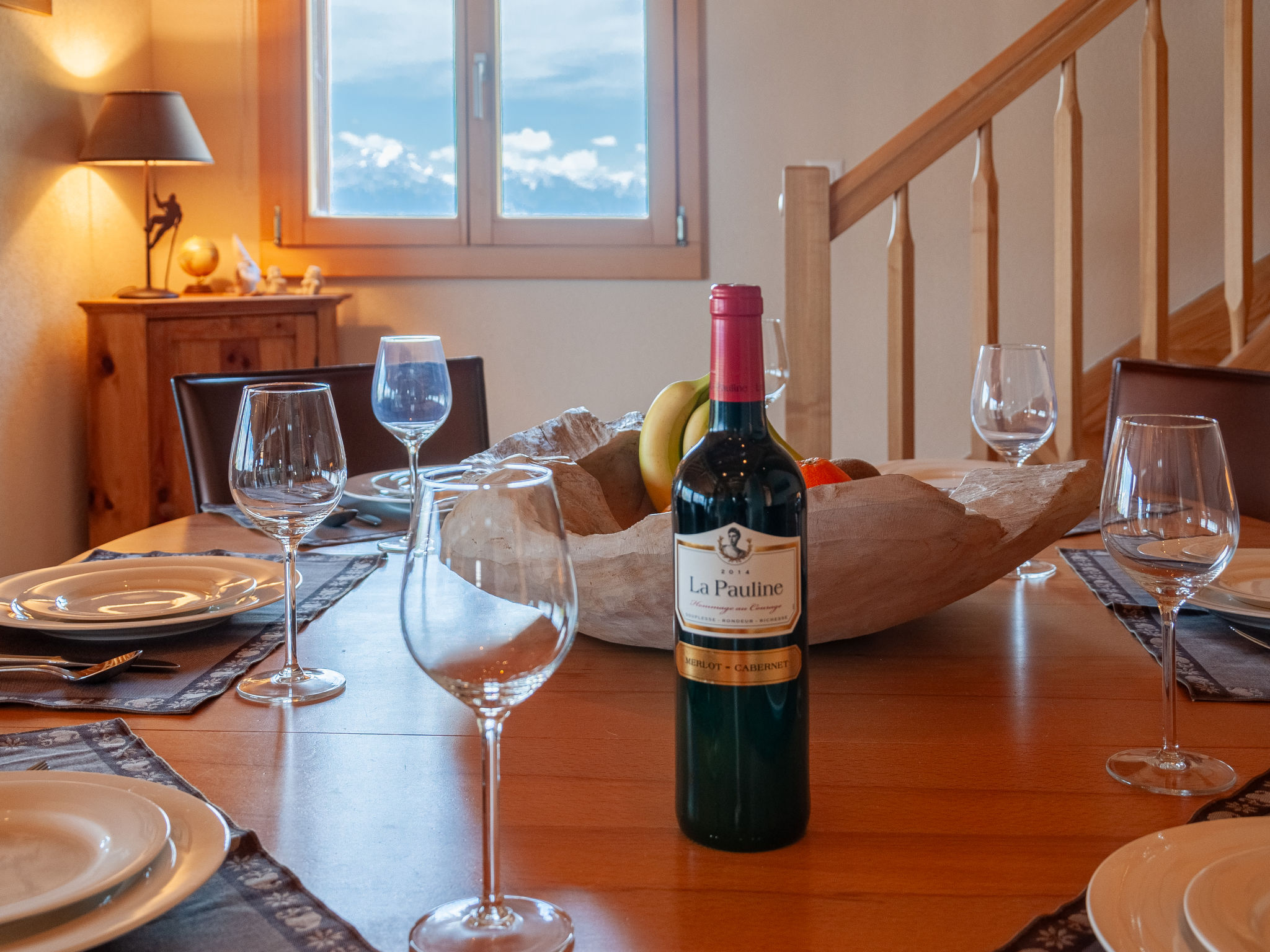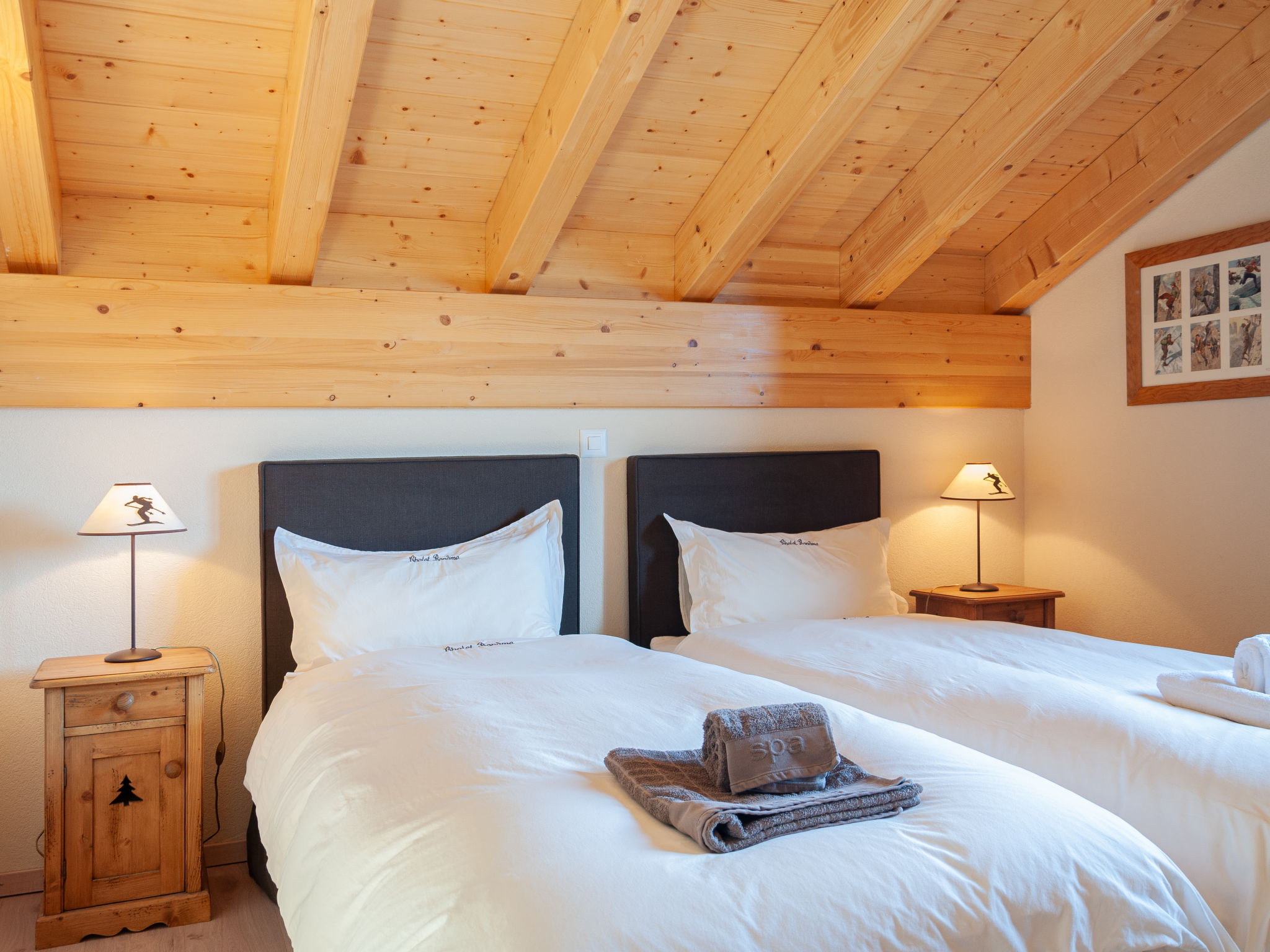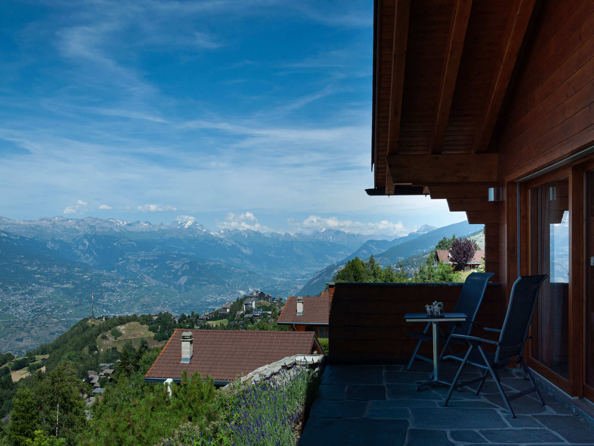 "Bonâme", chalet 5 pièces 188 m2. Spacieux, aménagement de bon goût et plaisant: grand séjour/salle à manger avec cheminée et TV (câblée). Sortie sur la terrasse, orientée nord et orientée ouest. 1 chambre avec 1 lit double (2 x 90 cm, longueur 210 cm), douche/WC et double vasque. Sortie sur la terrasse. Grande cuisine ouverte (four, lave-vaisselle, 5 plaques à induction, grille-pain, bouilloire électrique, micro-ondes, congélateur, cafetière électrique, Capsules pour machine à café (Nespresso) (NON INCLUSES), appareil à raclette, service à fondue (fondue chinoise, fondue au fromage)) avec bar. À l'étage inférieur: grande entrée. WC séparé. À l'étage supérieur: 1 chambre avec 2 lits (90 cm, longueur 210 cm), douche/WC. 2 chambres, chaque chambre avec: 2 lits (90 cm, longueur 210 cm). Bain/douche/WC. Grande terrasse, situation nord et situation ouest. Meubles de terrasse, chaises longues (2). Très belle vue panoramique sur les montagnes. A disposition: lave-linge, sèche-linge. Internet (Connexion WIFI, gratuit). Place de parking, garage (2 Voitures), hauteur 220 cm, largeur 520 cm. Veuillez noter: non recommandé pour des enfants en bas âge non adapté aux enfants de moins de 6 ans. Logement non-fumeur.