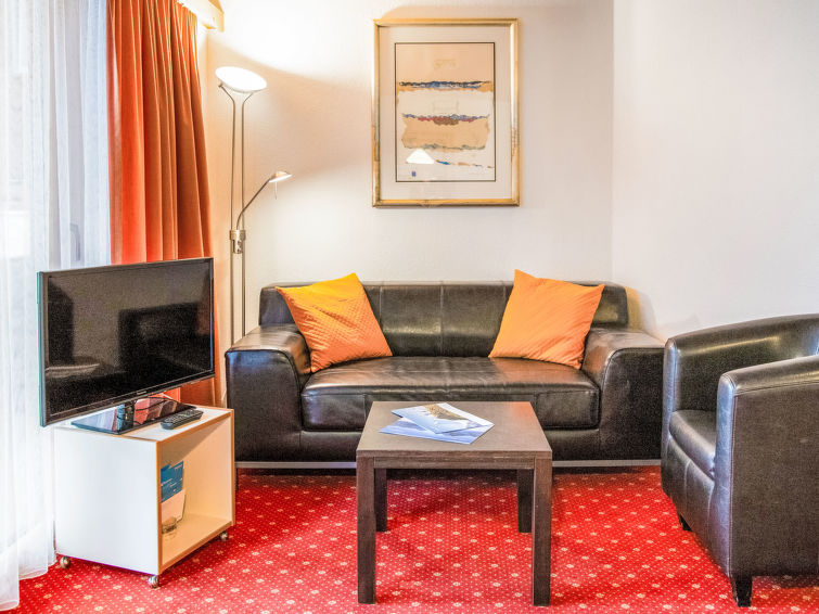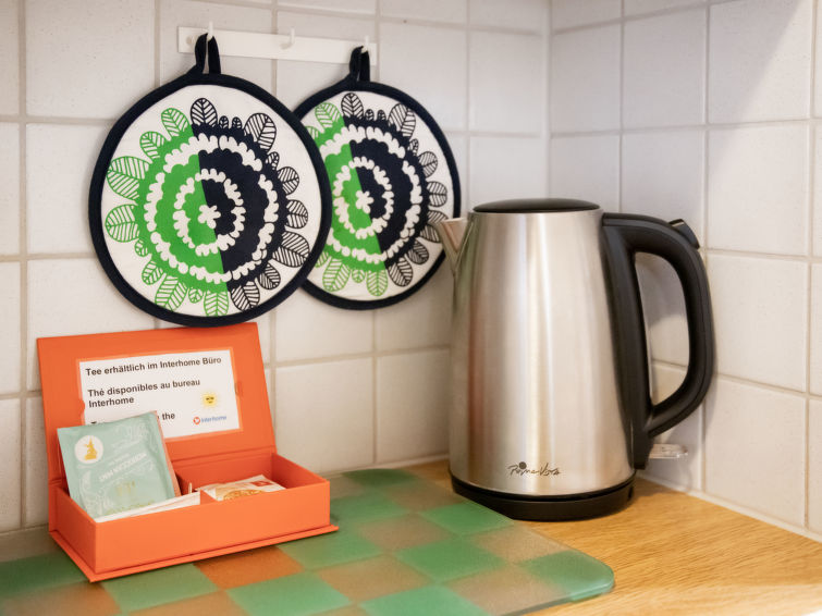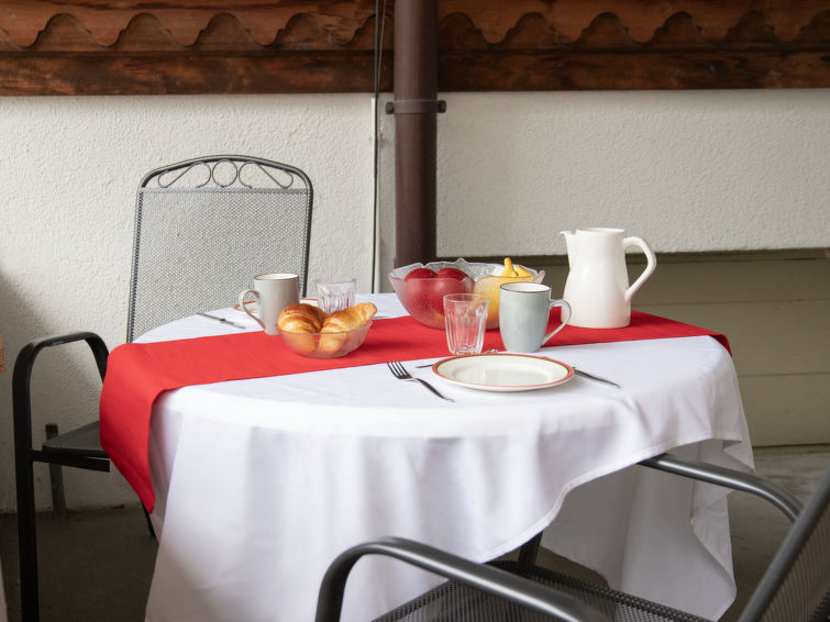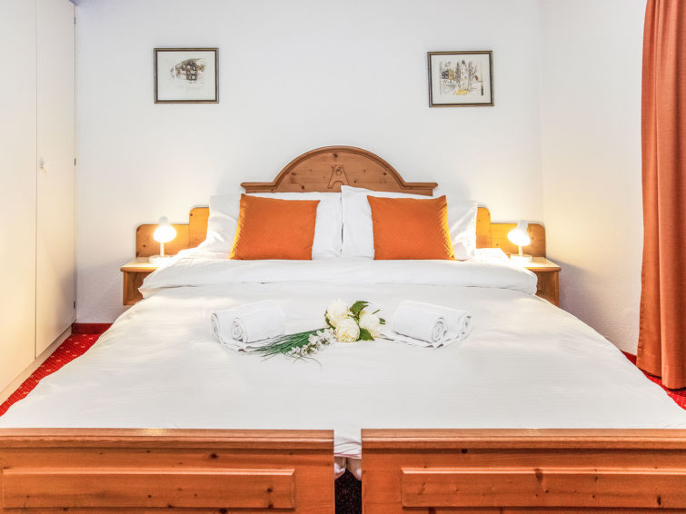 Apt 2 pièces 48 m2 au 1er étage, situation sud. Séjour/salle à manger avec TV (câblée) (écran plat). Sortie sur le balcon, orientée sud. 1 chambre double. Cuisine ouverte (four, 4 plaques vitrocéramiques, grille-pain, bouilloire électrique, cafetière électrique). Bain/WC. Mobilier de balcon. Belle vue sur les montagnes. A disposition: sèche-cheveux. Internet (Connexion WIFI, gratuit). Veuillez noter: logement non-fumeur. Maximum 1 animal/ chien autorisé.