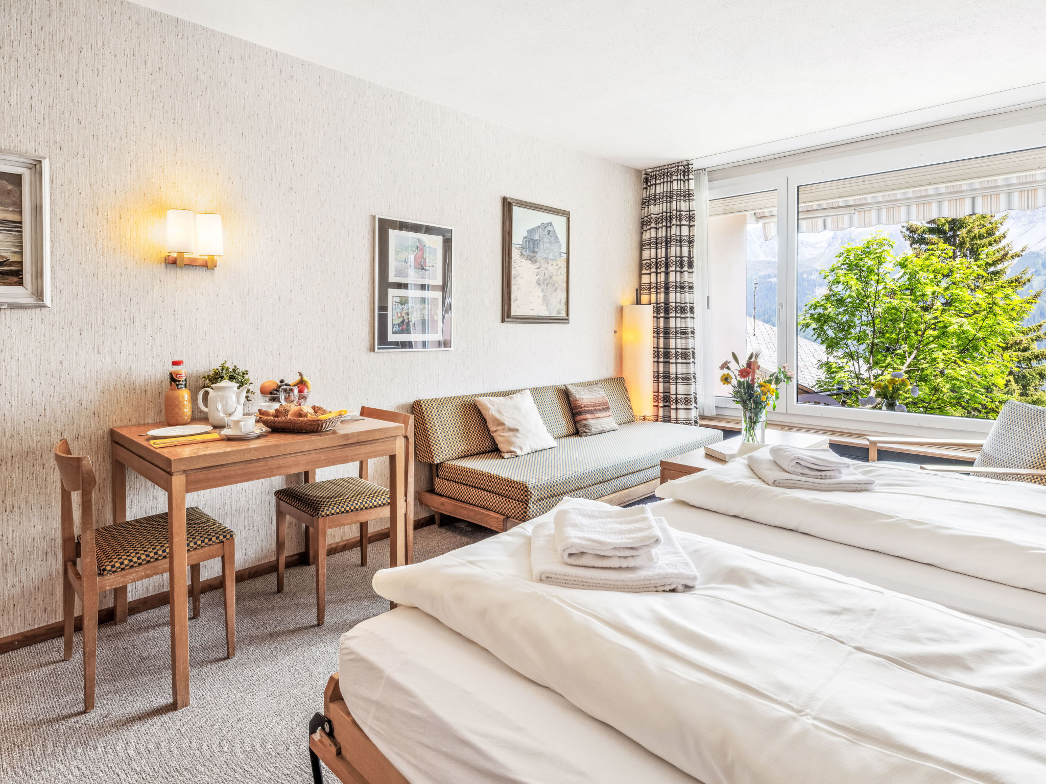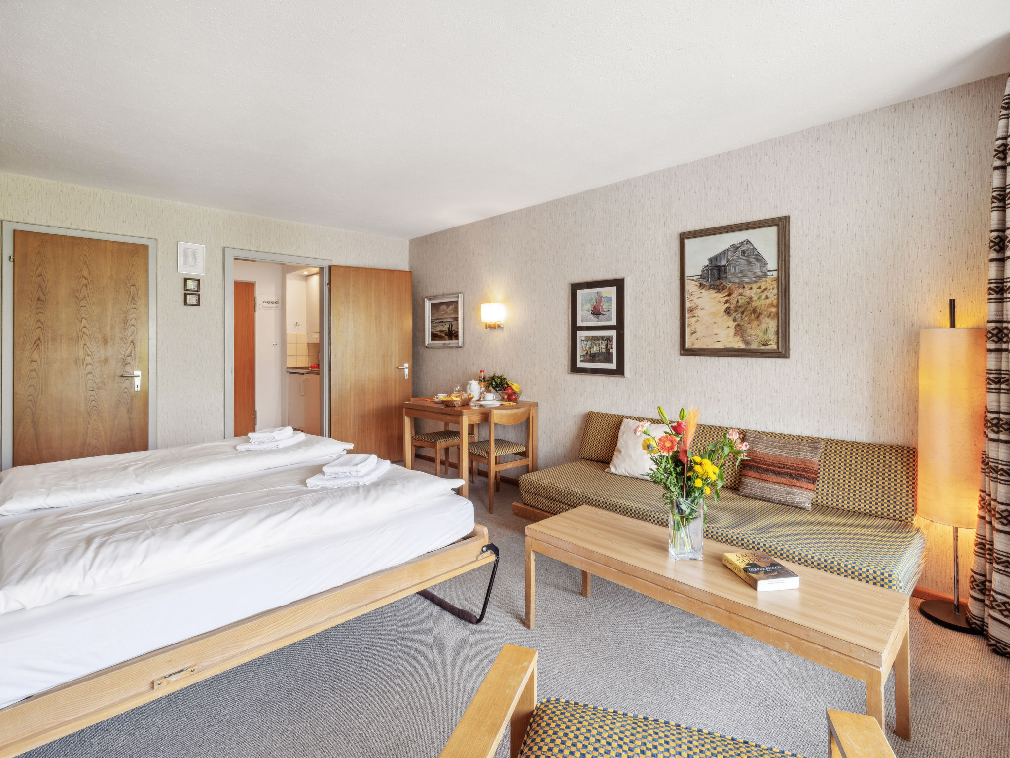 "Promenade Apt 003" studio 28 m2, au rez-de-chaussée. Aménagement plaisant: séjour/salle à manger avec 2 lits armoires, TV (satellite) et radio. Sortie sur le jardinet. Coin cuisine (3 plaques de cuisson, four). Baignoire sabot/WC. Jardinet, situation est. Belle vue sur les montagnes, les alentours et la localité. A disposition: Internet (Connexion WIFI, gratuit). Veuillez noter: logement non-fumeur.