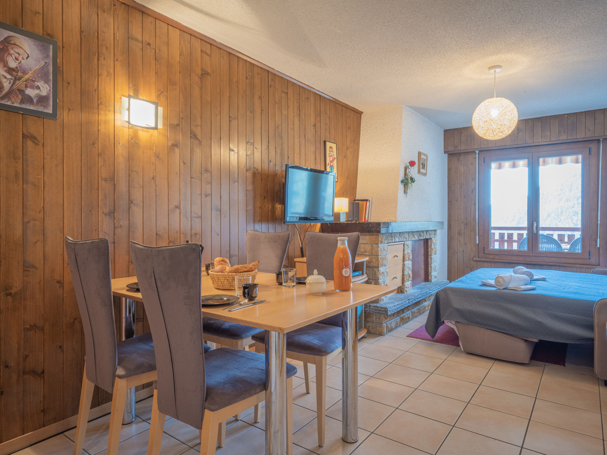 "Domino B 48", apt 2 pièces 40 m2 au 3ème étage, situation sud-est. Aménagement confortable: séjour/salle à manger avec 1 divan-lit double (1 x 140 cm, longueur 190 cm), table pour les repas, TV (câblée), vidéo et chaîne stéréo. 1 chambre avec 1 grand-lit (160 cm, longueur 190 cm). Coin cuisine (4 plaques de cuisson, four, lave-vaisselle, cafetière électrique, Capsules pour machine à café (Dolce Gusto) (NON INCLUSES)). Bain/WC. Balcon 11 m2. Meubles de terrasse, chaises longues (2). Très belle vue sur les montagnes et la vallée. A disposition: lit bébé jusqu'à 3 ans (en sus). Internet (Connexion WIFI). Garage No 48. Veuillez noter: logement non-fumeur. Maximum 1 animal/ chien de petite taille autorisé.