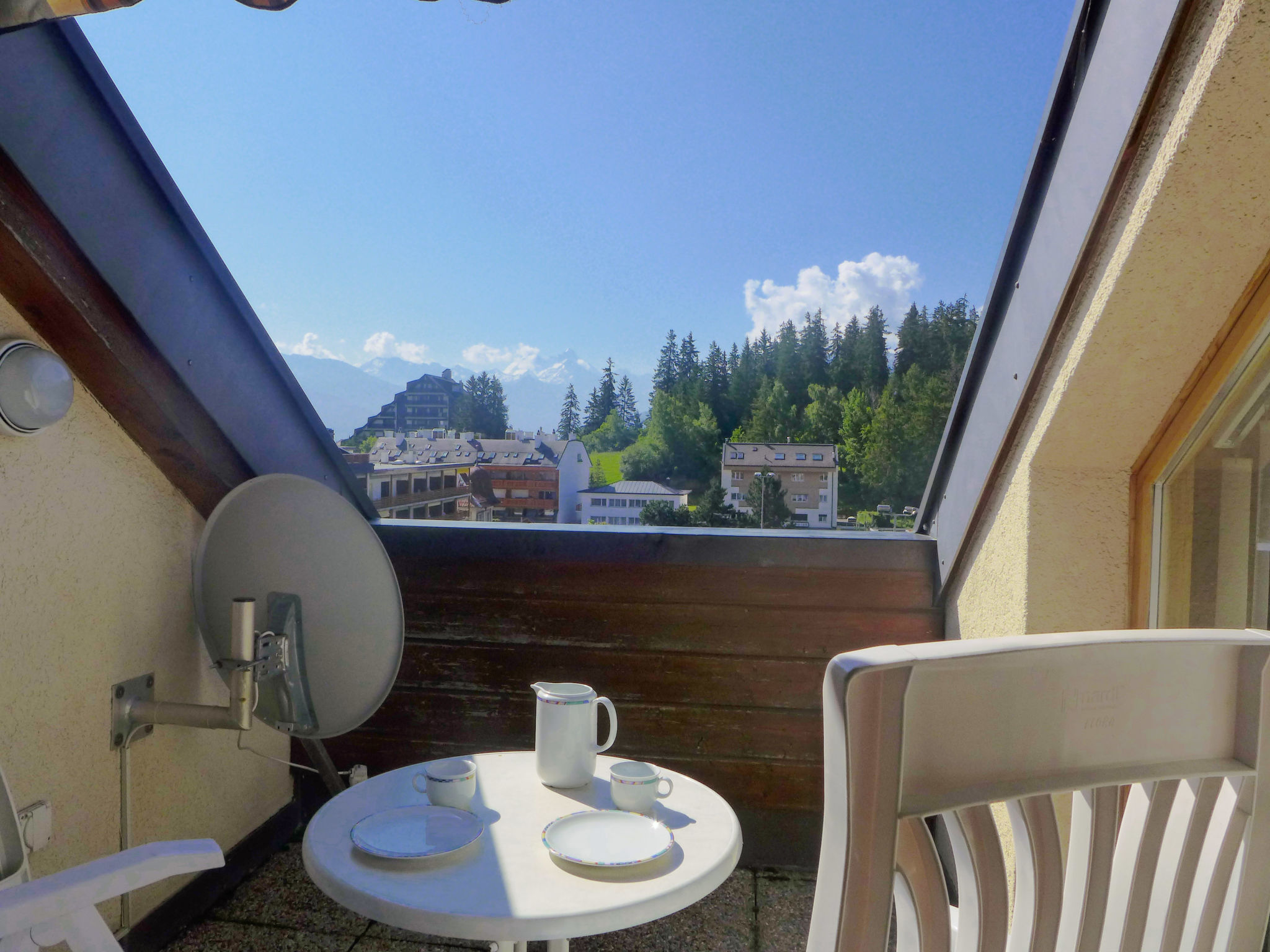 "Les Vignettes 42", apt sous les toits 2 pièces 60 m2 au 4ème étage. Mansardé, aménagement agréable: séjour/salle à manger avec TV (câblée). Sortie sur le balcon, orientée sud. 1 chambre avec fenêtre sous le toit avec 2 lits (90 cm, longueur 200 cm). Cuisine ouverte (four, lave-vaisselle, 4 plaques vitrocéramiques, grille-pain, bouilloire électrique, congélateur, cafetière électrique, Capsules pour machine à café (Nespresso) (NON INCLUSES), appareil à raclette, service à fondue (fondue au fromage)). Bain/WC. Chauffage par le sol. Balcon 5 m2. Mobilier de balcon. Belle vue sur les montagnes, les alentours et la forêt. A disposition: fer à repasser, sèche-cheveux. Internet (Connexion WIFI, gratuit). Maximum 1 animal/ chien autorisé. Cheminée uniquement à titre de décoration.