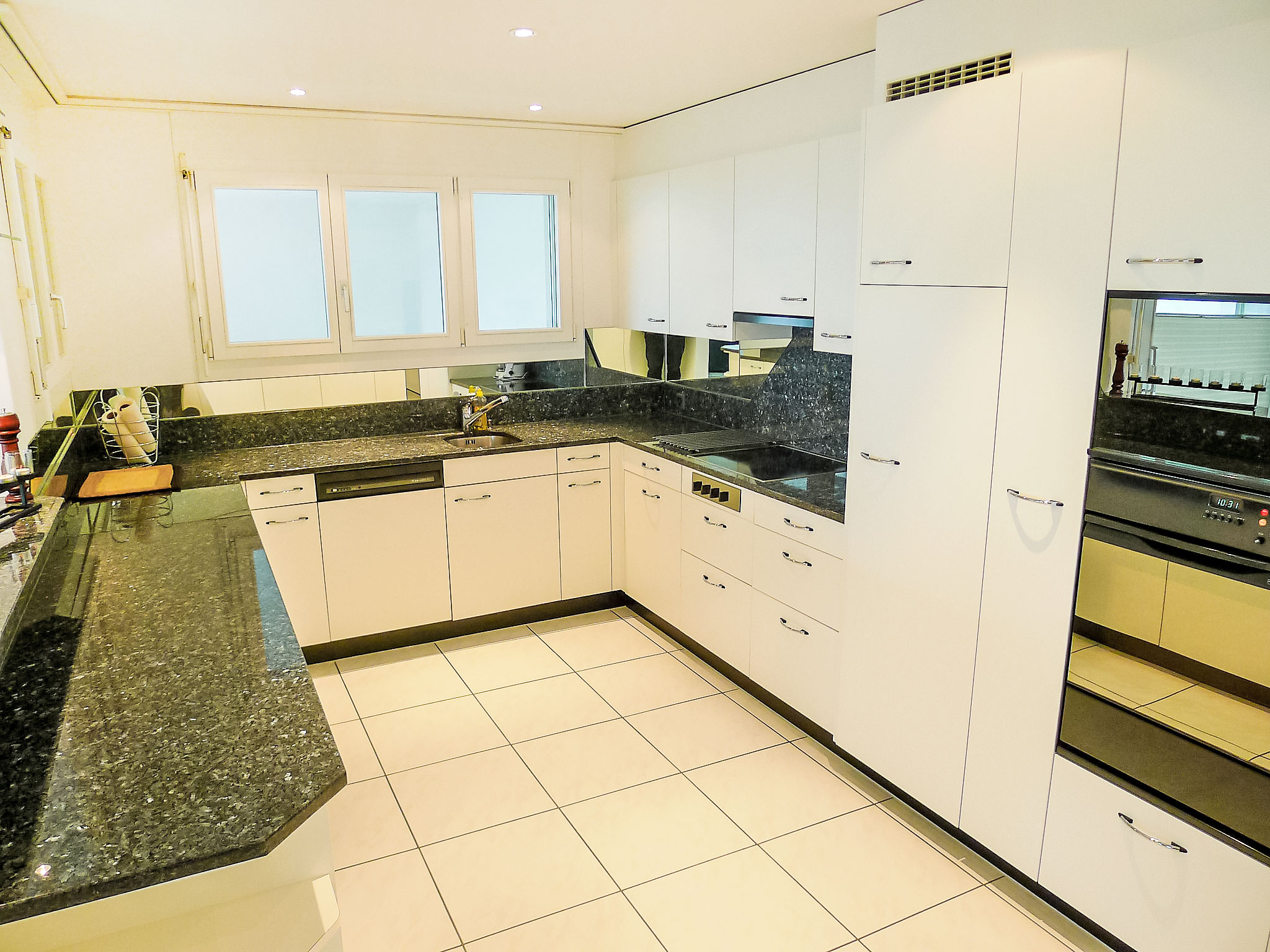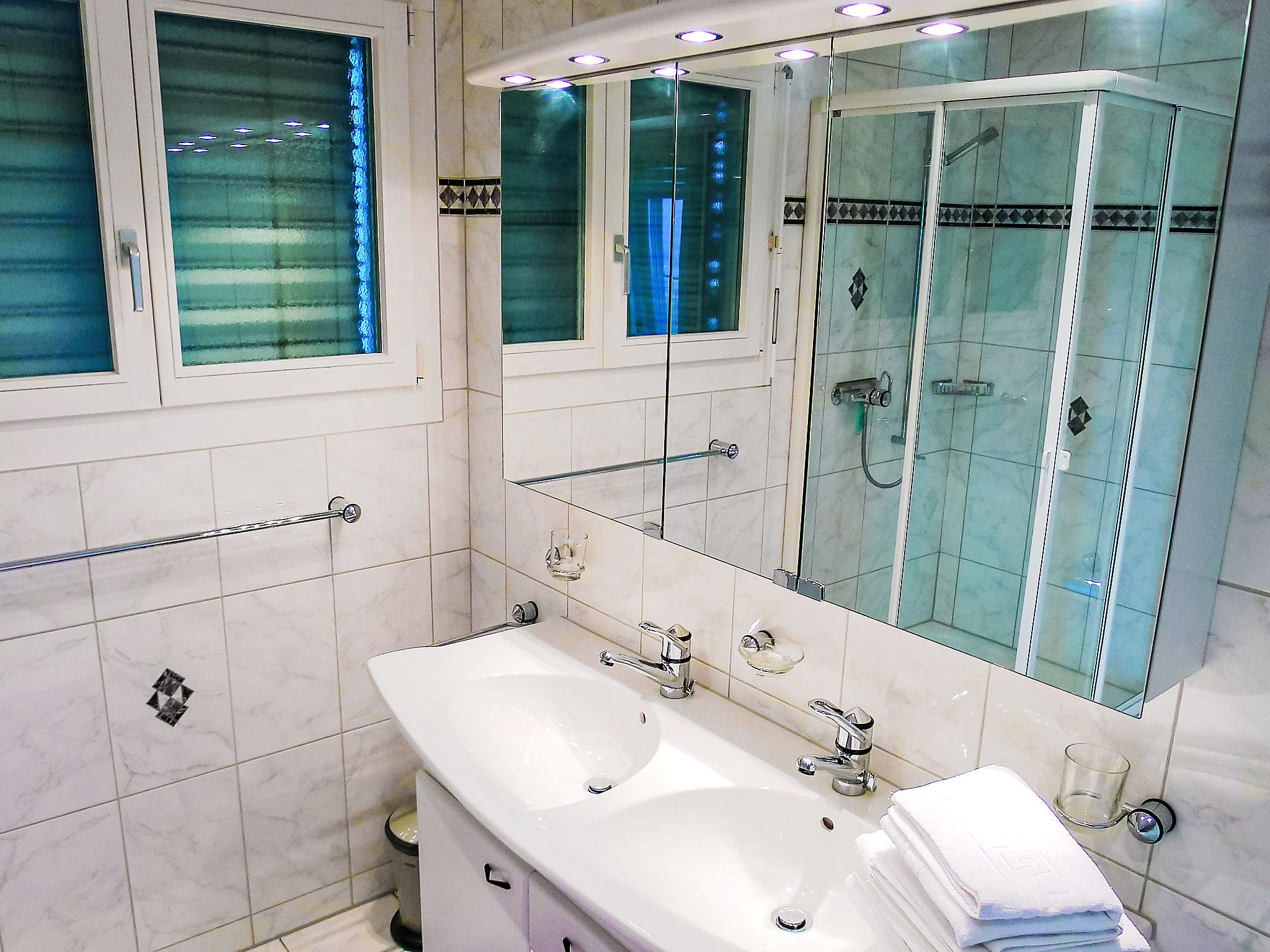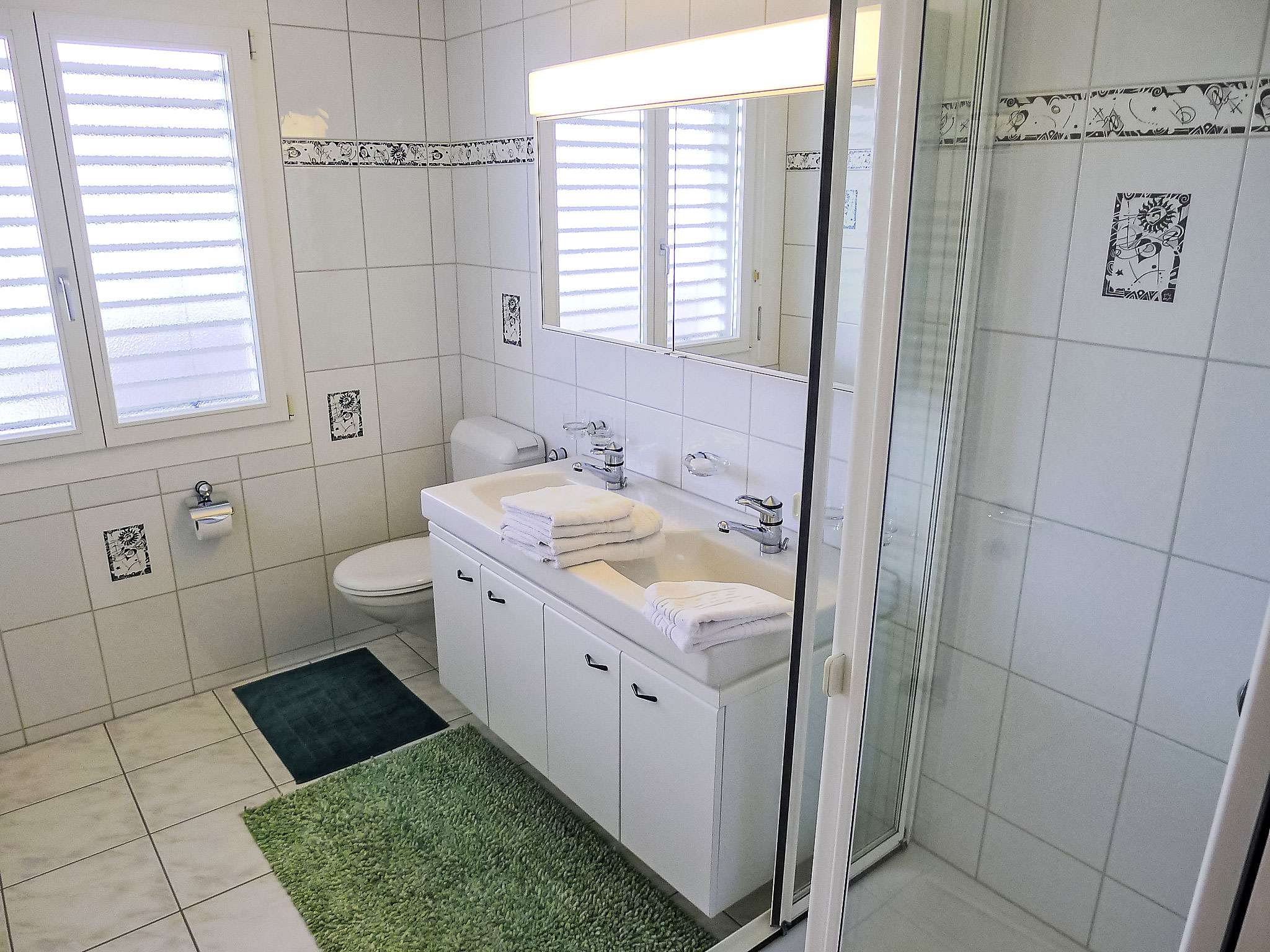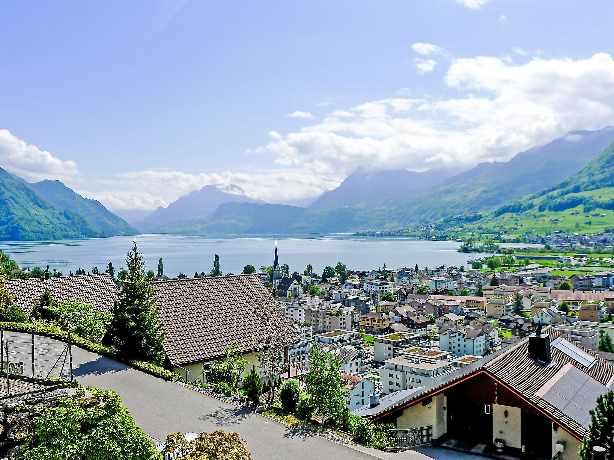 Apt 4 pièces 120 m2 sur 2 niveaux. Partiellement rénové en 2012, aménagement confortable et agréable: séjour/salle à manger avec coin repas, TV (câblée), écran plat et chaîne stéréo. Sortie sur la terrasse. 1 chambre double avec 1 lit double, bain/douche/WC et double vasque. Sortie sur la terrasse. Cuisine ouverte (four, lave-vaisselle, 4 plaques vitrocéramiques, micro-ondes, cafetière électrique, appareil à raclette, service à fondue (fondue au fromage)) avec bar. WC séparé. À l'étage inférieur: salon avec TV (câblée) (écran plat), chaîne stéréo. 1 chambre double avec 1 lit double. Coin cuisine (four, lave-vaisselle, 2 plaques vitrocéramiques, cafetière électrique). Sortie sur la terrasse. Douche/WC. 2 grandes terrasses. Meubles de terrasse, barbecue, chaises longues, jardin d'hiver. Superbe vue panoramique sur le lac, les montagnes et les alentours. A disposition: lave-linge, sèche-linge, fer à repasser. Internet (Connexion WIFI, gratuit). Place de parking près de la maison. Veuillez noter: logement non-fumeur. Veuillez noter: il s´agit de 2 appartements avec une porte communiquante ouverte (CH6373.100.1 +2).