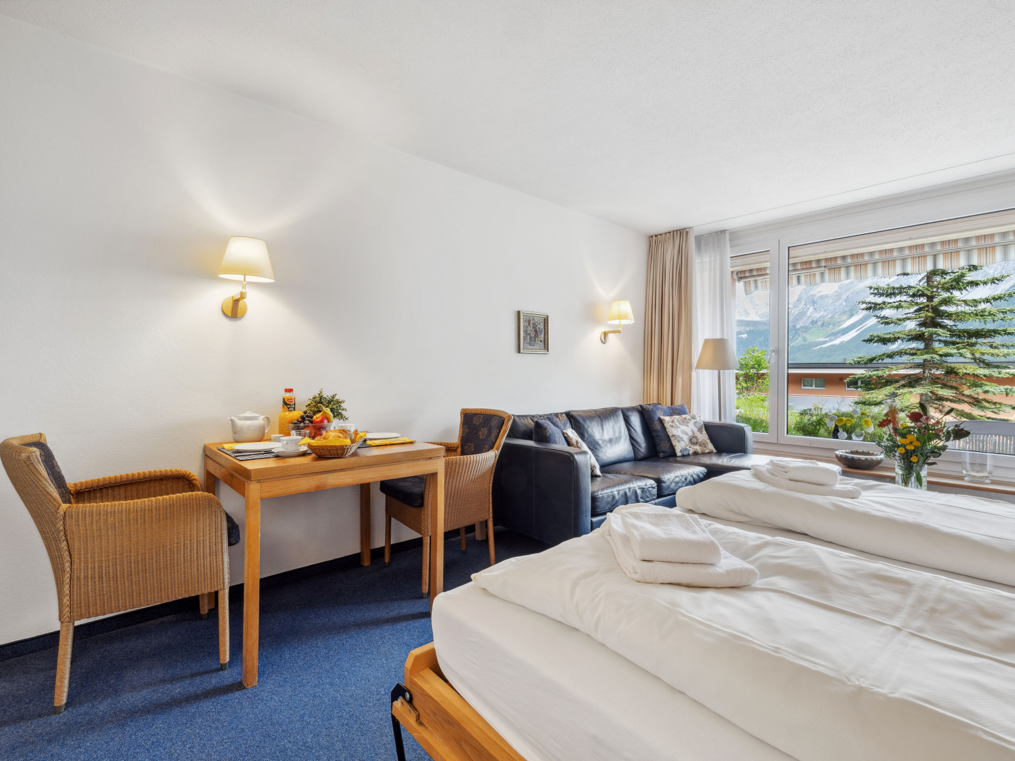 "Promenade Apt 009" studio 28 m2, au rez-de-chaussée. Aménagement plaisant: séjour/salle à manger avec 2 lits armoires et TV (satellite) (écran plat), radio. Sortie sur le jardinet. Coin cuisine (lave-vaisselle, 4 plaques vitrocéramiques). Douche/WC. Jardinet, situation est. Belle vue sur les montagnes, les alentours et la localité. A disposition: Internet (Connexion WIFI, gratuit). Veuillez noter: logement non-fumeur.