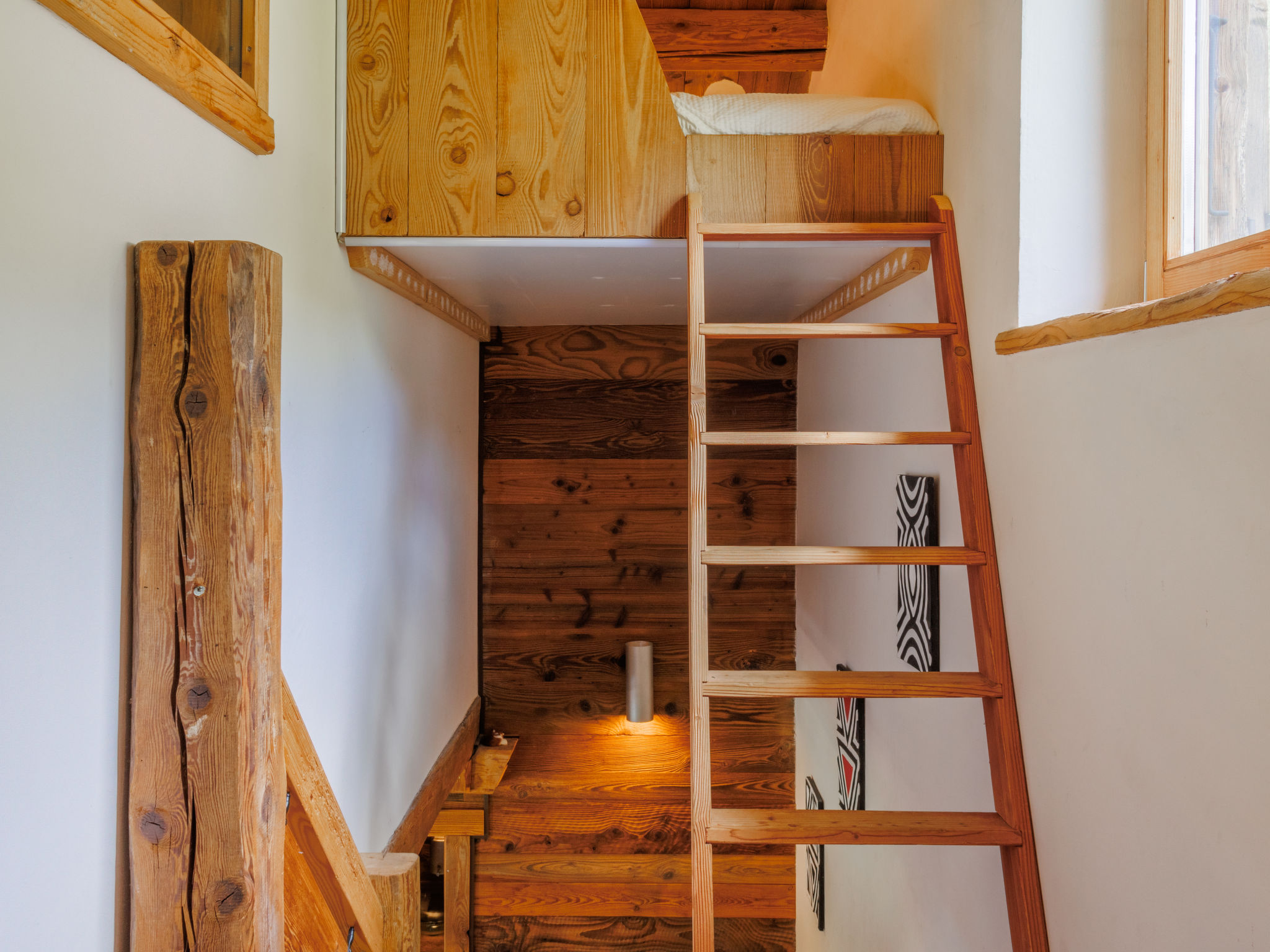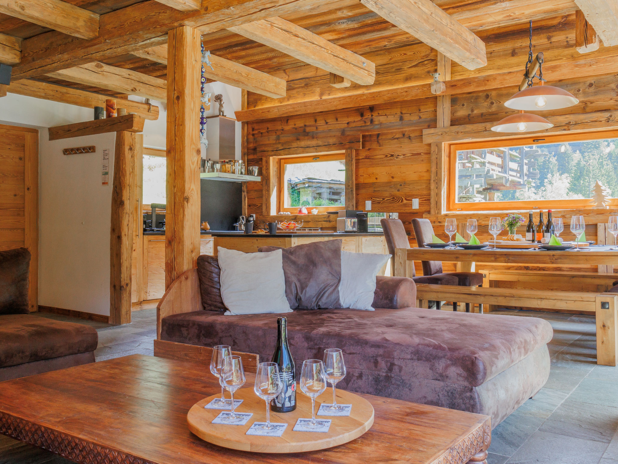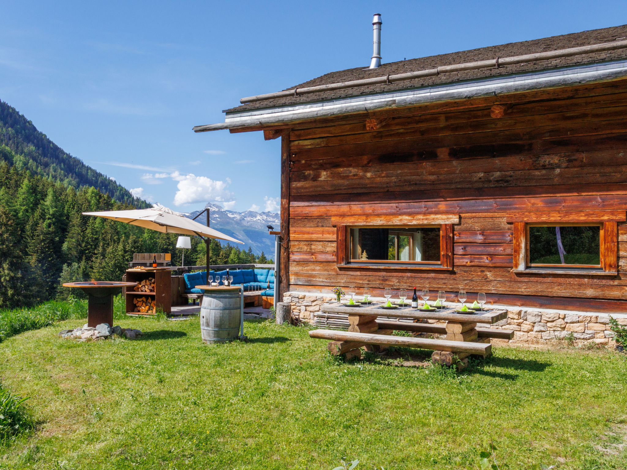 "Chalet Gaea", chalet 5 pièces 140 m2 sur 3 niveaux, situation nord-est. Logement idéal pour 6 adultes + 3 enfants. Partiellement mansardé, aménagement très confortable et agréable: entrée. Séjour/salle à manger avec poêle suédois et Home cinéma. Sortie sur la terrasse. Cuisine ouverte (four, lave-vaisselle, 4 plaques à induction, grille-pain, bouilloire électrique, micro-ondes, congélateur, cafetière électrique, Capsules pour machine à café (Nespresso) (NON INCLUSES), appareil à raclette, service à fondue (fondue au fromage)). Bain/douche/WC. À l'étage inférieur: 1 chambre avec 1 grand-lit (180 cm, longueur 200 cm), bain/douche/WC. À l'étage supérieur: 1 chambre avec 1 lit (90 cm, longueur 200 cm), 1 grand-lit (160 cm, longueur 200 cm). (échelle) petite galerie mansardée, ouverte, hauteur plafond 120 - 145 cm avec 1 lit (90 cm, longueur 200 cm). 1 chambre, sans armoire avec 1 divan-lit double (140 cm, longueur 200 cm). Sous le toit: (échelle) galerie mansardée, ouverte, hauteur plafond 48 - 135 cm avec 1 lit (90 cm, longueur 200 cm). Grande terrasse. Meubles de terrasse, barbecue, chaises longues. Très belle vue sur les montagnes. A disposition: lave-linge, sèche-linge, sèche-cheveux. Internet (Connexion WIFI, gratuit). Place de parking (3 Voitures). Veuillez noter: non adapté aux enfants de moins de 8 ans. Logement non-fumeur. 2 braséros dont un couvert. Au lieu d'une chambre fermée, des espaces de couchage sont situés dans une zone ouverte (galerie, alcôve...).