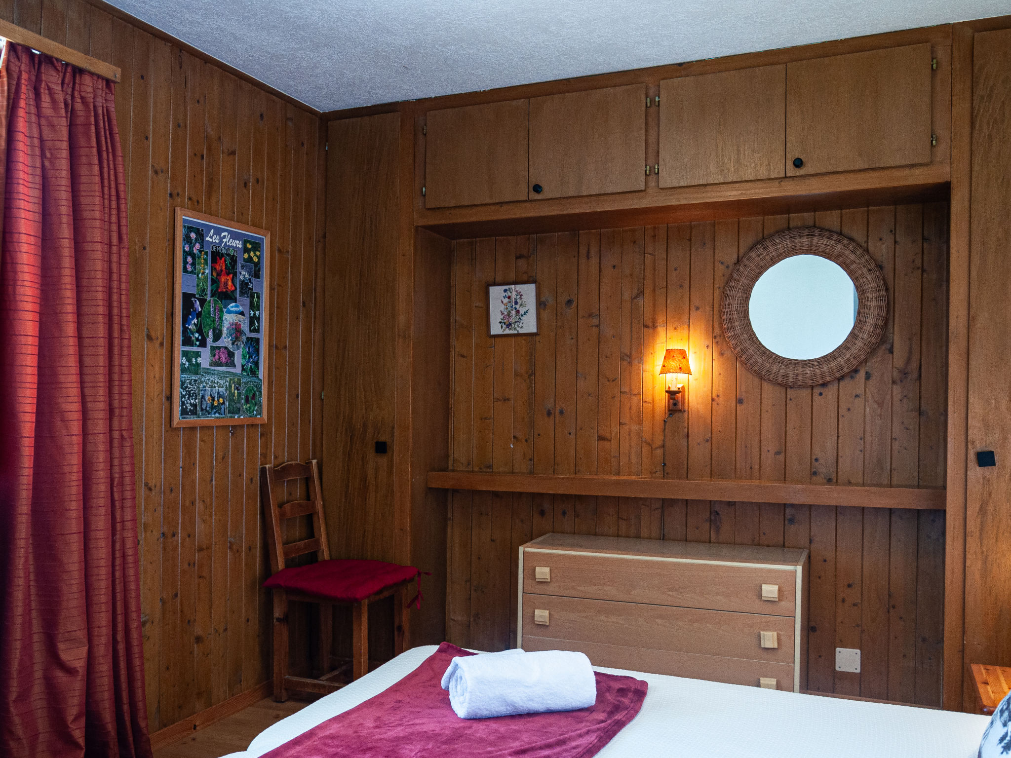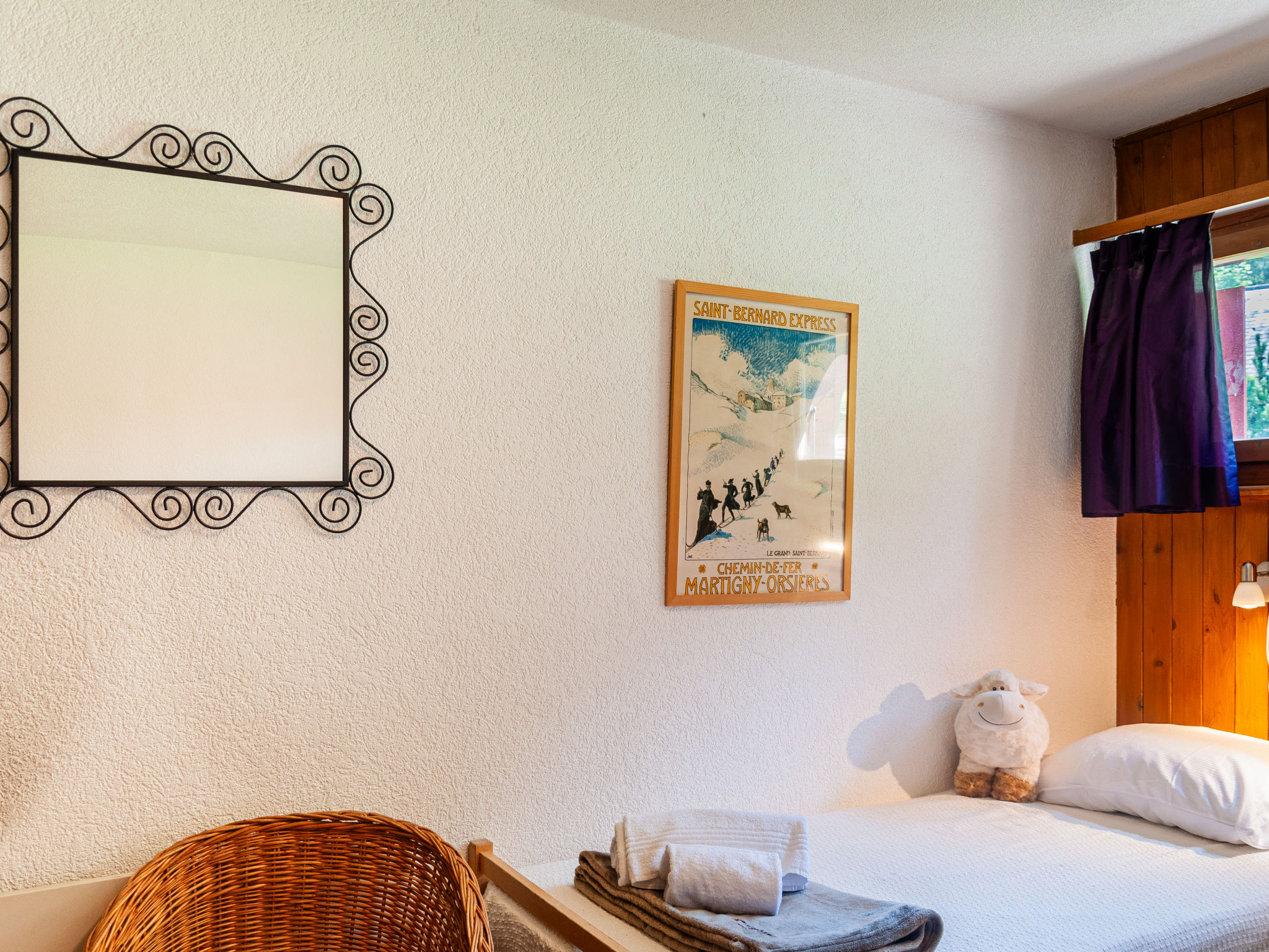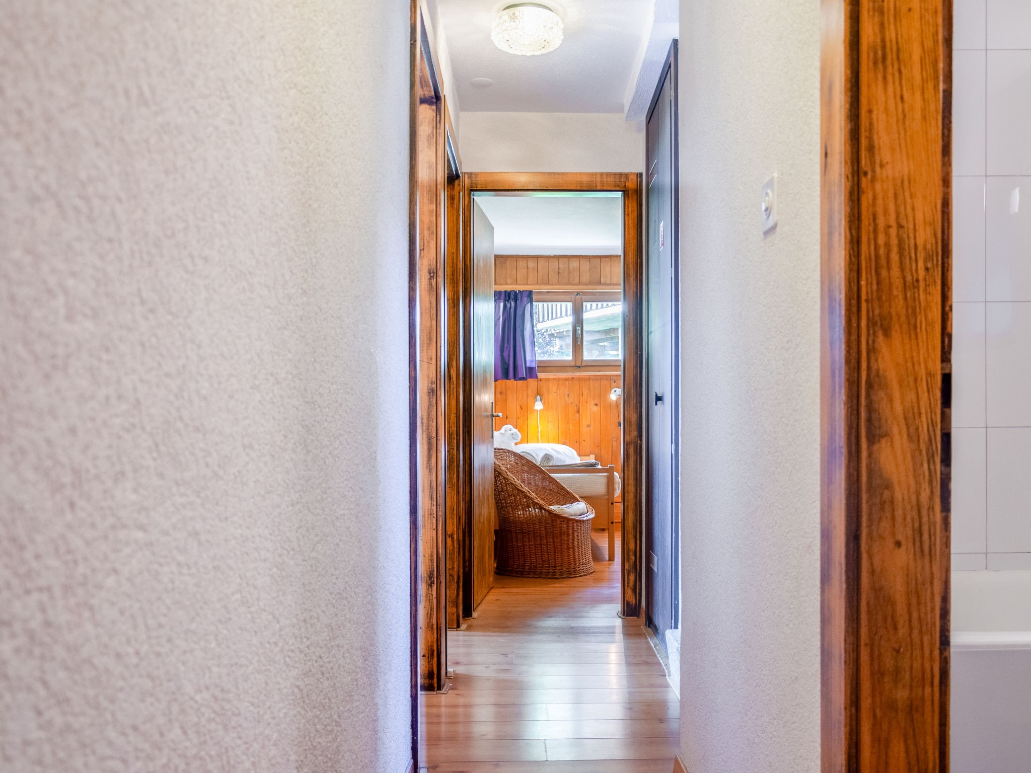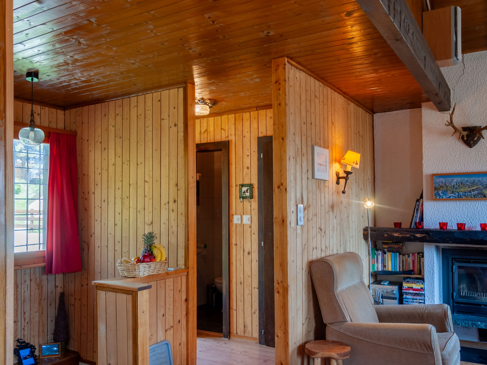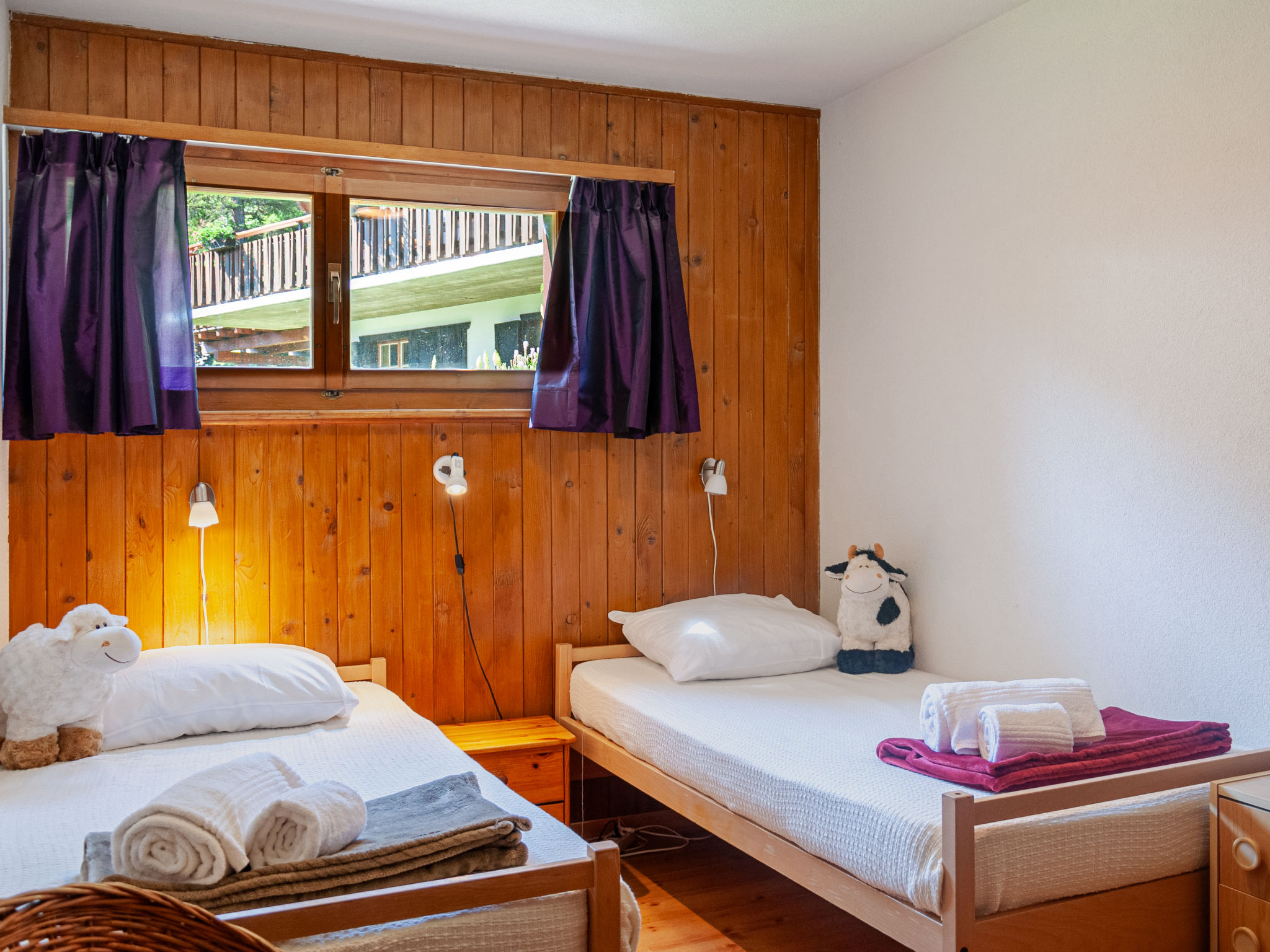 "Le Hibou", chalet 4 pièces 102 m2 sur 2 niveaux. Séjour/salle à manger avec cheminée, TV (satellite), TV (câblée), chaîne stéréo et DVD. Sortie sur la terrasse. Cuisine ouverte (four, lave-vaisselle, grille-pain, bouilloire électrique, micro-ondes, cafetière électrique, Capsules pour machine à café (Nespresso) (NON INCLUSES), appareil à raclette, service à fondue (fondue chinoise, fondue au fromage)). Douche, WC séparé. Chauffage électrique. À l'étage inférieur: 3 chambres, chaque chambre avec: 2 lits (90 cm, longueur 190 cm). Bain/WC. Balcon, situation est, grande terrasse 20 m2, situation nord et situation ouest, petit jardinet, situation sud et situation ouest. Meubles de terrasse, barbecue (portable). Belle vue sur les montagnes et la vallée. A disposition: lave-linge, sèche-linge, lit bébé. Internet (Connexion WIFI, gratuit). Place de parking (2 Voitures). Veuillez noter: logement non-fumeur. Maximum 1 animal/ chien autorisé.