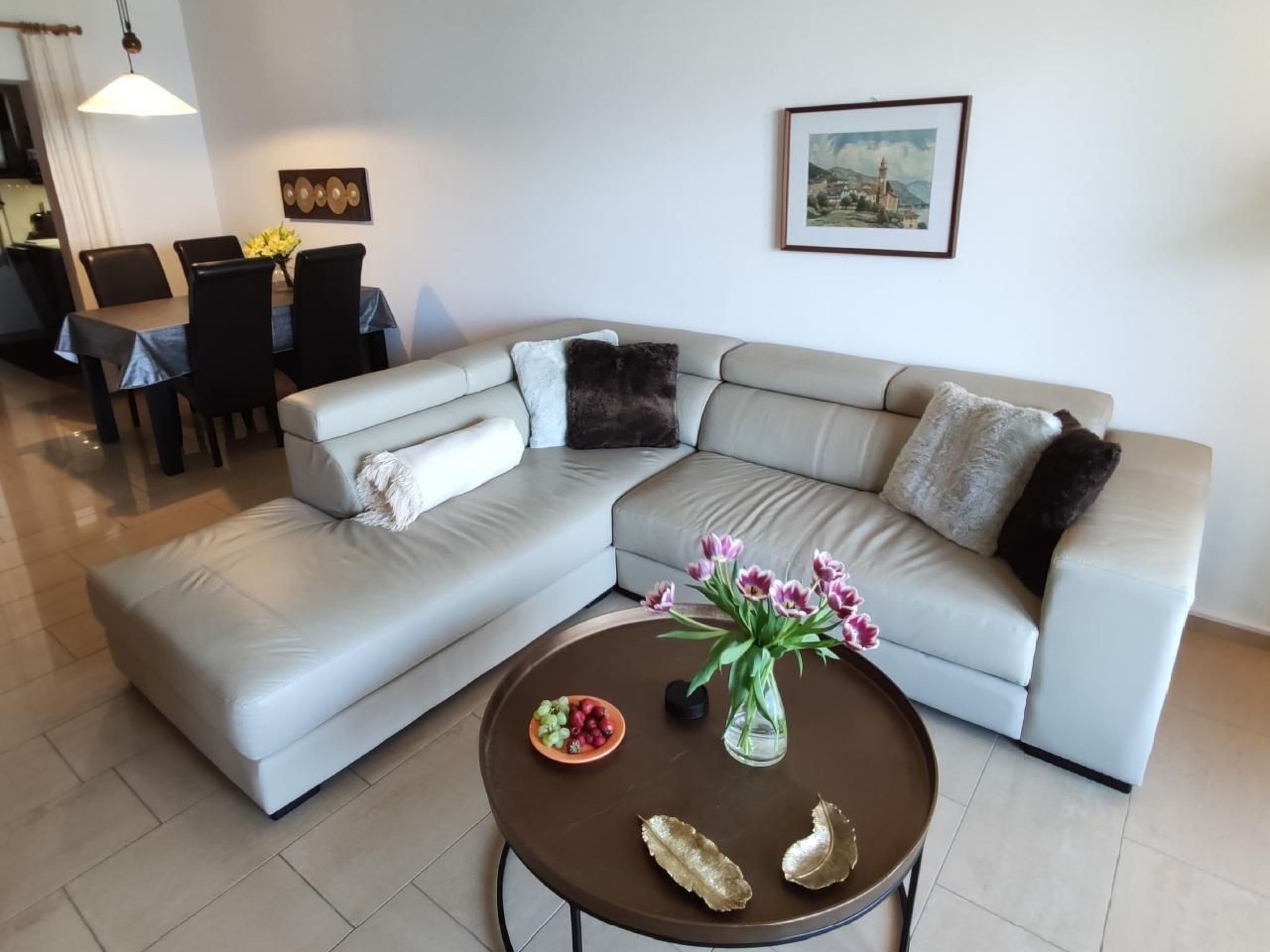 L'appartement de 65 m2 peut accueillir quatre personnes au maximum. L'aménagement séduit par une combinaison de meubles originaux et modernes dans des tons bruns chauds. Que vous vous asseyiez sur les confortables chaises à dossier haut près de la table, que vous vous détendiez confortablement sur le canapé en cuir ou que vous admiriez le panorama à l'extérieur sur le grand balcon - dans les pièces inondées de lumière, vous laisserez très vite le quotidien derrière vous.