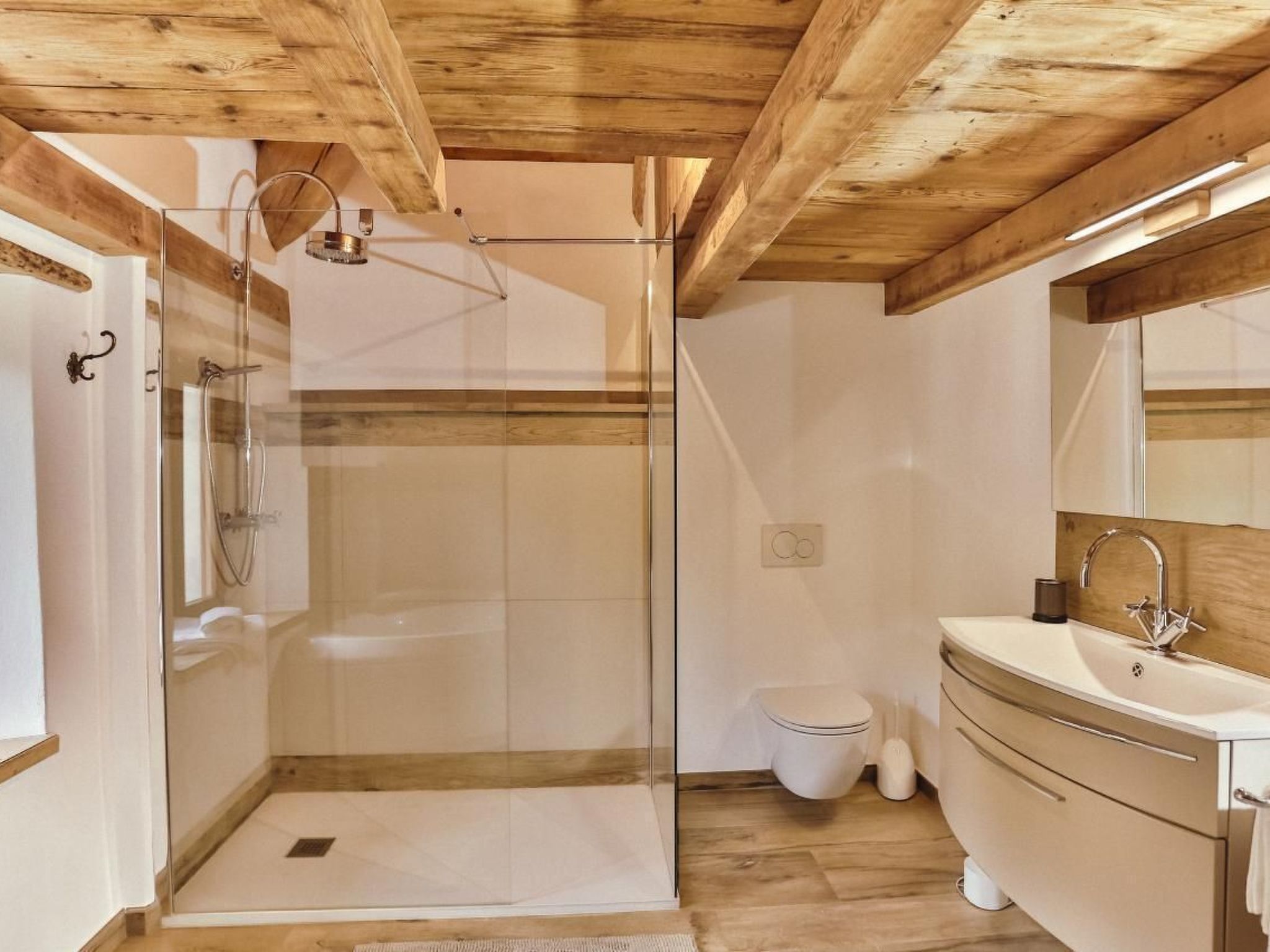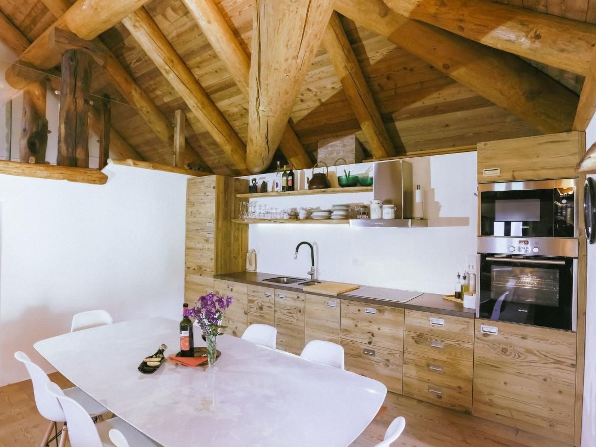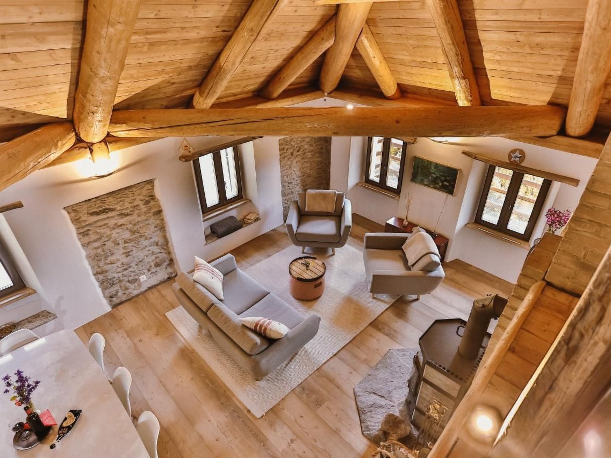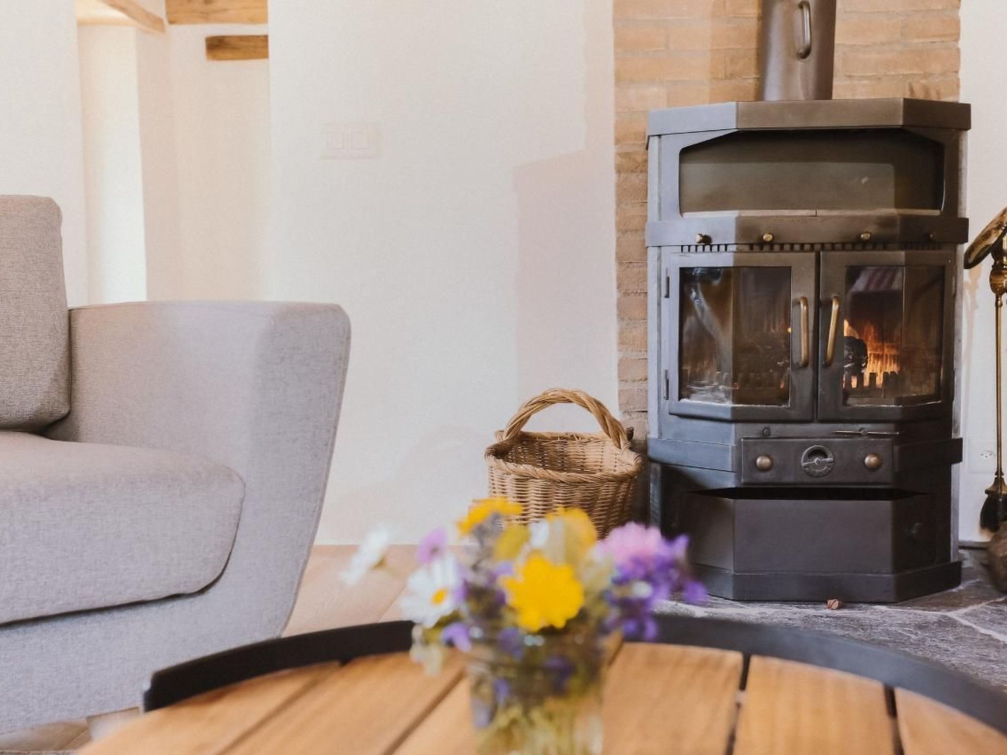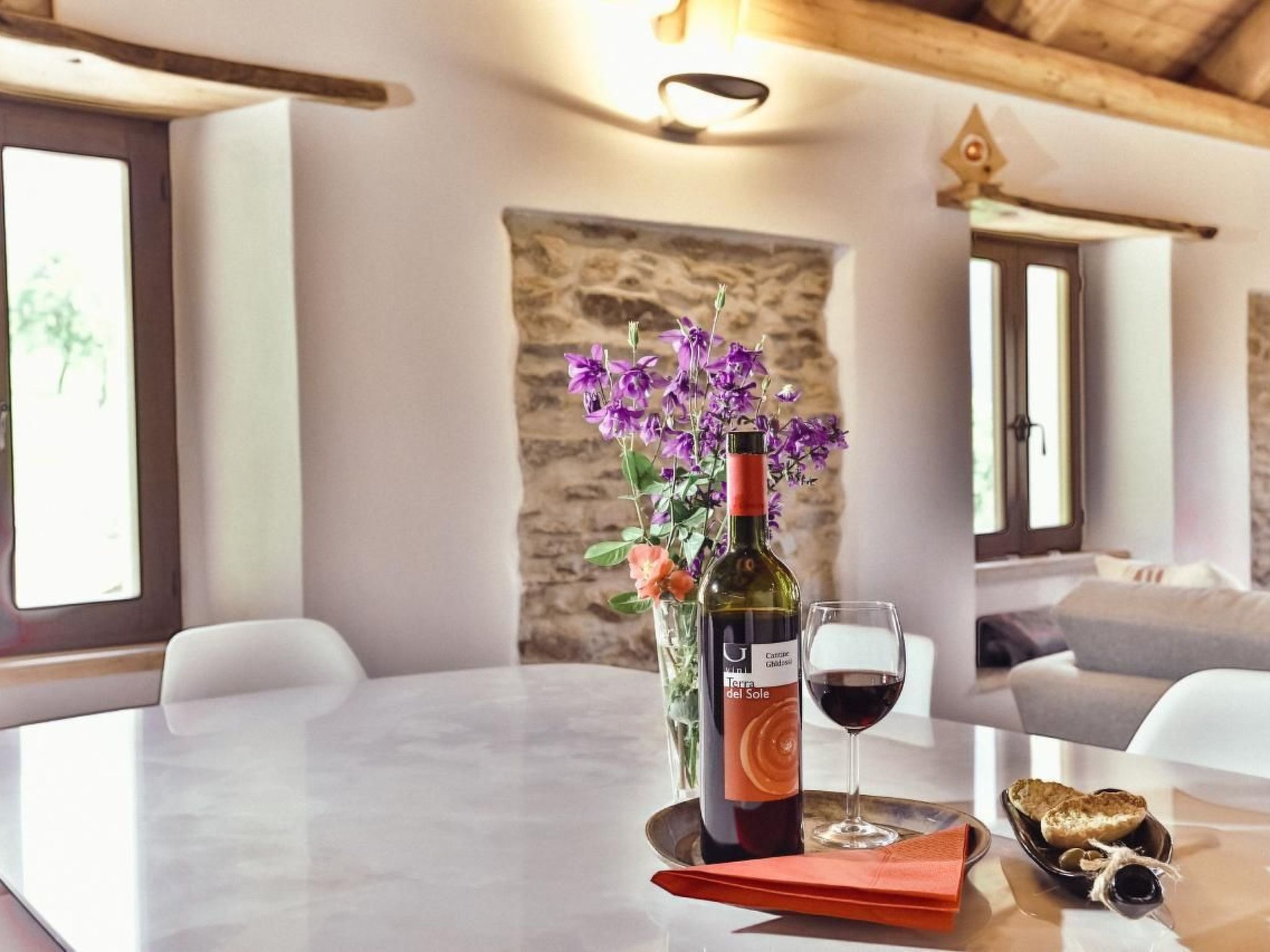 The attic welcomes its guests in spacious, light-filled rooms and is characterised by the skilful integration of ancient elements (massive stone walls, exposed beams, restored doors and details) with modern comforts (open kitchen, fireplace stove, bathtub with hydromassage and experience shower). Even the furnishings are a blend of the traditional and the contemporary: refined and functional at the same time to allow guests to fully enjoy the special energy that the house releases.