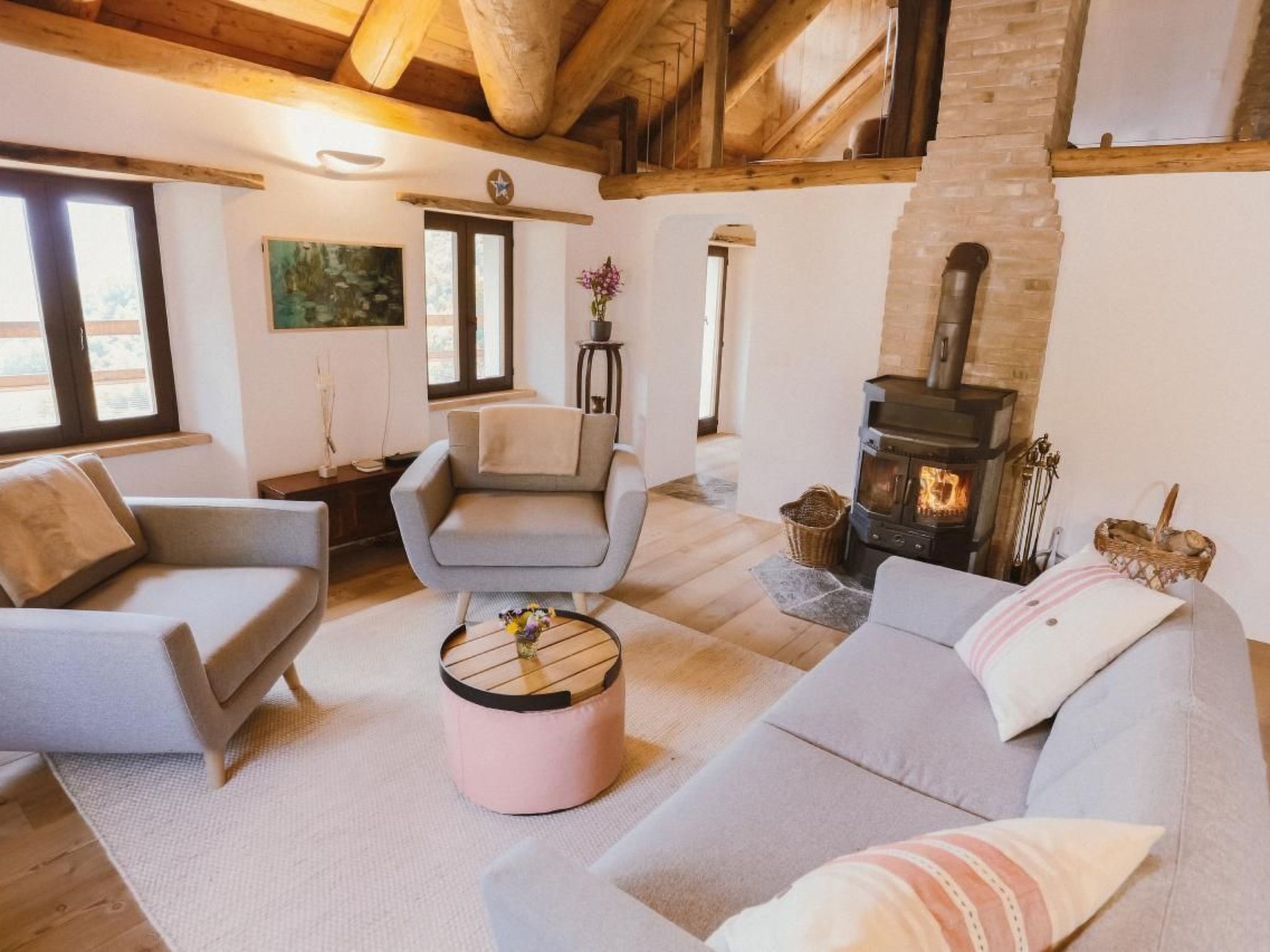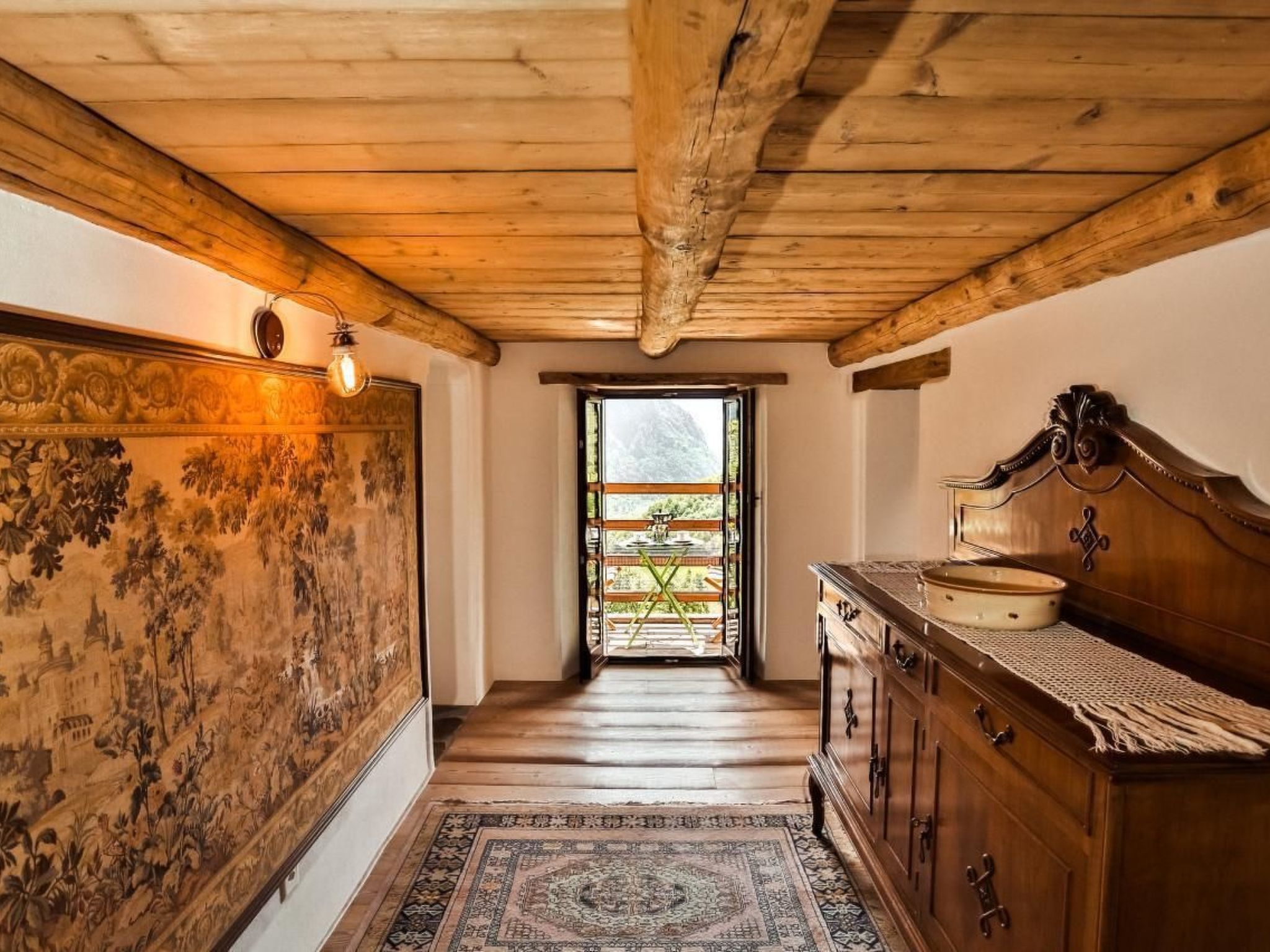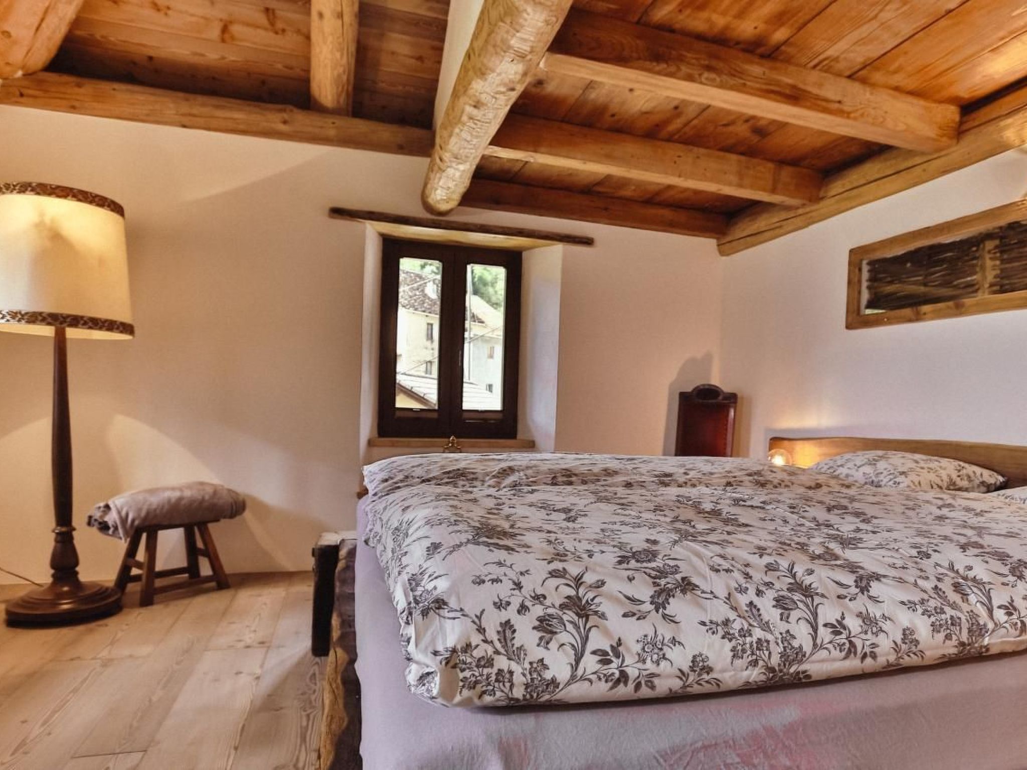 The layout is structured on two levels with an important open loft in the centre connected by an antique granite staircase. The first level houses the solid wood kitchen, the spacious living room, the master bedroom and the bathroom with a separate additional WC. The second level houses a large loft used as a reading room and a special attic room with a round bed, a third extra bed and a view of the starry sky thanks to two special ceiling windows. The flat also has an external balcony (typical period terrace) for exclusive use with a magnificent view of the panorama and the surrounding mountains. The building's ancient vaulted cellars are also accessible and offer the possibility of serving some local delicacies (cheeses, wines, etc.). From here it is possible to reach and enjoy the common garden of the house.