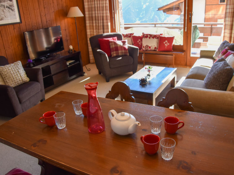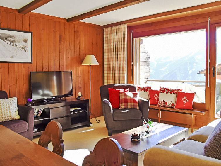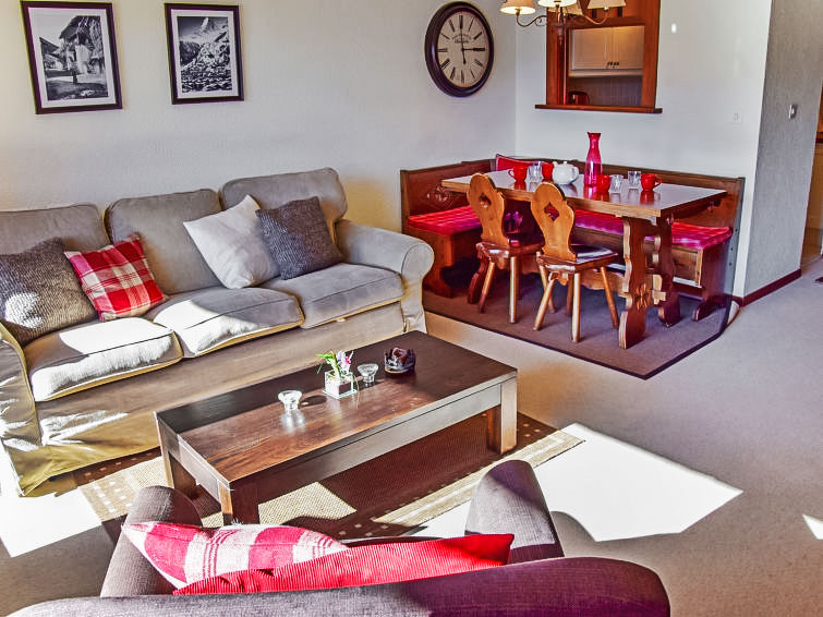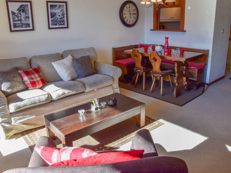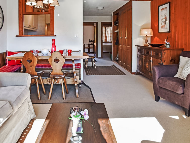 "Mondzeu b260", apt 3 pièces 60 m2 au 2ème étage. Rénové, aménagement confortable et agréable: séjour/salle à manger avec TV (câblée). Sortie sur le balcon. 1 chambre avec 1 grand-lit (1 x 160 cm, longueur 200 cm). 1 chambre avec 2 lits (90 cm, longueur 190 cm). Coin cuisine (lave-vaisselle, 4 plaques à induction, grille-pain, bouilloire électrique, congélateur, cafetière électrique, Capsules pour machine à café (Nespresso) (NON INCLUSES), service à fondue (fondue chinoise, fondue au fromage)). Salle de bains. Petit balcon. Mobilier de balcon. Très belle vue sur les montagnes et la vallée. A disposition: sèche-cheveux. Internet (Connexion WIFI, gratuit). Place de parking No B260 (couvert). Veuillez noter: logement non-fumeur.