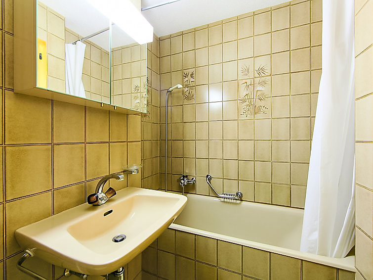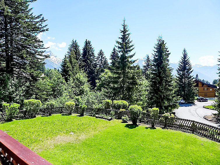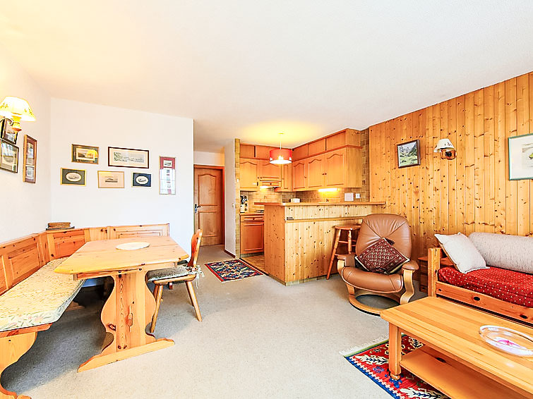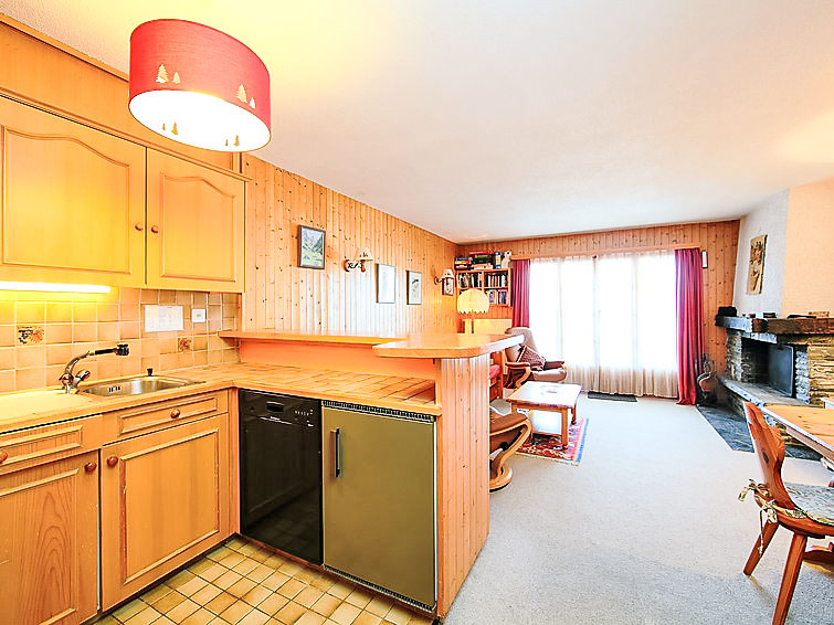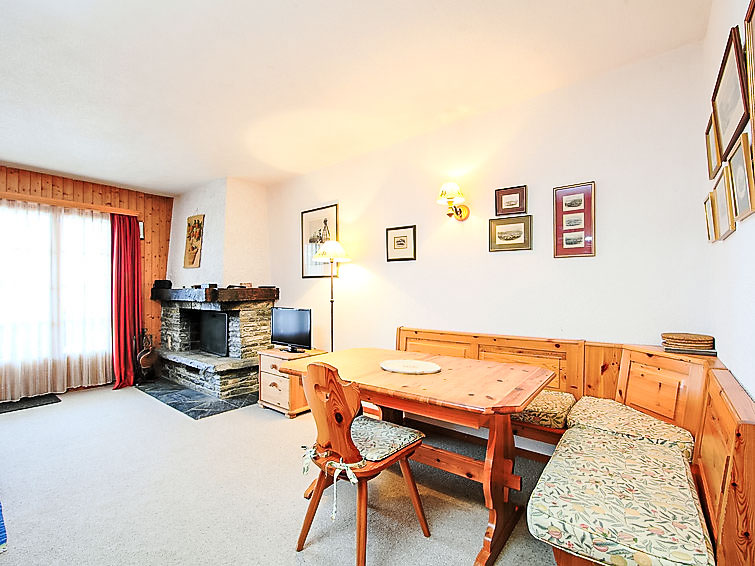 "Sapin Bleu 6", apt 2 pièces 60 m2 au 1er étage, situation sud. Aménagement agréable et plaisant: séjour/salle à manger avec 1 lit gigogne (2 x 80 cm), cheminée et TV (satellite) (écran plat), lecteur CD. Sortie sur le balcon. 1 chambre avec 2 lits. Cuisine ouverte (4 plaques de cuisson, four, lave-vaisselle, grille-pain, bouilloire électrique, micro-ondes, cafetière électrique, appareil à raclette, service à fondue (fondue au fromage)). Bain/WC. Petit balcon 10 m2, situation sud. Très belle vue panoramique sur les montagnes. A disposition: sèche-cheveux. Internet (Connexion WIFI, gratuit). Lecteur Blu-ray. Garage No 6, hauteur 200 cm, largeur 470 cm.