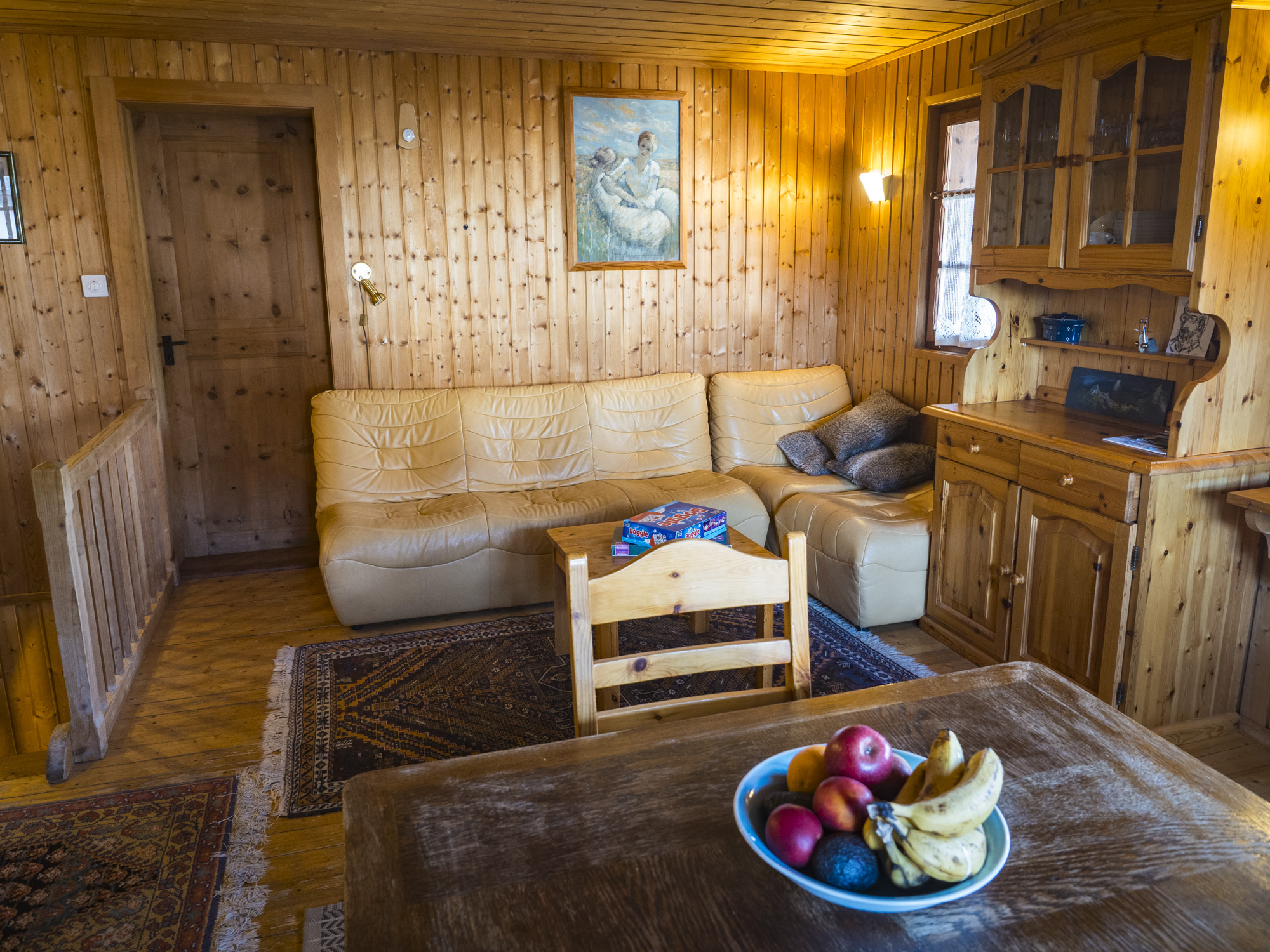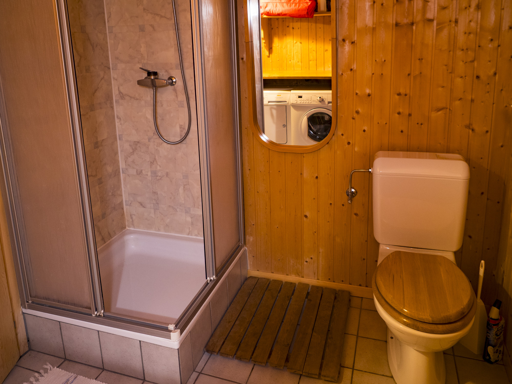 Extérieur : appartement sur 2 étages dans un chalet, pour 8 personnes, balcon avec mobilier de jardin. -Intérieur : 96 m2, hall d'entrée, séjour avec poêle à bois, coin à manger. -Chambres : 2 chambres avec 1 lit double, 2 chambres avec 1 lit simple, 1 chambre avec lit superposé (2 personnes). -Sanitaires : 1 salle de bains avec baignoire (dans l'une des chambres doubles), 1 salle de bains avec douche et WC, 1 WC séparé. -Cuisine : ouverte, cuisinière électrique, four, lave-vaisselle, réfrigérateur. -Divers : TV câblée, Wi-fi, radio, lave-linge, sèche-linge, chauffage électrique. -