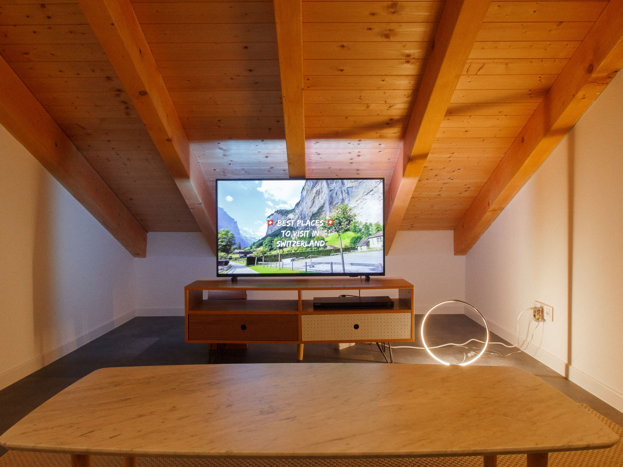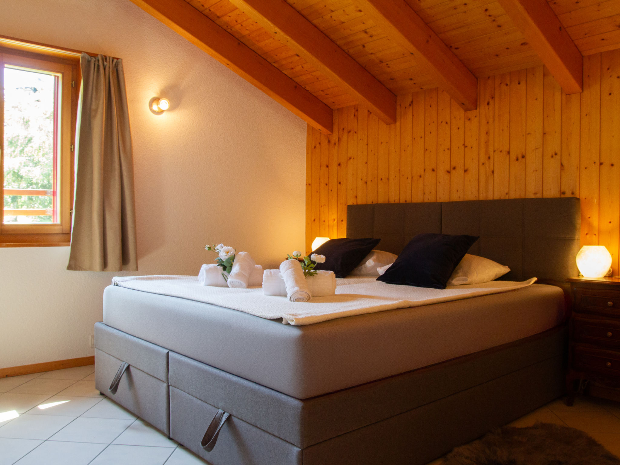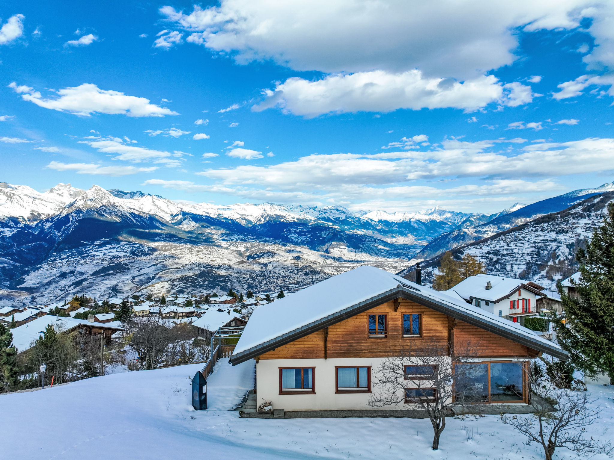 "Chalet Mirabelle", maison 5 pièces 178 m2 sur 3 niveaux, situation nord-ouest. Spacieux, aménagement confortable et agréable: entrée. Grand séjour avec table pour les repas et TV (câblée). Sortie sur la terrasse. 1 grande chambre avec 1 lit (160 cm, longueur 200 cm), douche/WC. Sortie sur la terrasse. Cuisine (four, lave-vaisselle, 4 plaques vitrocéramiques, grille-pain, bouilloire électrique, cafetière électrique, Capsules pour machine à café (Nespresso) (NON INCLUSES), appareil à raclette, service à fondue (fondue au fromage)) avec table pour les repas. WC séparé. Chauffage électrique. À l'étage inférieur: 1 chambre avec 2 lits (90 cm, longueur 200 cm). À l'étage supérieur: 1 chambre avec 2 lits (90 cm, longueur 200 cm). 1 chambre avec 2 lits (90 cm, longueur 200 cm). Salon avec TV et DVD. Bain/WC. Terrasse 21 m2, situation nord et situation ouest, jardin. Mobilier de balcon, barbecue, jardin d'hiver. Très belle vue sur les montagnes. A disposition: lave-linge, sèche-linge, sèche-cheveux. Internet (Connexion WIFI, gratuit). Place de parking (2 Voitures), garage (1 Voiture). Veuillez noter: logement non-fumeur.