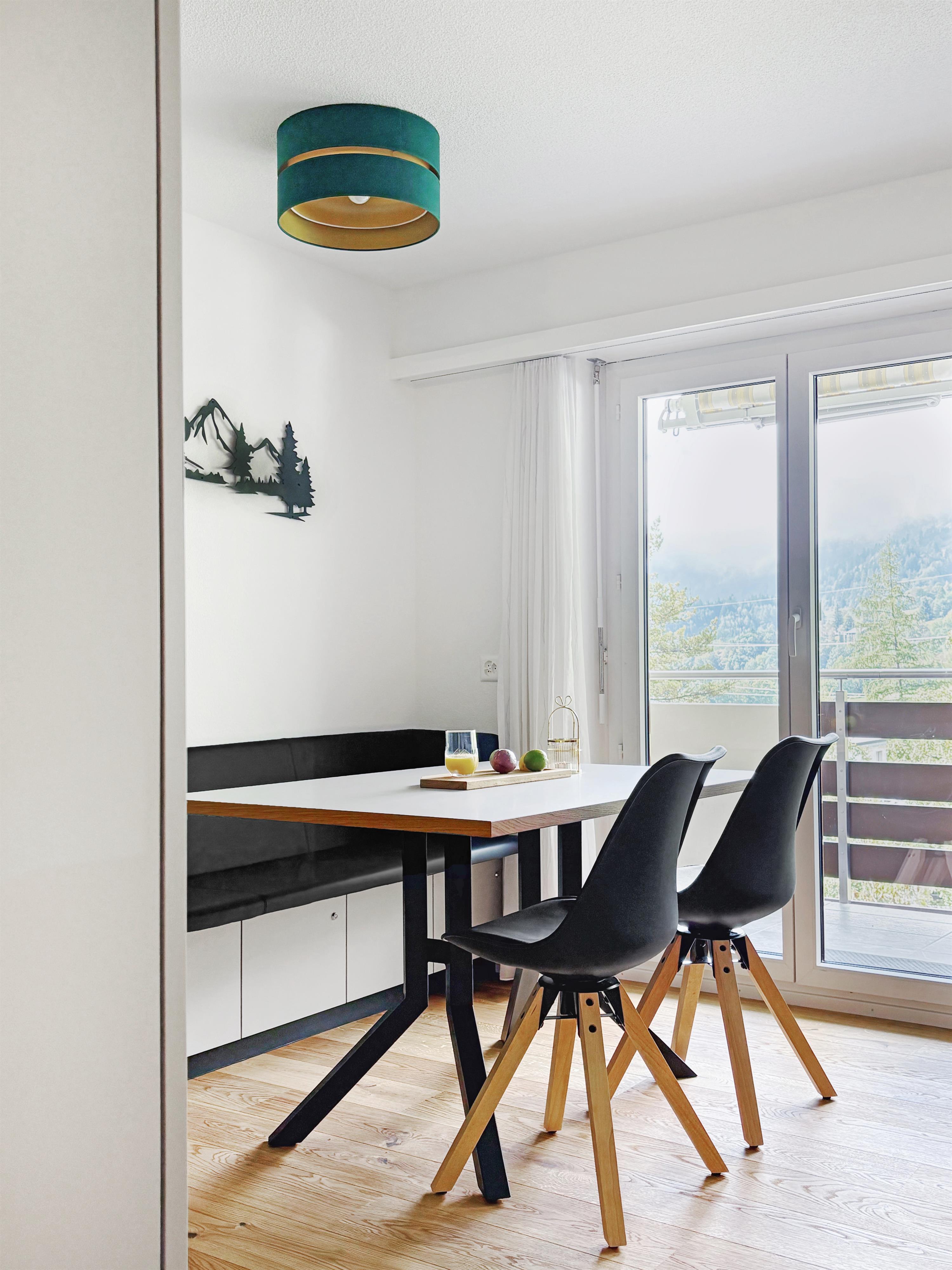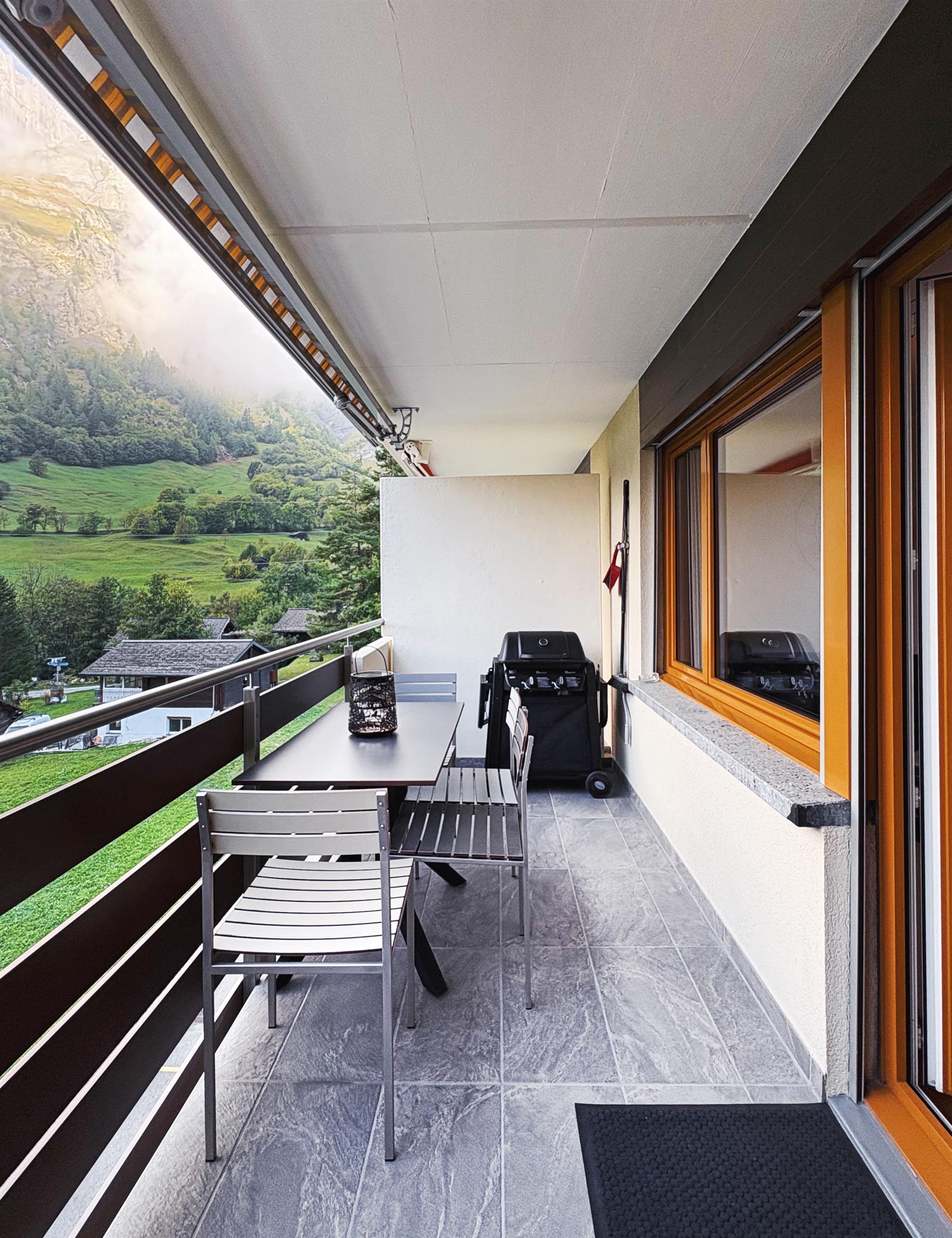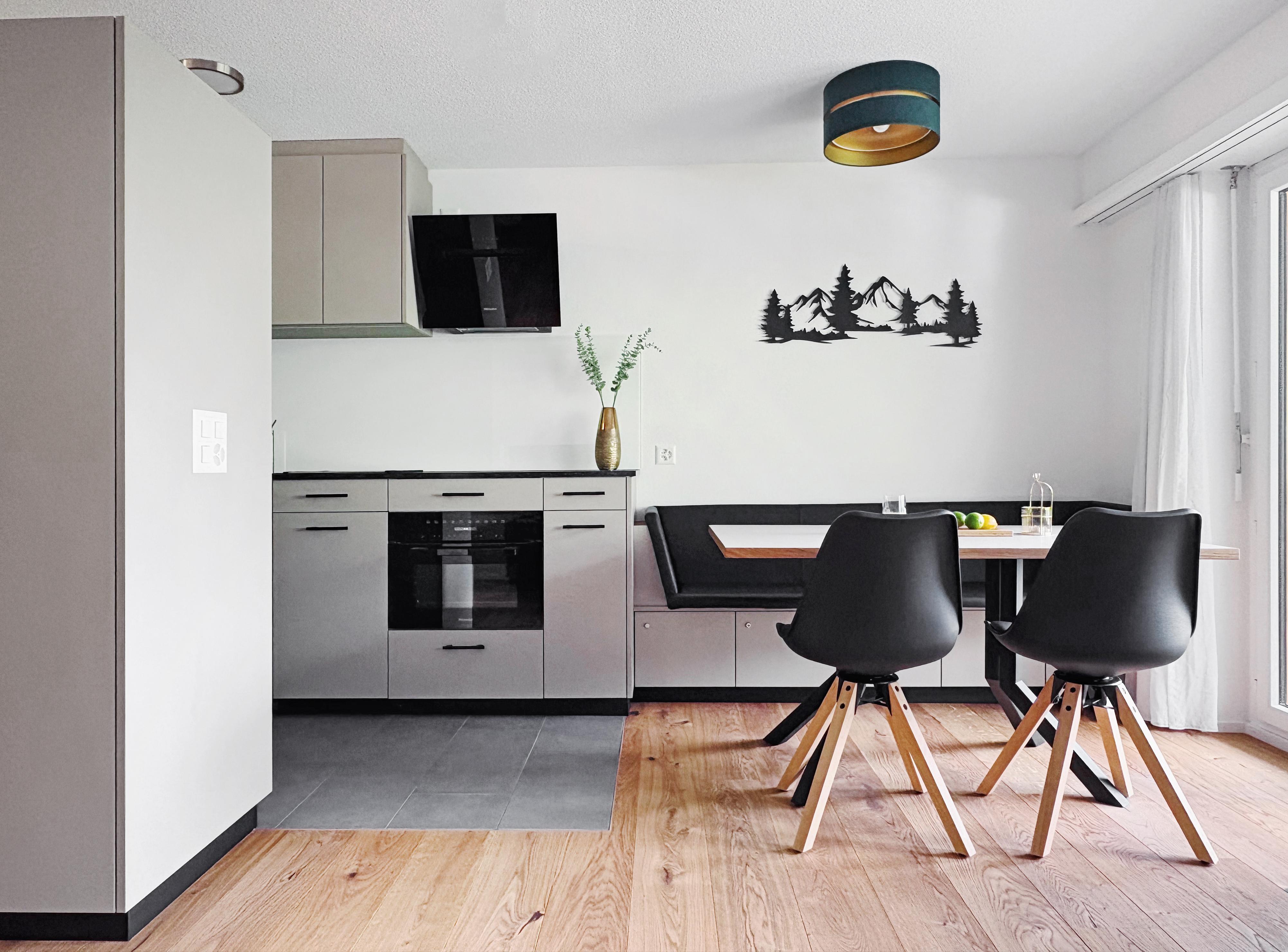 Appartement d'une pièce (2ème étage) : Salon/salle à manger/chambre à coucher avec 1 lit double, cuisine habitable ouverte avec lave-vaisselle, micro-ondes, machine à café à capsules etc., douche/WC, balcon sud avec vue sur le massif montagneux, WiFi gratuit, radio, TV. Chambre supplémentaire séparée avec un lit superposé (séparée physiquement de l'appartement), juste en face. Appartement non-fumeur ! Animaux non admis ! Une place de parc extérieure devant la maison incluse.