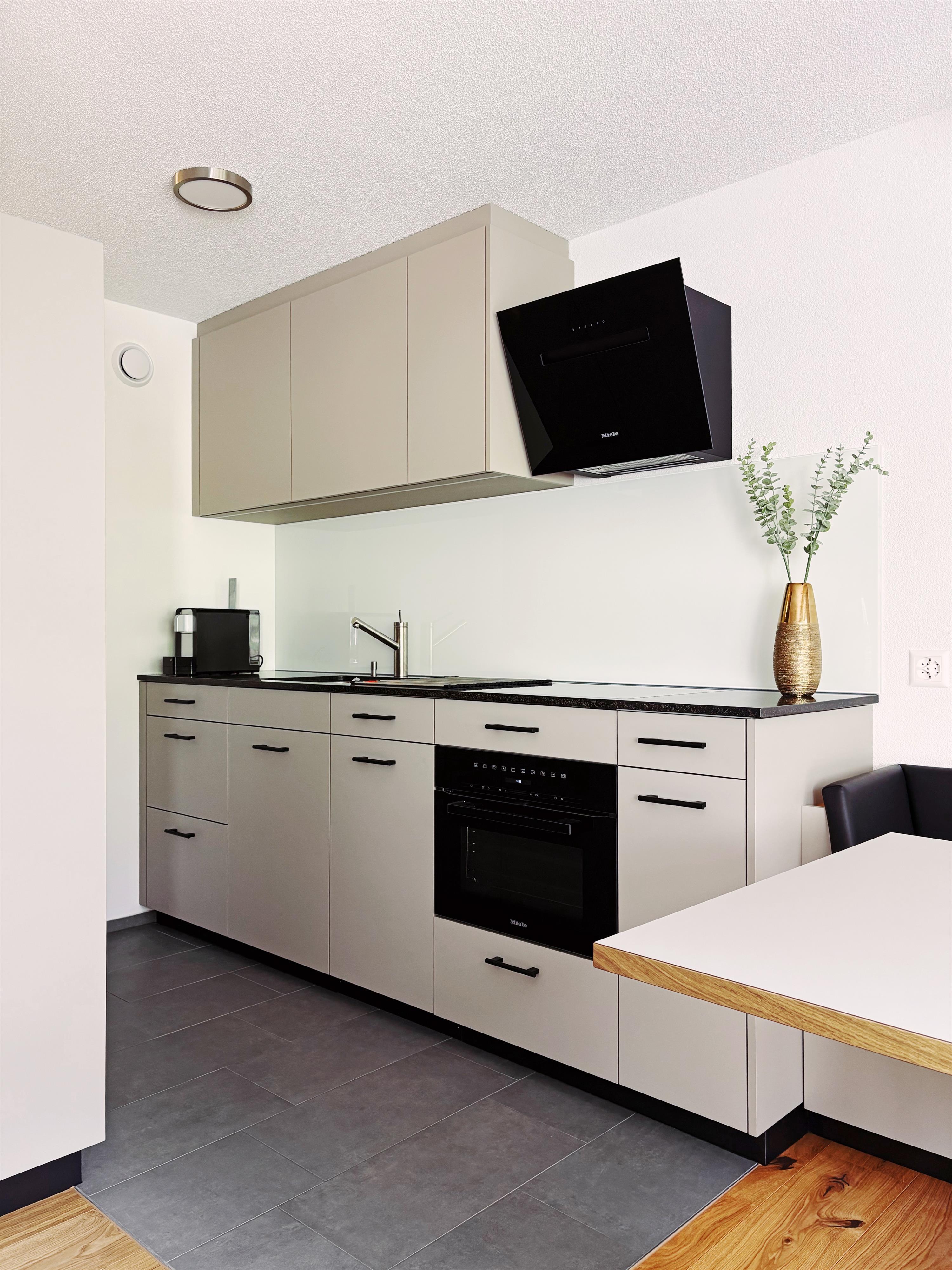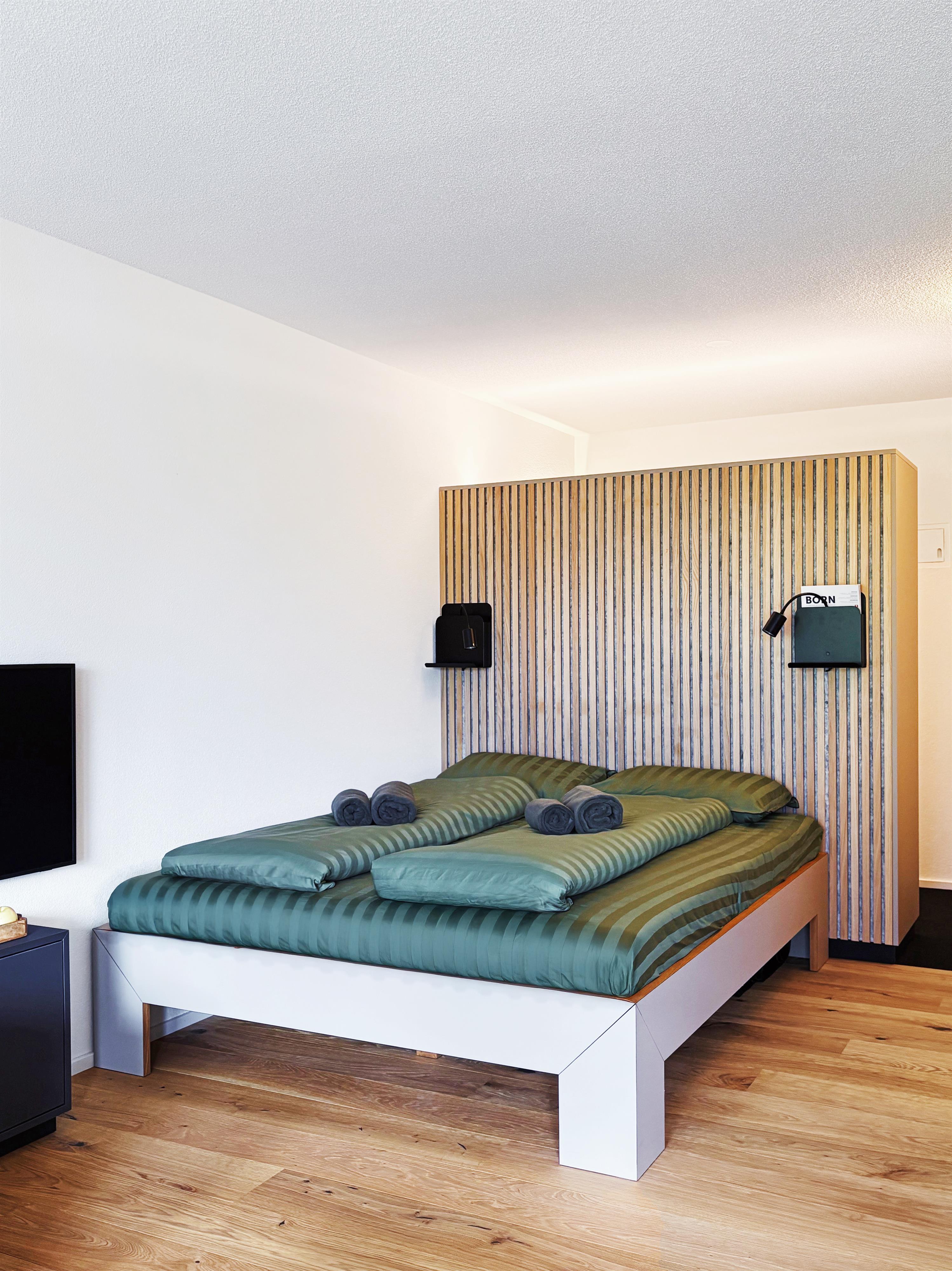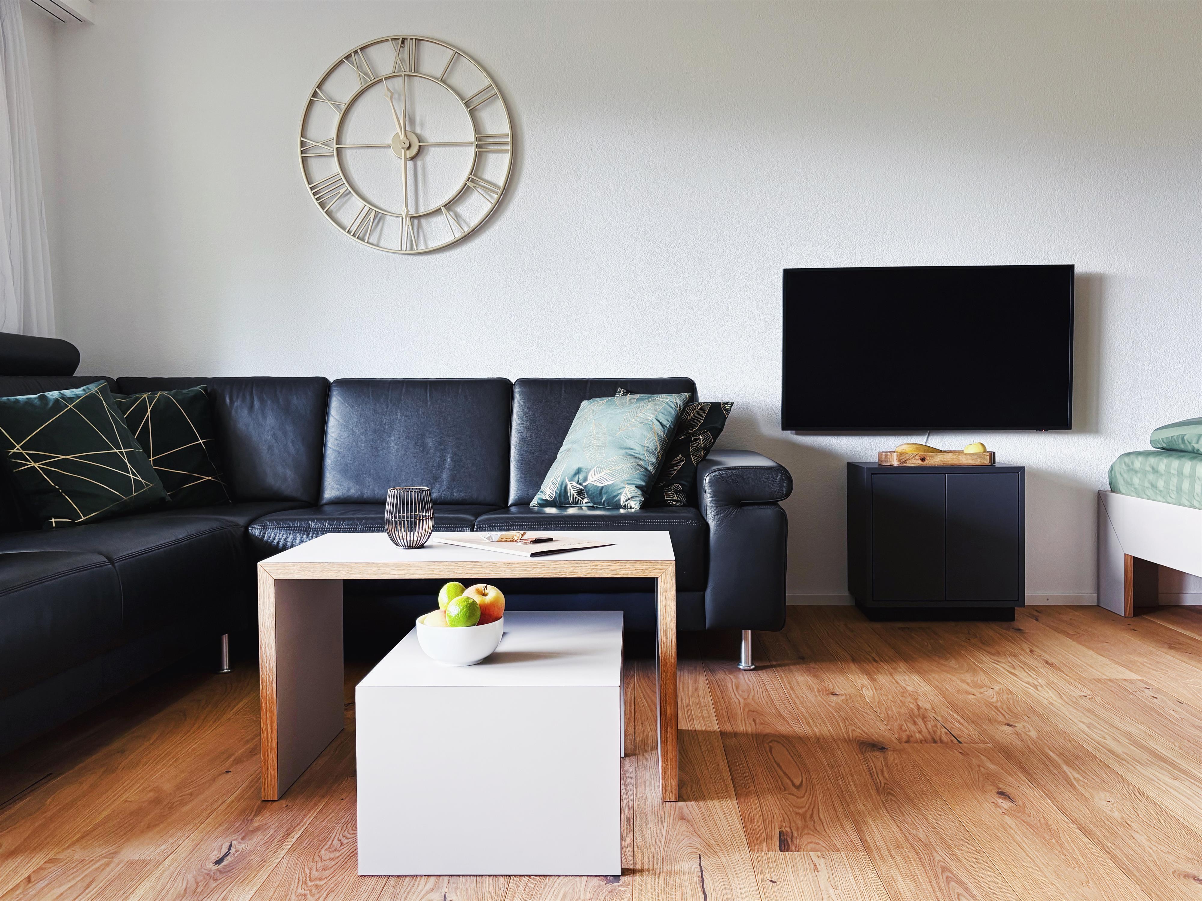 Appartement d'une pièce (2ème étage) : Salon/salle à manger/chambre à coucher avec 1 lit double, cuisine habitable ouverte avec lave-vaisselle, micro-ondes, machine à café à capsules etc., douche/WC, balcon sud avec vue sur le massif montagneux, WiFi gratuit, radio, TV. Chambre supplémentaire séparée avec un lit superposé (séparée physiquement de l'appartement), juste en face. Appartement non-fumeur ! Animaux non admis ! Une place de parc extérieure devant la maison incluse.